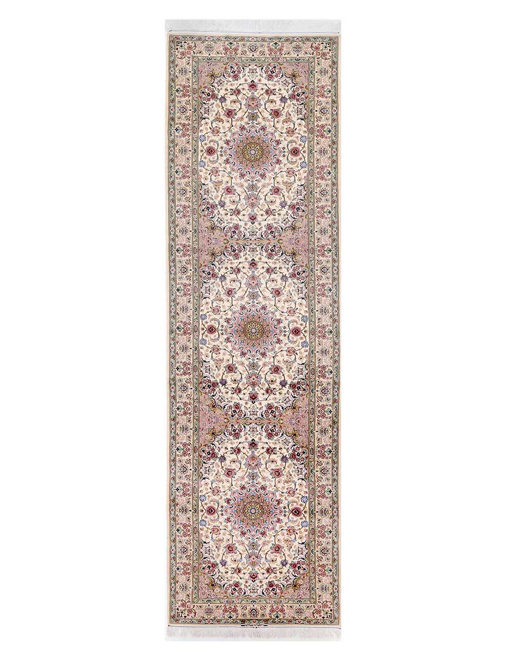 This Isfahan rugs is made with exceptionally good quality of corker wool & silk. with traditional motifs inspired by architectural tiles that once decorated the historical buildings from which these rugs originated in Isfahan. When it comes to high class designs the composition, patterns, and materials of Isfahan meets those expectations. The motifs usually consist of medallions with palmetts and also figural motifs. Isfahan rugs have an extremely high knot density and are woven with silk and golden threads, which give them their luxurious look.this runner is Signed By Sajadi