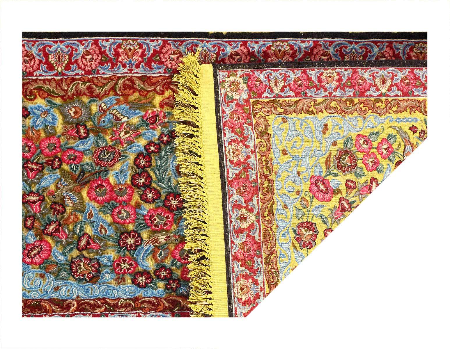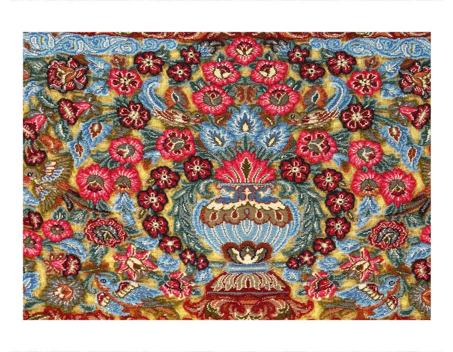 Silk can be spun into extremely fine, strong threads that can be dyed to create colors that have an almost electric glow. Souf carpets have areas of both flat weave and pile weave, showing the exceptional skill of the Isfahan weavers. The design is embossed and can be felt with the hand. The designs of Souf carpets are breathtaking, as you can see from this example.