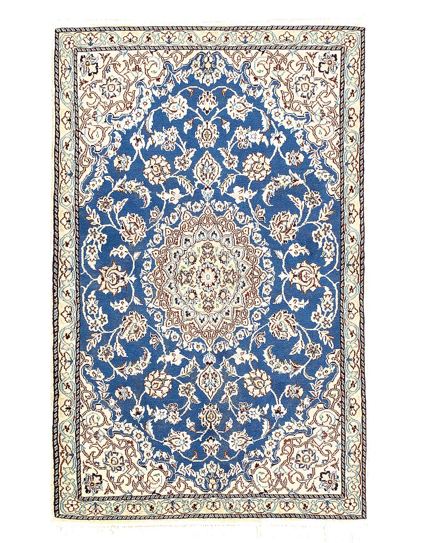 Persian Nain rugs are renowned for their detail and fine use of outlining along the central motifs. Breaking from the classical style of many vintage rugs produced around central Iran, Persian Nain rugs became renowned for their modern appeal and personal style, establishing the classical motifs of many other regional rugs, only through a more precise lens. In this striking piece, the precision is particularly visible along the heart of the vintage Persian rug, where the attention to detail allows each individual color to stand out as a unique part of the whole. The surrounding borders help ground the masterpiece and add horizontal intrigue to the natural elements within, which are arranged vertically to establish a cascading effect.