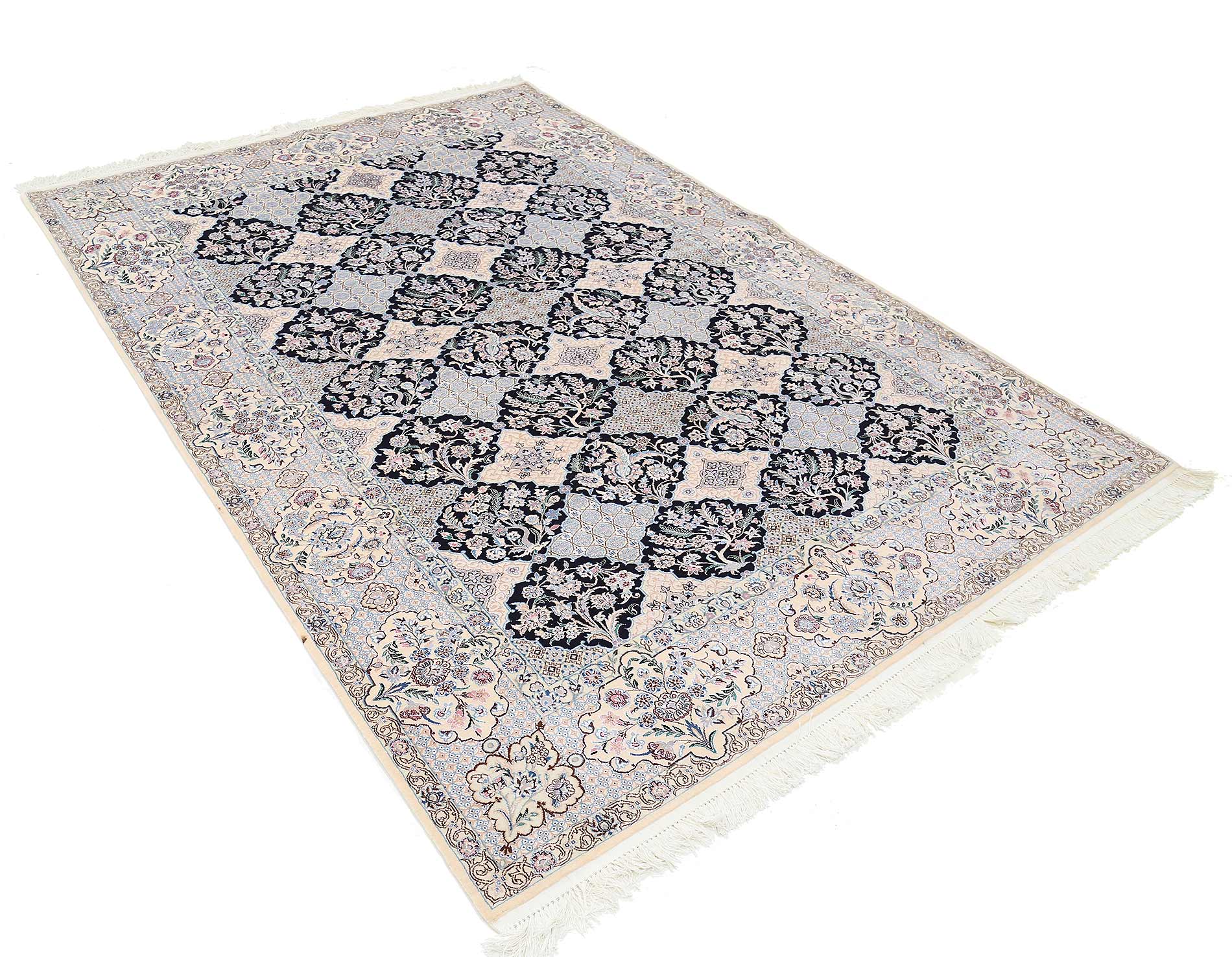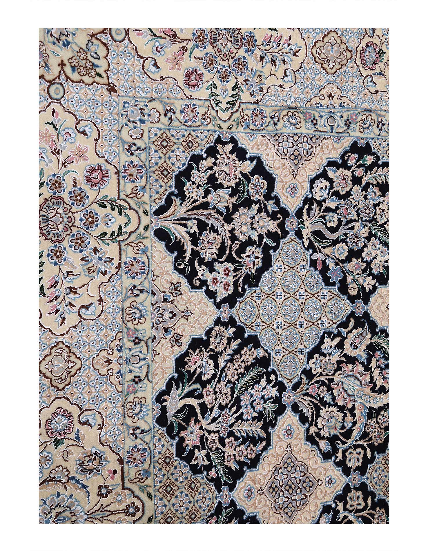 Persian Nain rugs are renowned for their detail and fine use of outlining along the central motifs. Breaking from the classical style of many vintage rugs produced around central Iran, Persian Nain rugs became renowned for their modern appeal and personal style, establishing the classical motifs of many other regional rugs, only through a more precise lens. In this striking piece, the precision is particularly visible along the heart of the vintage Persian rug, where the attention to detail allows each individual color to stand out as a unique part of the whole. The surrounding borders help ground the masterpiece and add horizontal intrigue to the natural elements within, which are arranged vertically to establish a cascading effect.singed by Habibian