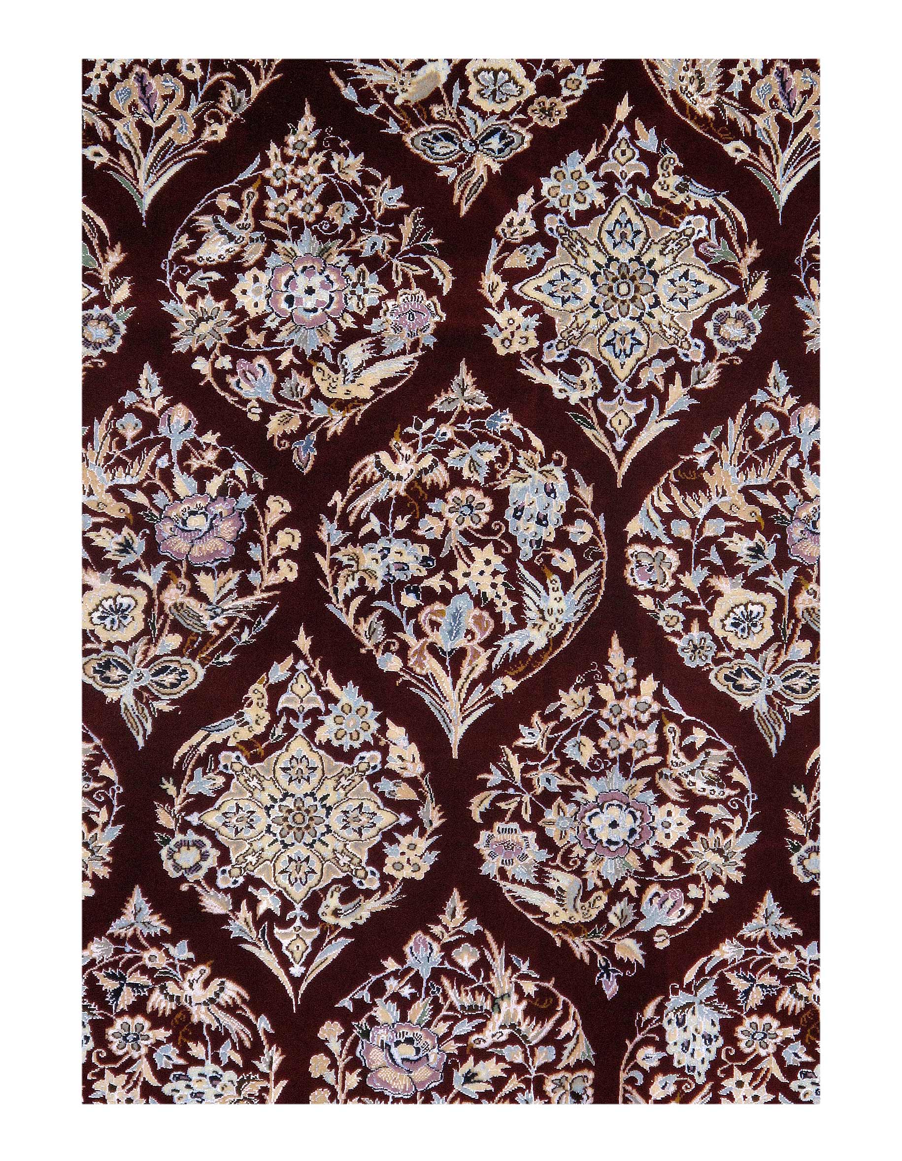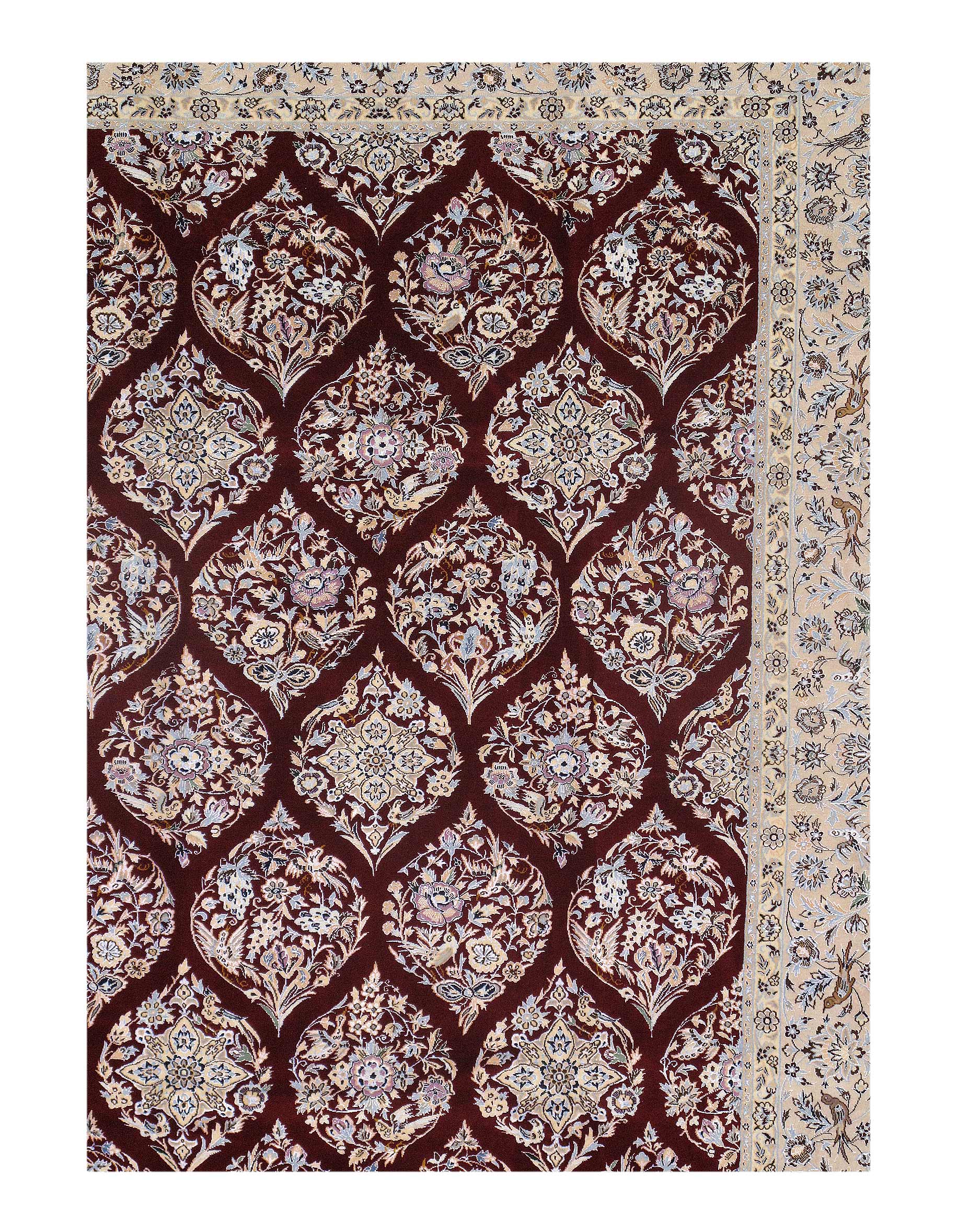 Beautiful hand-knotted Nain rug made from wool and silk. Nain is a small village located in central Iran that has relatively recently become a renowned center for carpet weaving. Production began here in the 1930s. Although Nain rugs are not as old as many of the traditional Persian rugs, they retain their value in terms of construction. They are also exquisite in design due to their use of silk in weaving both the foundation and fine pile of many rugs from the area.