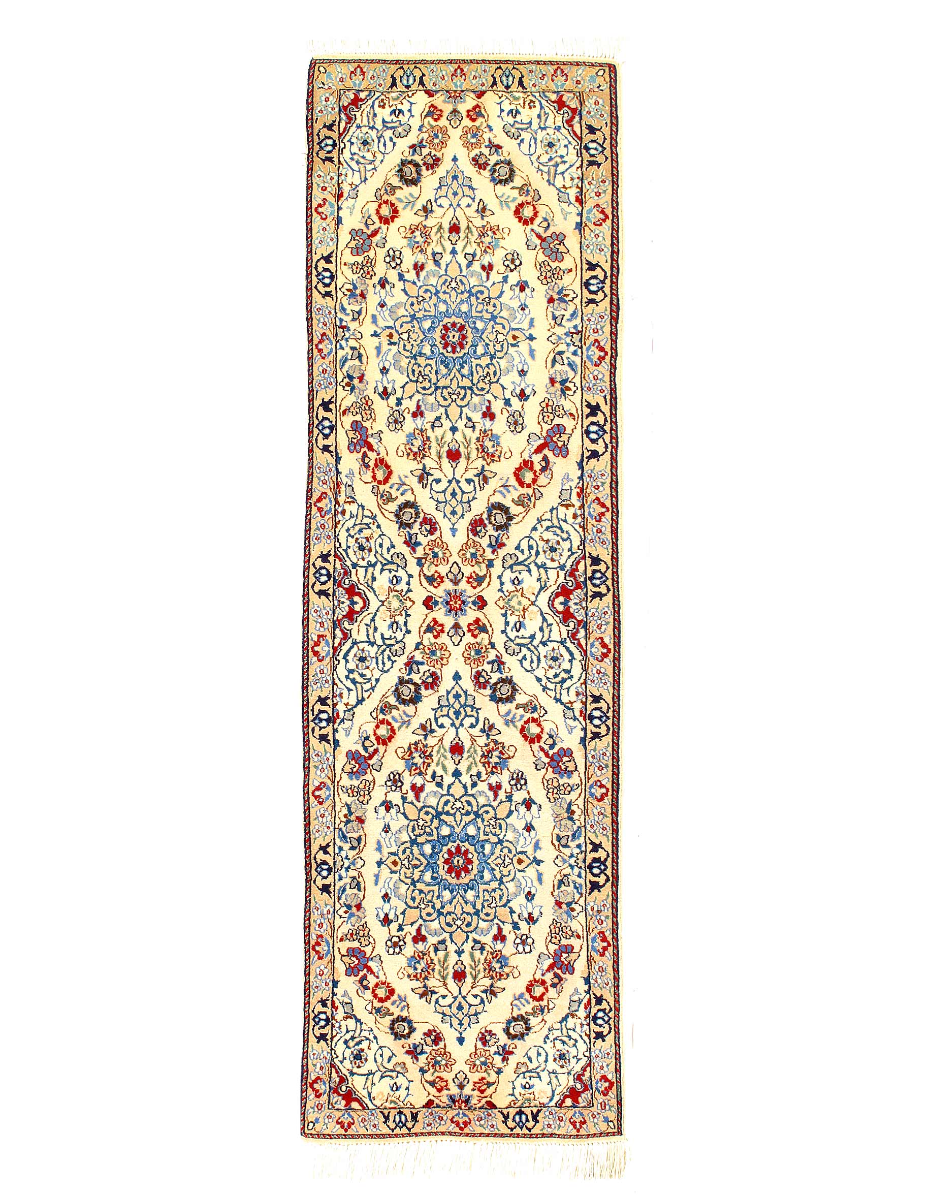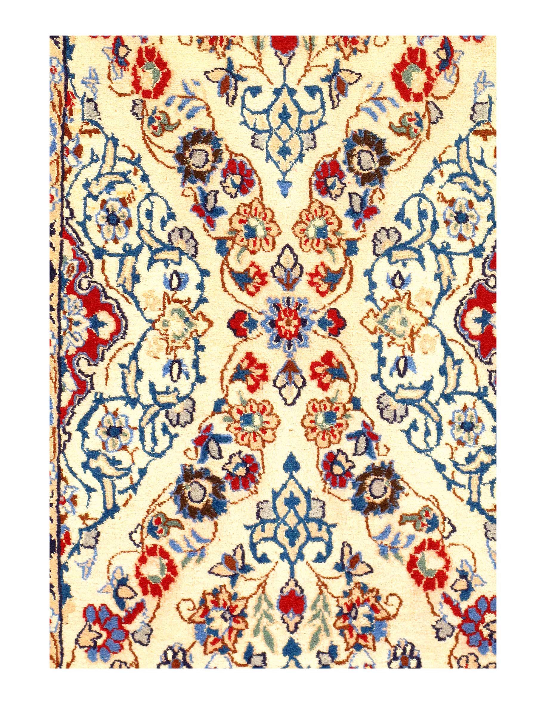 Persian Nain rugs are renowned for their detail and fine use of outlining along the central motifs. Breaking from the classical style of many vintage rugs produced around central Iran, Persian Nain rugs became renowned for their modern appeal and personal style, establishing the classical motifs of many other regional rugs, only through a more precise lens. In this striking piece, the precision is particularly visible along the heart of the vintage Persian rug, where the attention to detail allows each individual color to stand out as a unique part of the whole. The surrounding borders help ground the masterpiece and add horizontal intrigue to the natural elements within, which are arranged vertically to establish a cascading effect.