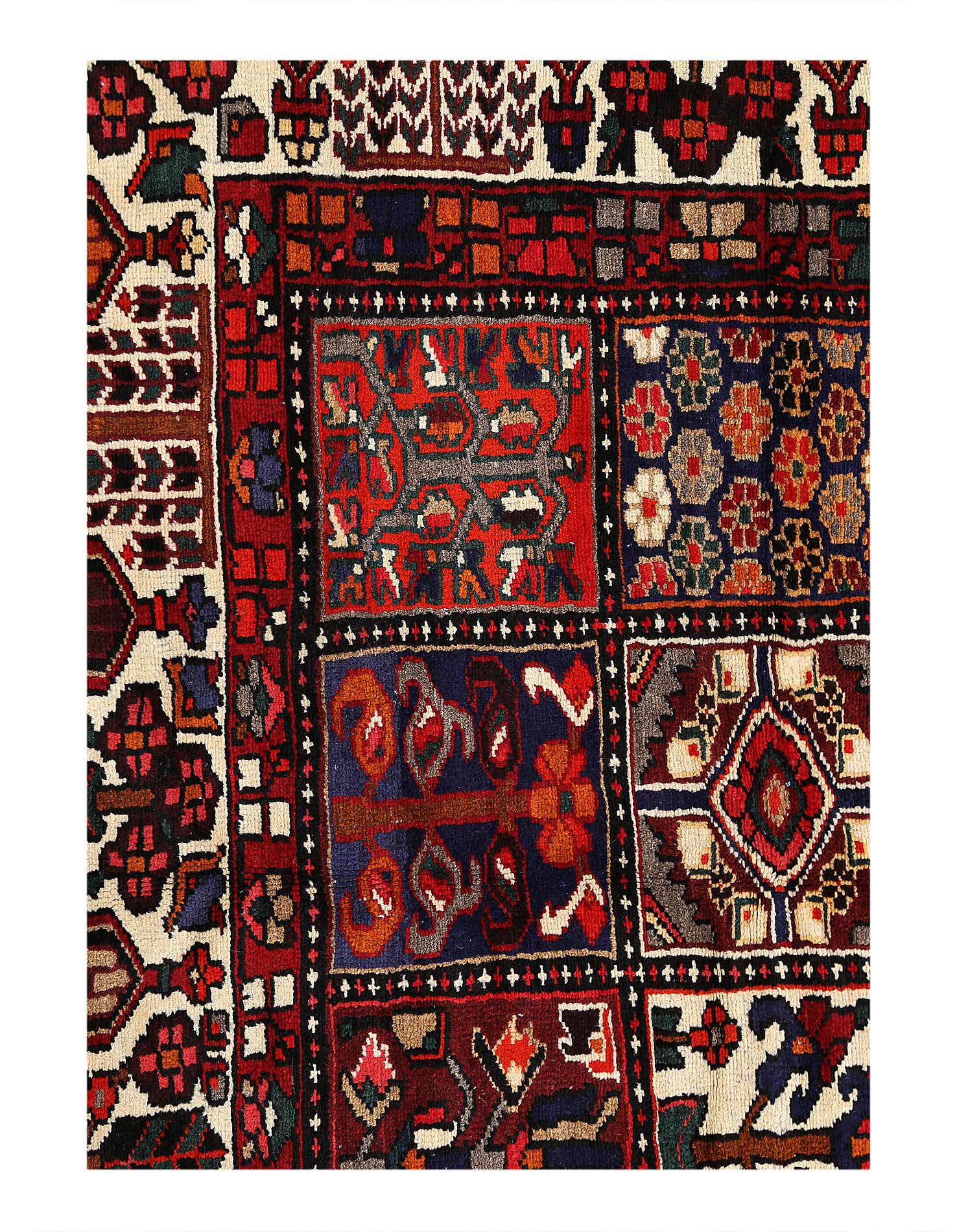 Offered is a gorgeous Persian Bakhtiari area rug. The luxurious hand-knotted pile is made from very fine lamb's wool and features a traditional Bakhtiari motif throughout. Handmade hand-knotted lamb's wool on a cotton foundation.