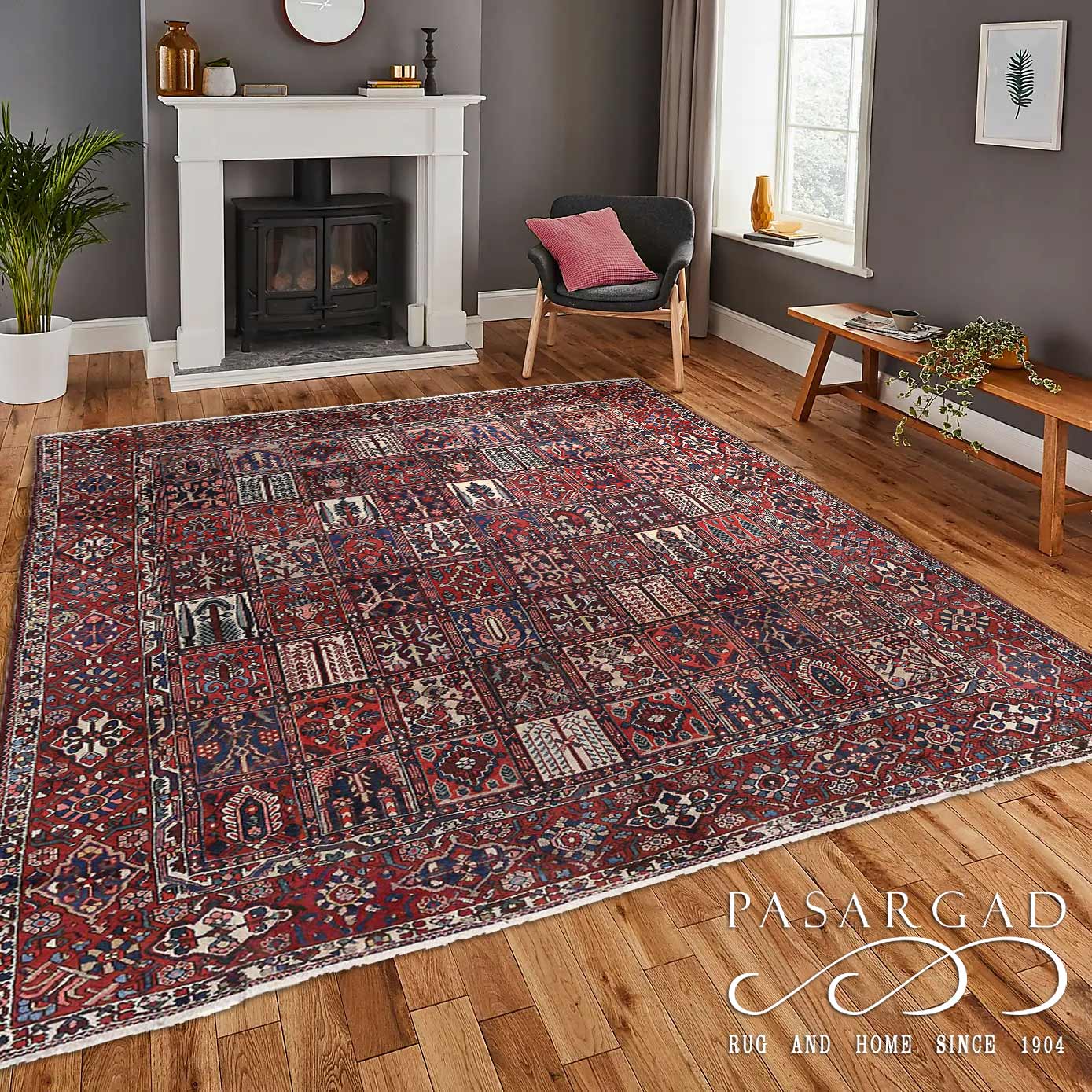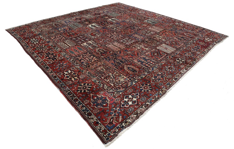 ffered is a gorgeous Persian Bakhtiari area rug. The luxurious hand-knotted pile is made from very fine lamb's wool and features a traditional Bakhtiari motif throughout. Handmade hand-knotted lamb's wool on a cotton foundation.