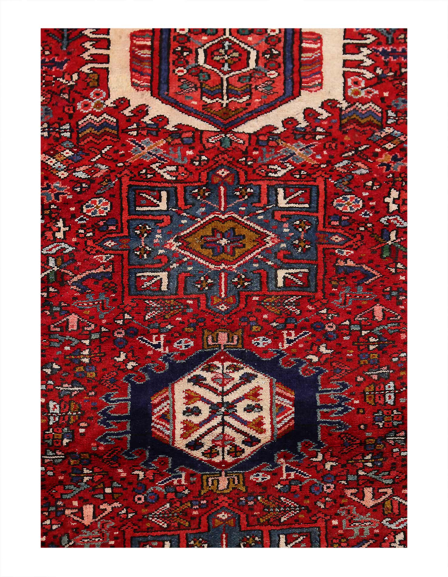 Original Persian Karajeh antique rug. The piece is made of hand-spun lamb's wool on a cotton foundation, and vegetable dyed. The rug has a dense, soft pile, and excellent quality, to ensure that you will enjoy it for years to come. Circa 1920