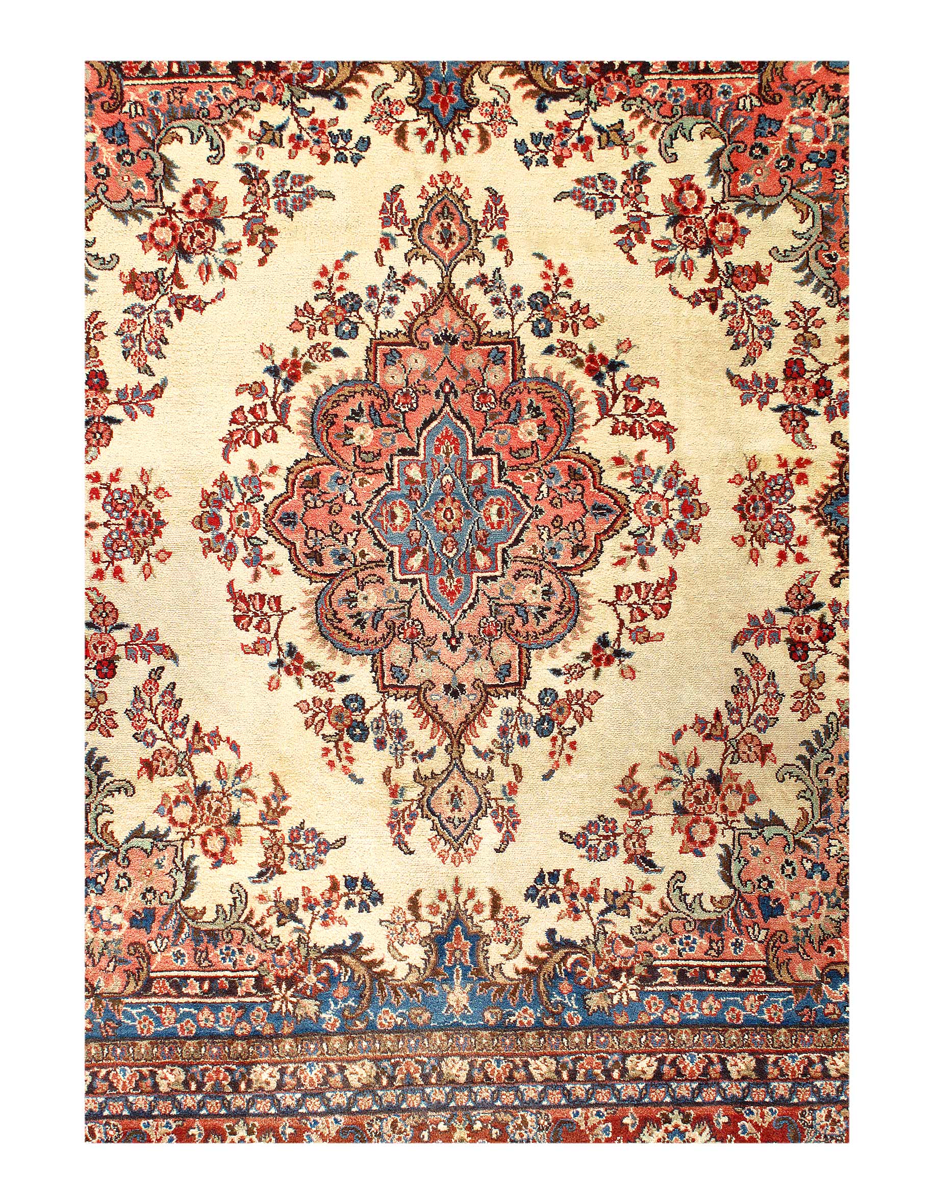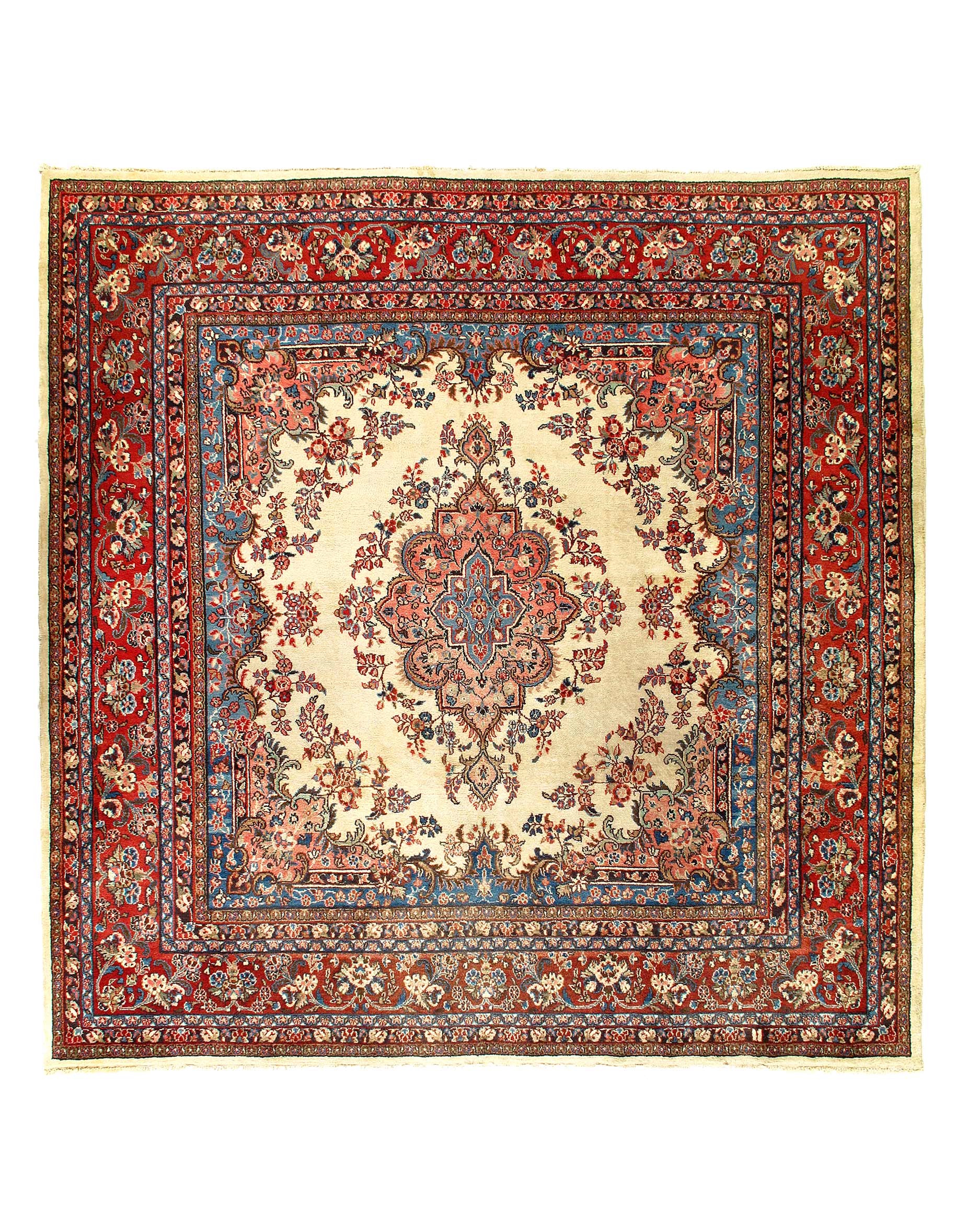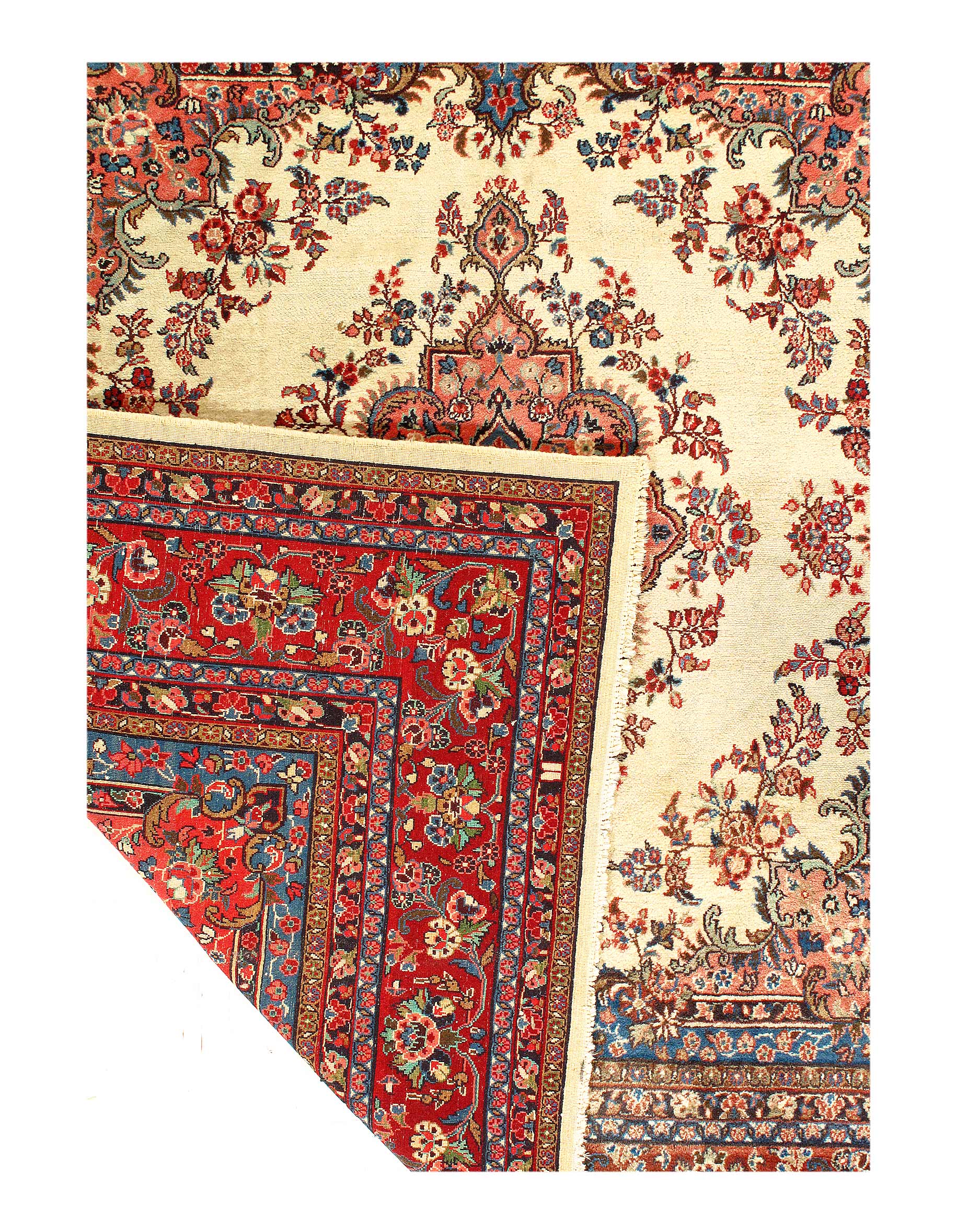 Palmettes, flowers, and sinuous vines wend their way in profusion across the rich red field of this luscious antique Sarouk. The design is carefully controlled in its layout and symmetry despite its dynamic freedom and exuberance. The field elements reappear in the main border as a continuous vinescroll, but set against a blue ground in framing contrast to the field. The meticulous drawing and uniform design texture create a harmonious decorative effect despite the richness of the color and complexity of the ornament.