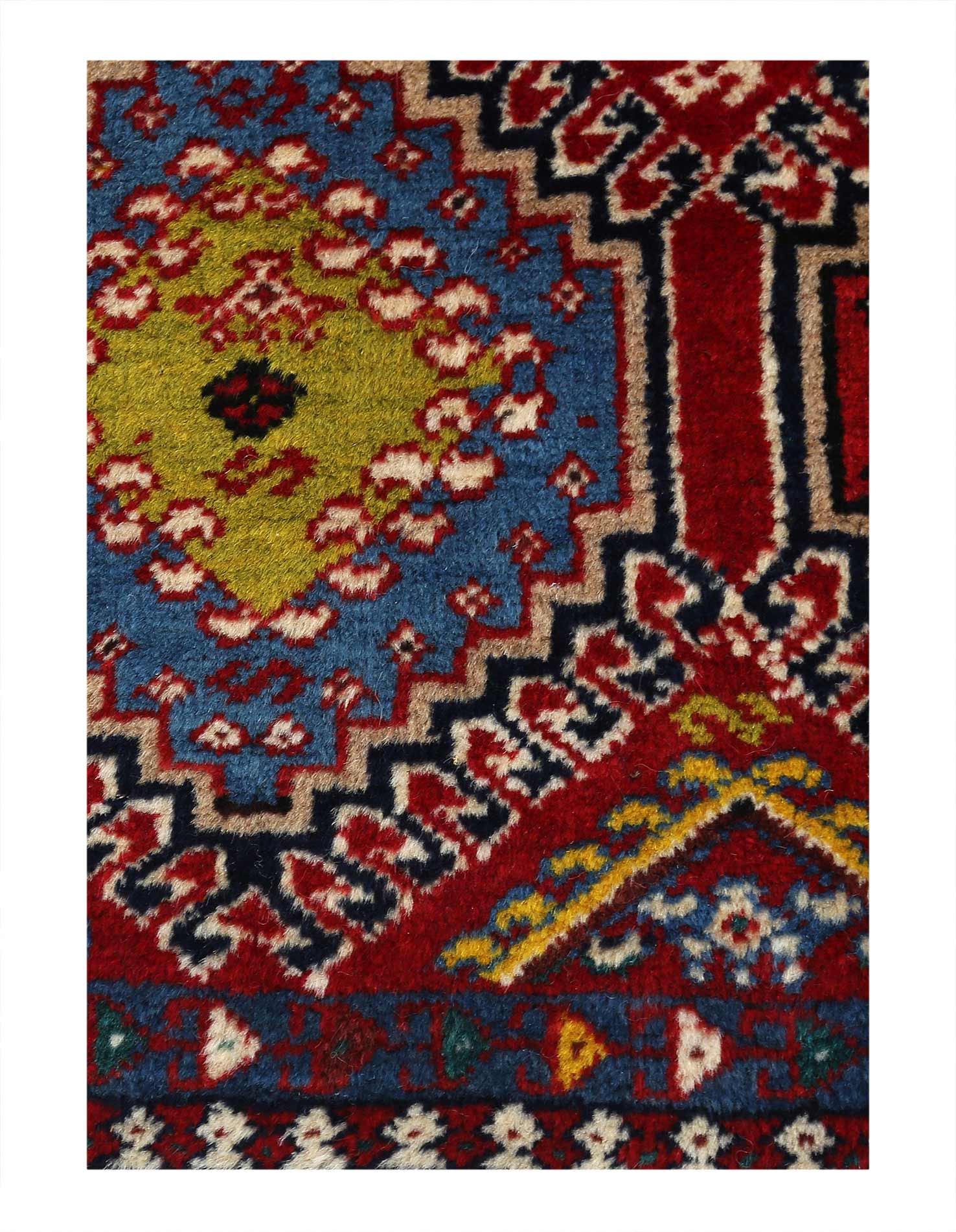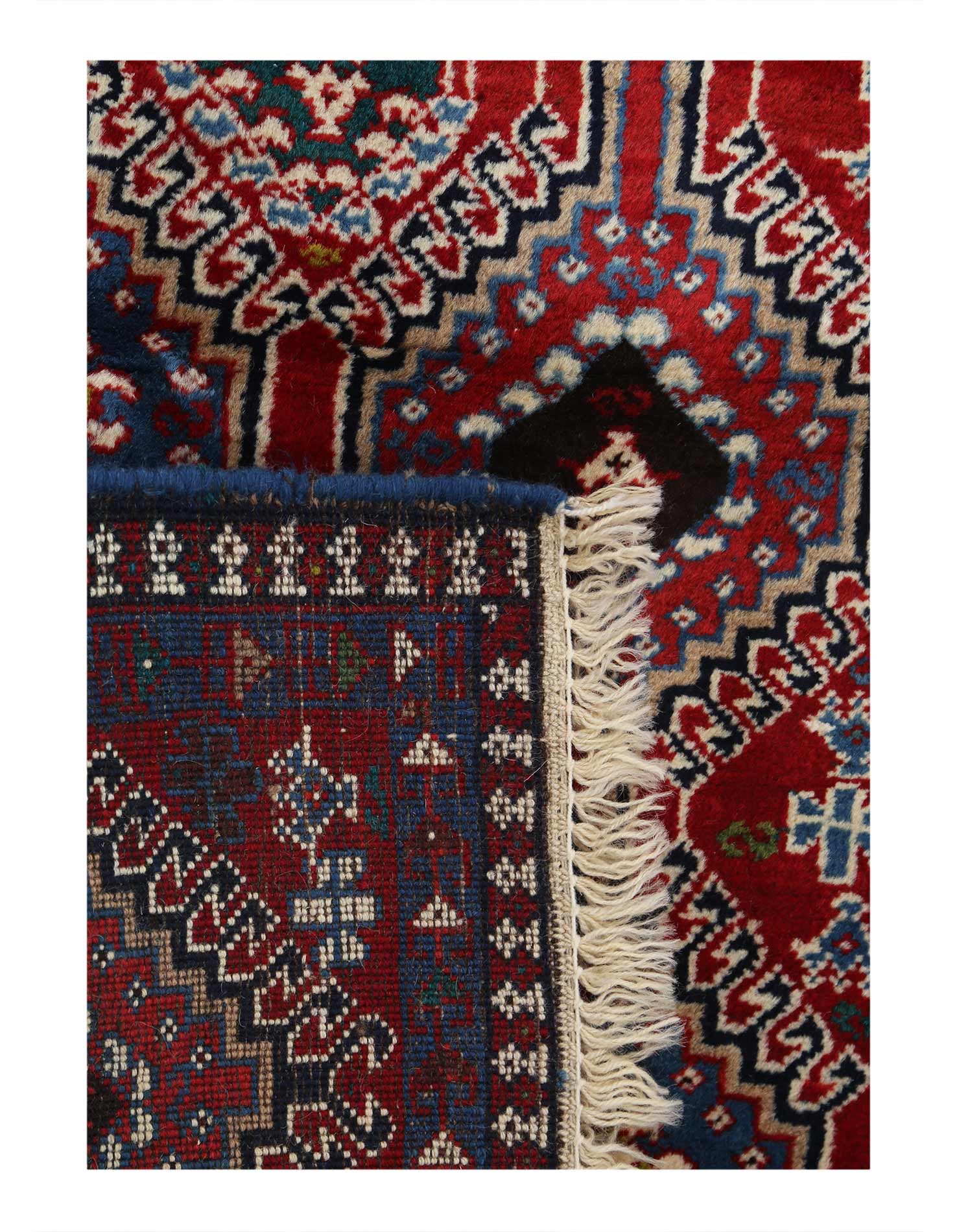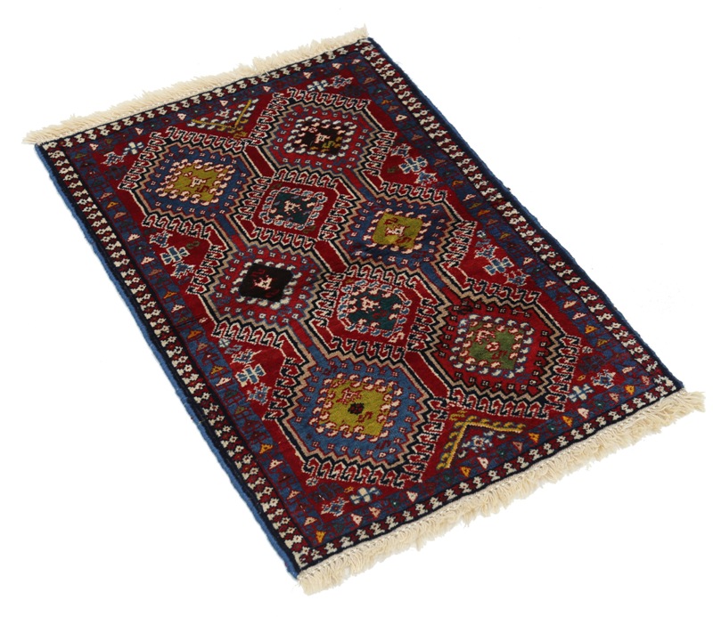The pile used in Yalameh rugs is very fine, particularly in comparison to other tribal designs, using soft wool based on a Wool foundation. The pattern is distinctive with large repeated diamonds in a straight line down the carpet, often with geometrical animal or human prints scattered across the field. Dark red or light brown on a blue or orange background is most common for Yalameh, similar to Shiraz rugs, the rugs compliment modern or minimalist furniture beautifully, giving the living space an aura of luxurious style and warm.
