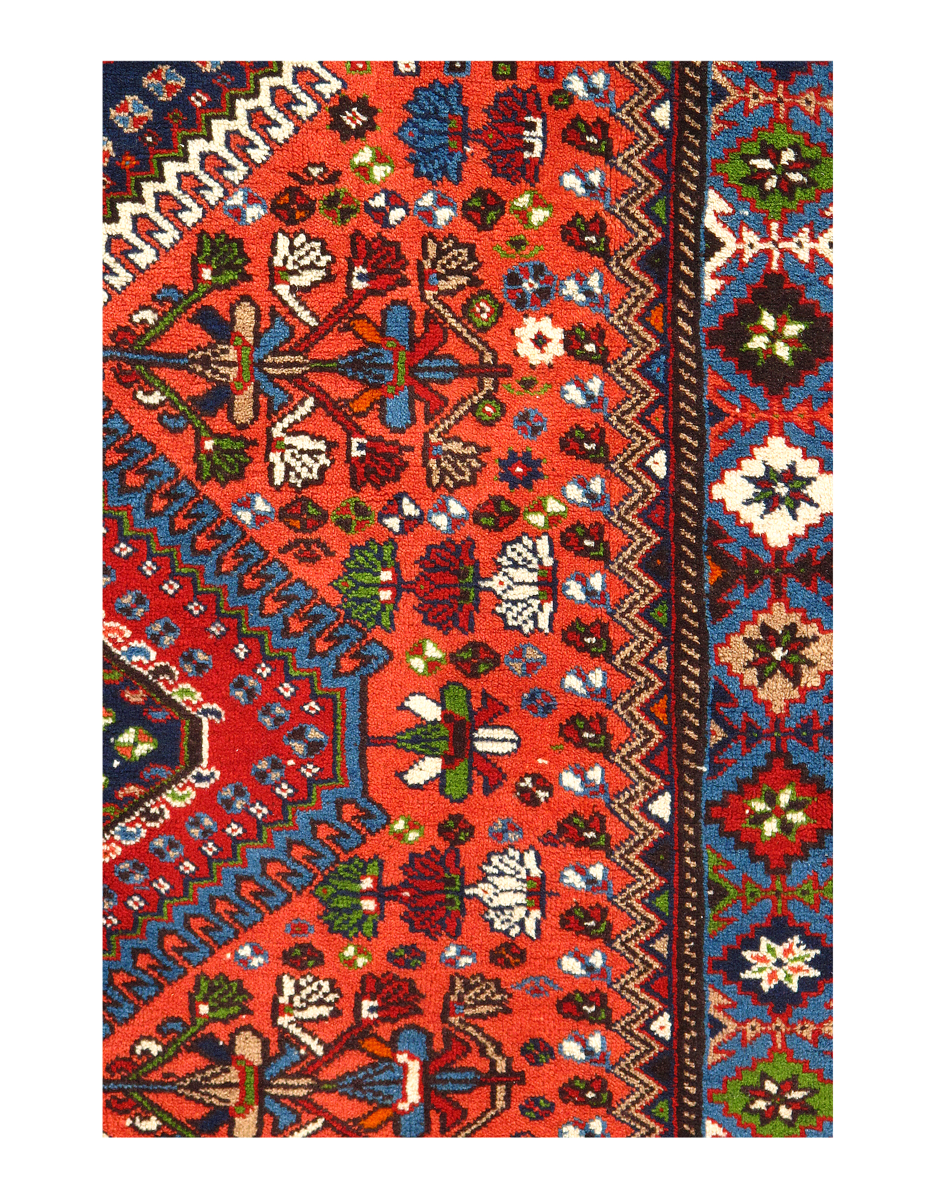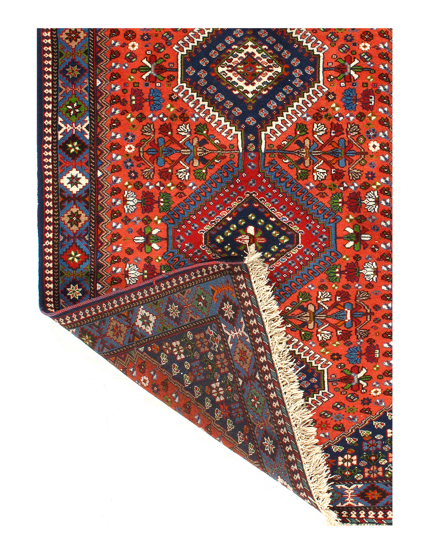 The pile used in Yalameh rugs is very fine, particularly in comparison to other tribal designs, using soft wool based on a Wool foundation. The pattern is distinctive with large repeated diamonds in a straight line down the carpet, often with geometrical animal or human prints scattered across the field. Dark red or light brown on a blue or orange background is most common for Yalameh, similar to Shiraz rugs, the rugs compliment modern or minimalist furniture beautifully, giving the living space an aura of luxurious style and warm.