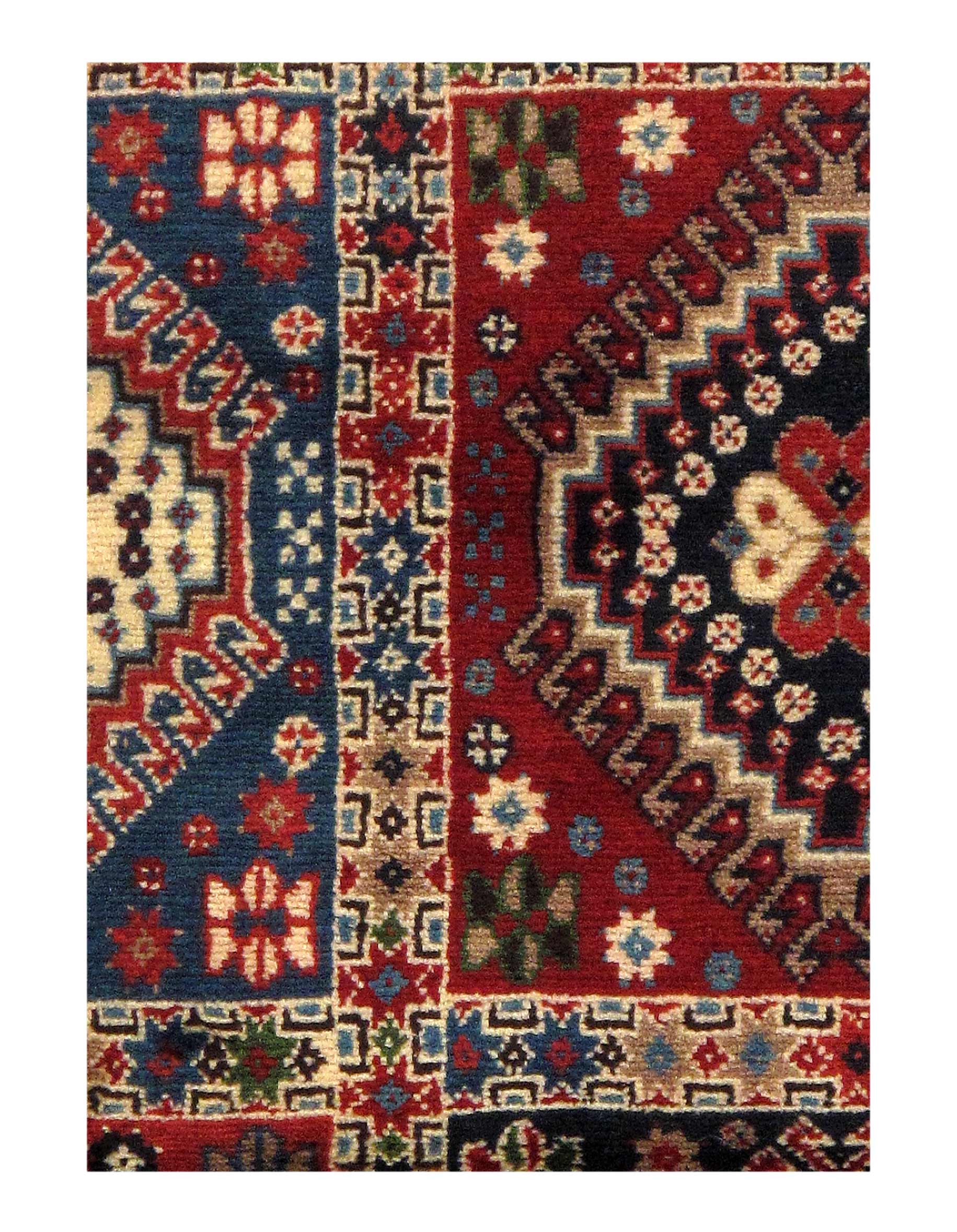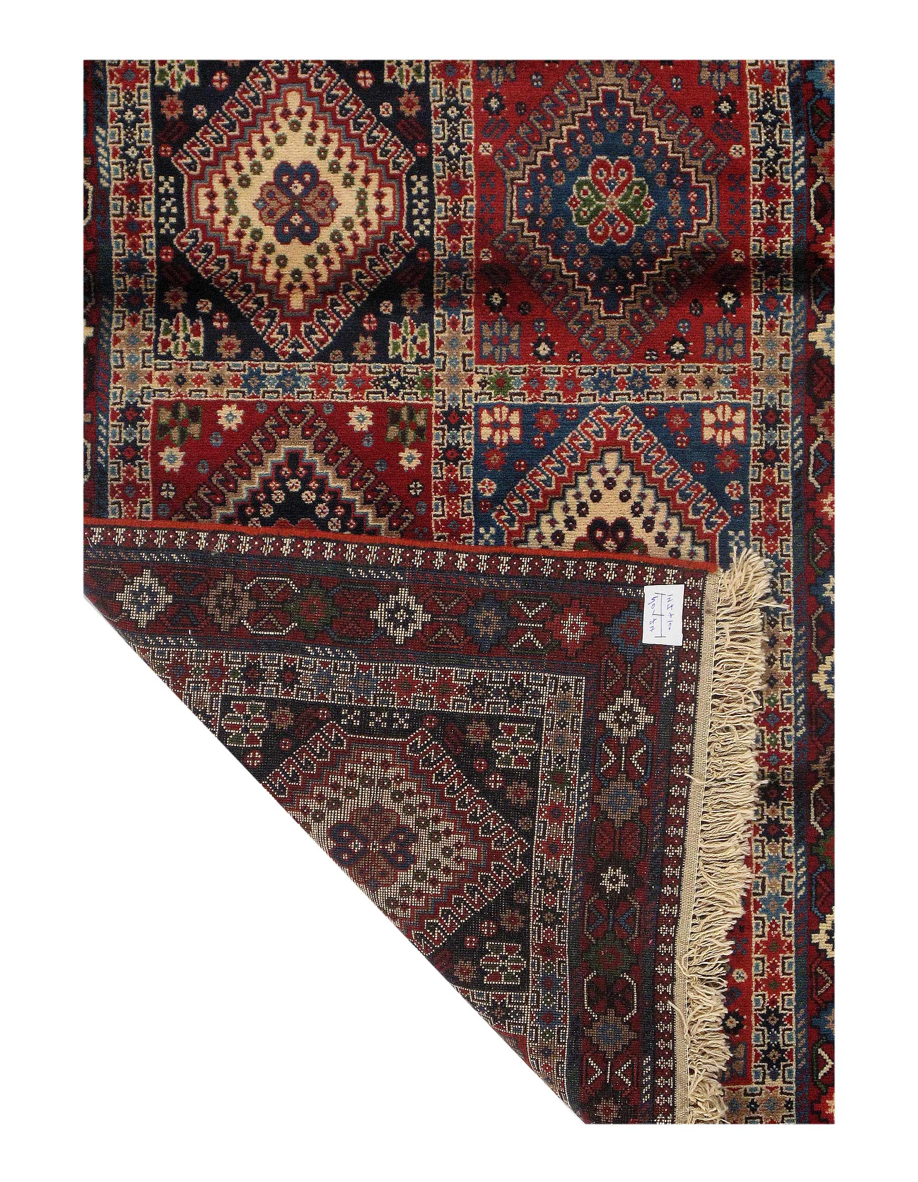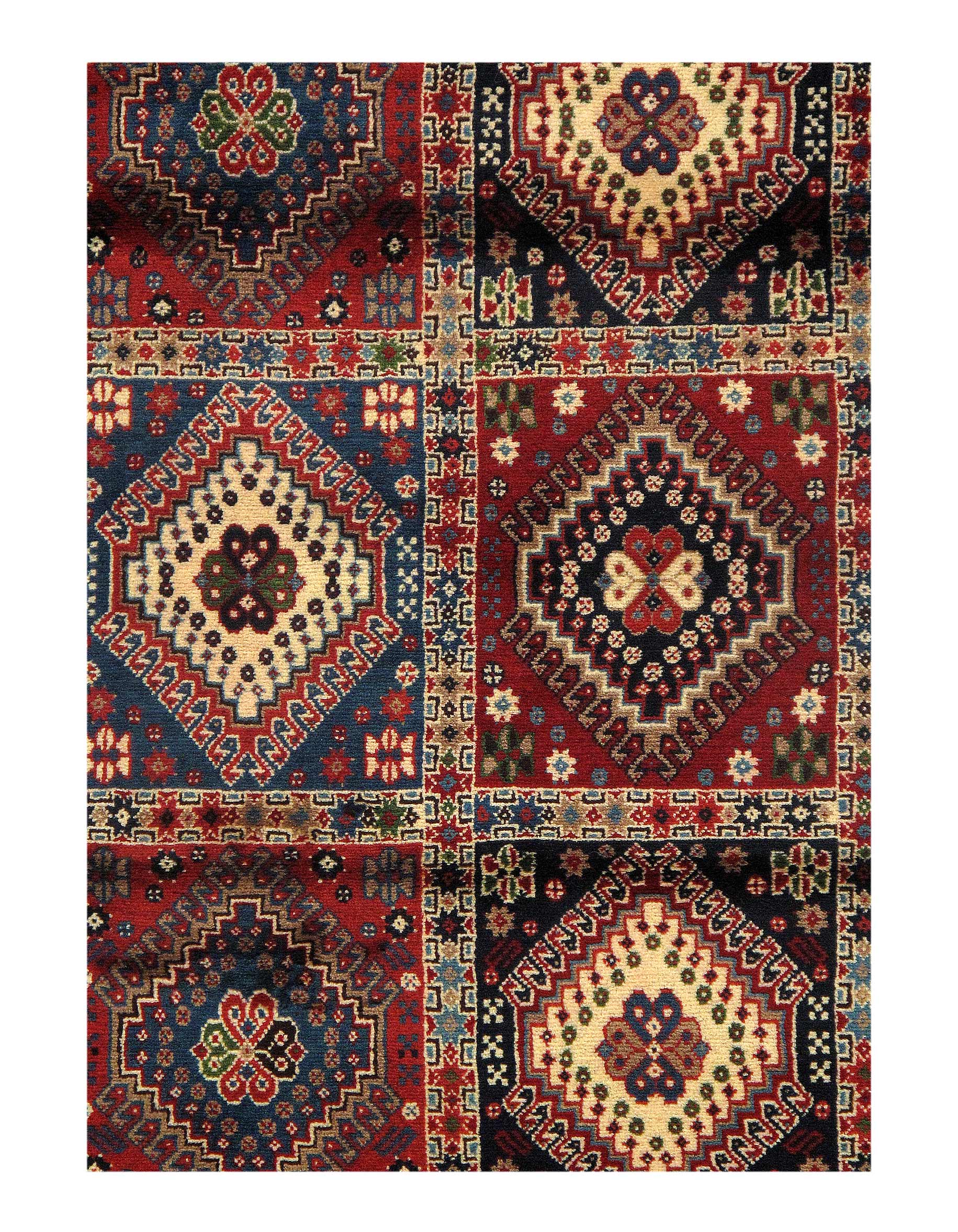 The pile used in Yalameh rugs is very fine, particularly in comparison to other tribal designs, using soft wool based on a Wool foundation. The pattern is distinctive with large repeated diamonds in a straight line down the carpet, often with geometrical animal or human prints scattered across the field. Dark red or light brown on a blue or orange background is most common for Yalameh, similar to Shiraz rugs, the rugs compliment modern or minimalist furniture beautifully, giving the living space an aura of luxurious style and warm.