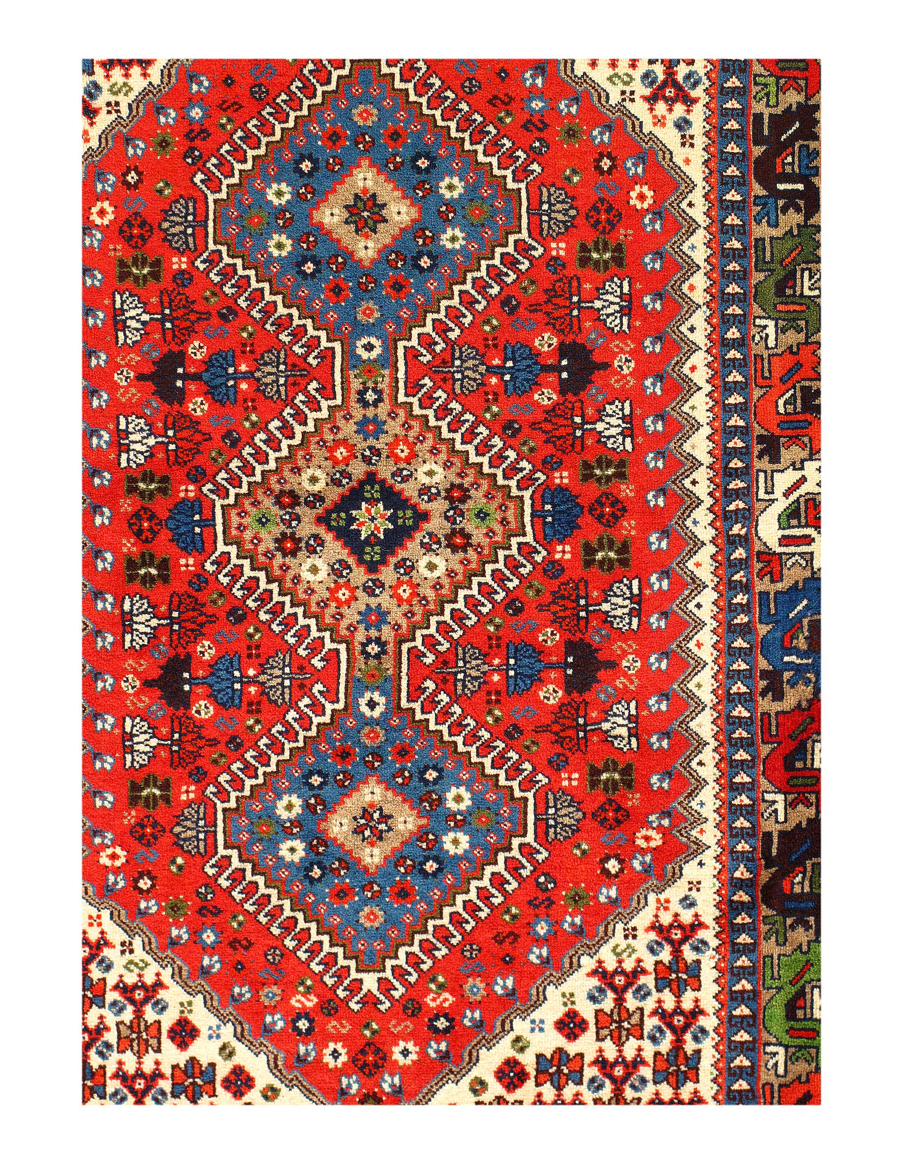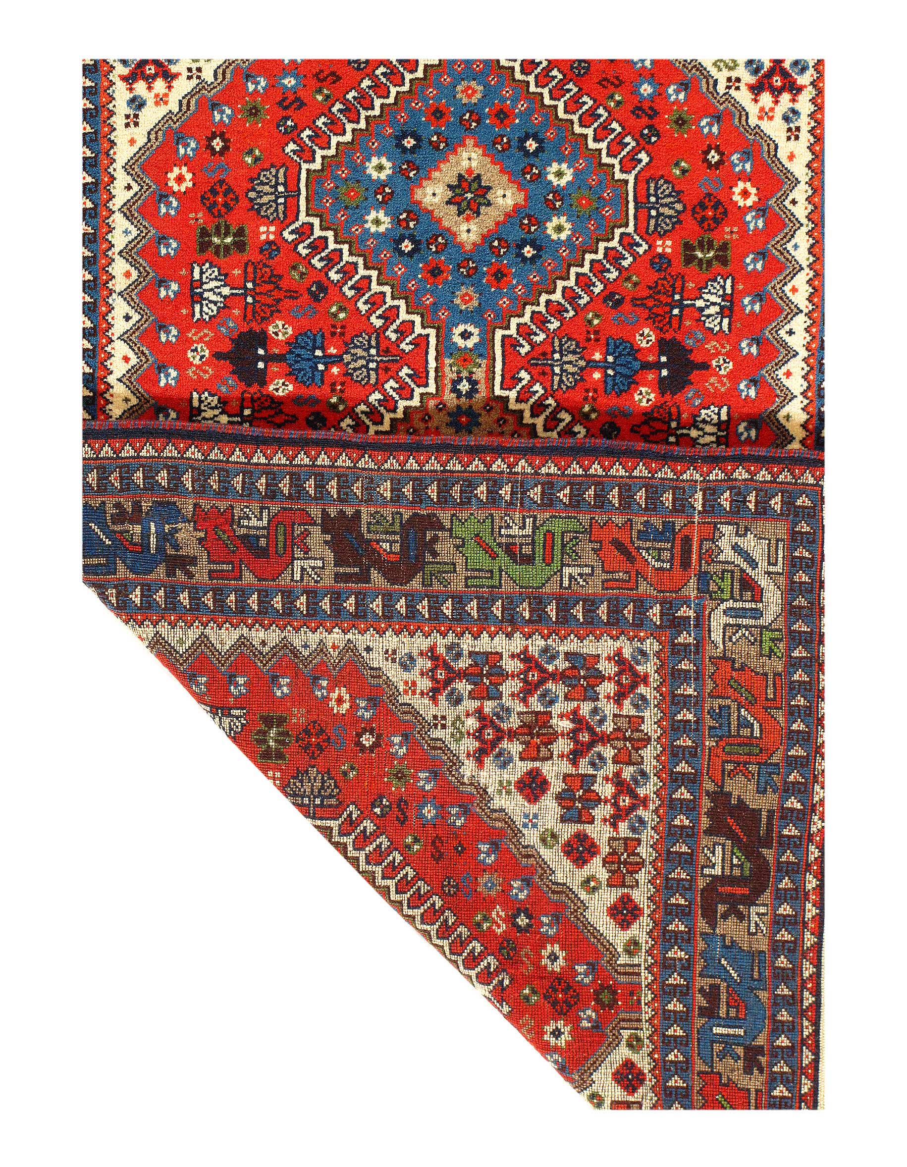The pile used in Yalameh rugs is very fine, particularly in comparison to other tribal designs, using soft wool based on a Wool foundation. The pattern is distinctive with large repeated diamonds in a straight line down the carpet, often with geometrical animal or human prints scattered across the field. Dark red or light brown on a blue or orange background is most common for Yalameh, similar to Shiraz rugs, the rugs compliment modern or minimalist furniture beautifully, giving the living space an aura of luxurious style and warm.
