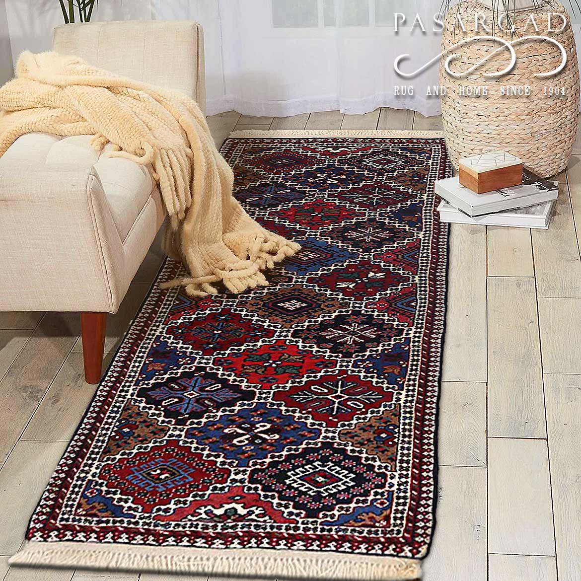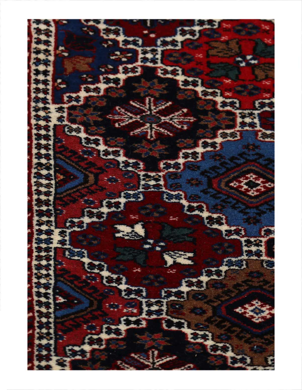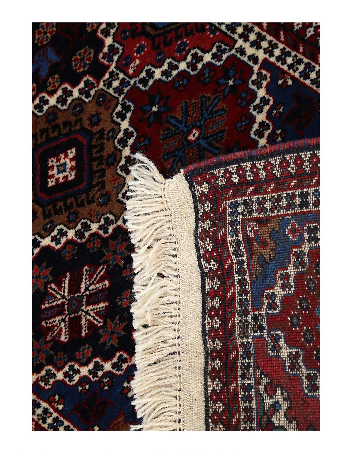 The pile used in Yalameh rugs is very fine, particularly in comparison to other tribal designs, using soft wool based on a Wool foundation. The pattern is distinctive with large repeated diamonds in a straight line down the carpet, often with geometrical animal or human prints scattered across the field. Dark red or light brown on a blue or orange background is most common for Yalameh, similar to Shiraz rugs, the rugs compliment modern or minimalist furniture beautifully, giving the living space an aura of luxurious style and warm.