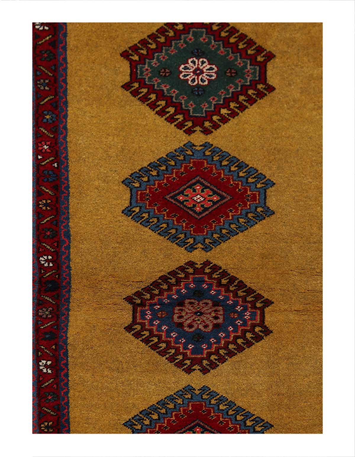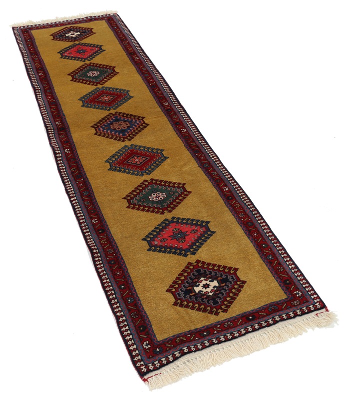 The pile used in Yalameh rugs is very fine, particularly in comparison to other tribal designs, using soft wool based on a Wool foundation. The pattern is distinctive with large repeated diamonds in a straight line down the carpet, often with geometrical animal or human prints scattered across the field. Dark red or light brown on a blue or orange background is most common for Yalameh, similar to Shiraz rugs, the rugs compliment modern or minimalist furniture beautifully, giving the living space an aura of luxurious style and warm.
