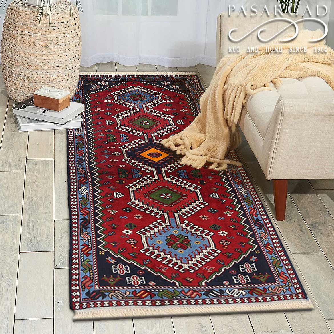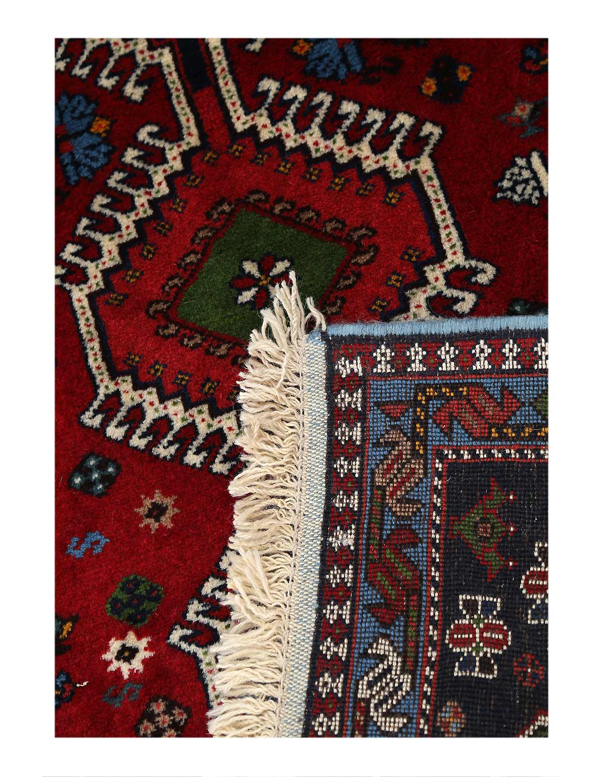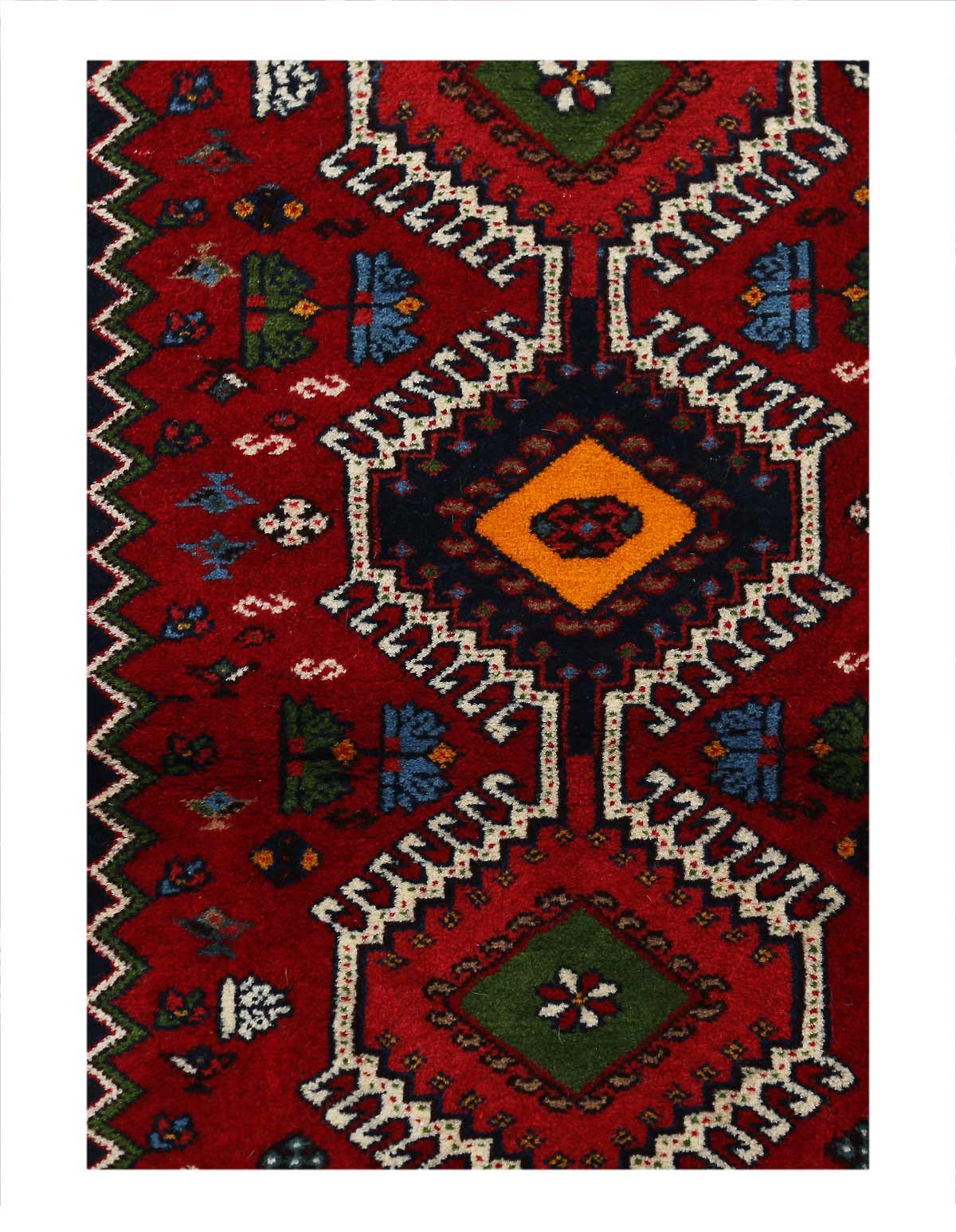 The pile used in Yalameh rugs is very fine, particularly in comparison to other tribal designs, using soft wool based on a Wool foundation. The pattern is distinctive with large repeated diamonds in a straight line down the carpet, often with geometrical animal or human prints scattered across the field. Dark red or light brown on a blue or orange background is most common for Yalameh, similar to Shiraz rugs, the rugs compliment modern or minimalist furniture beautifully, giving the living space an aura of luxurious style and warm.
