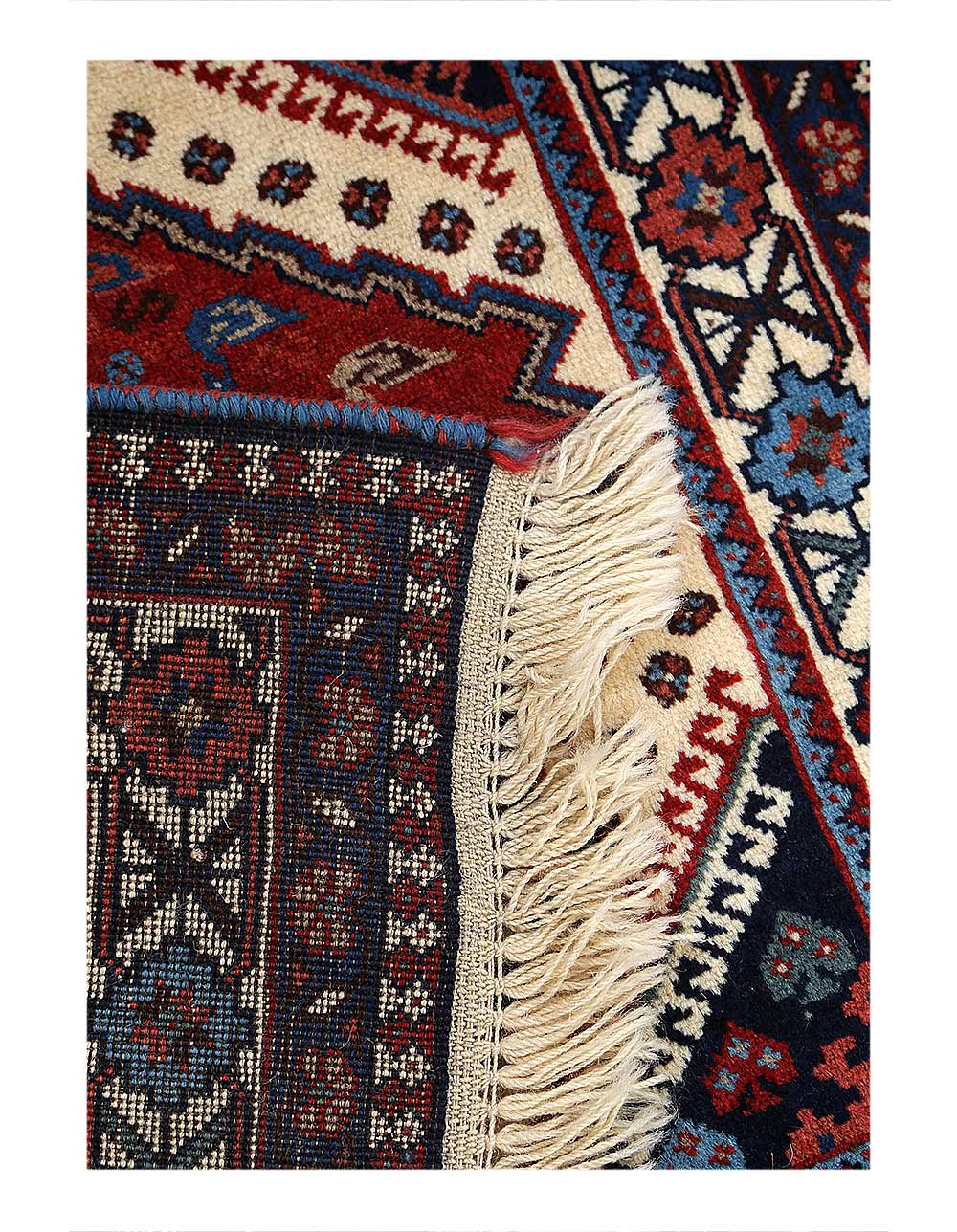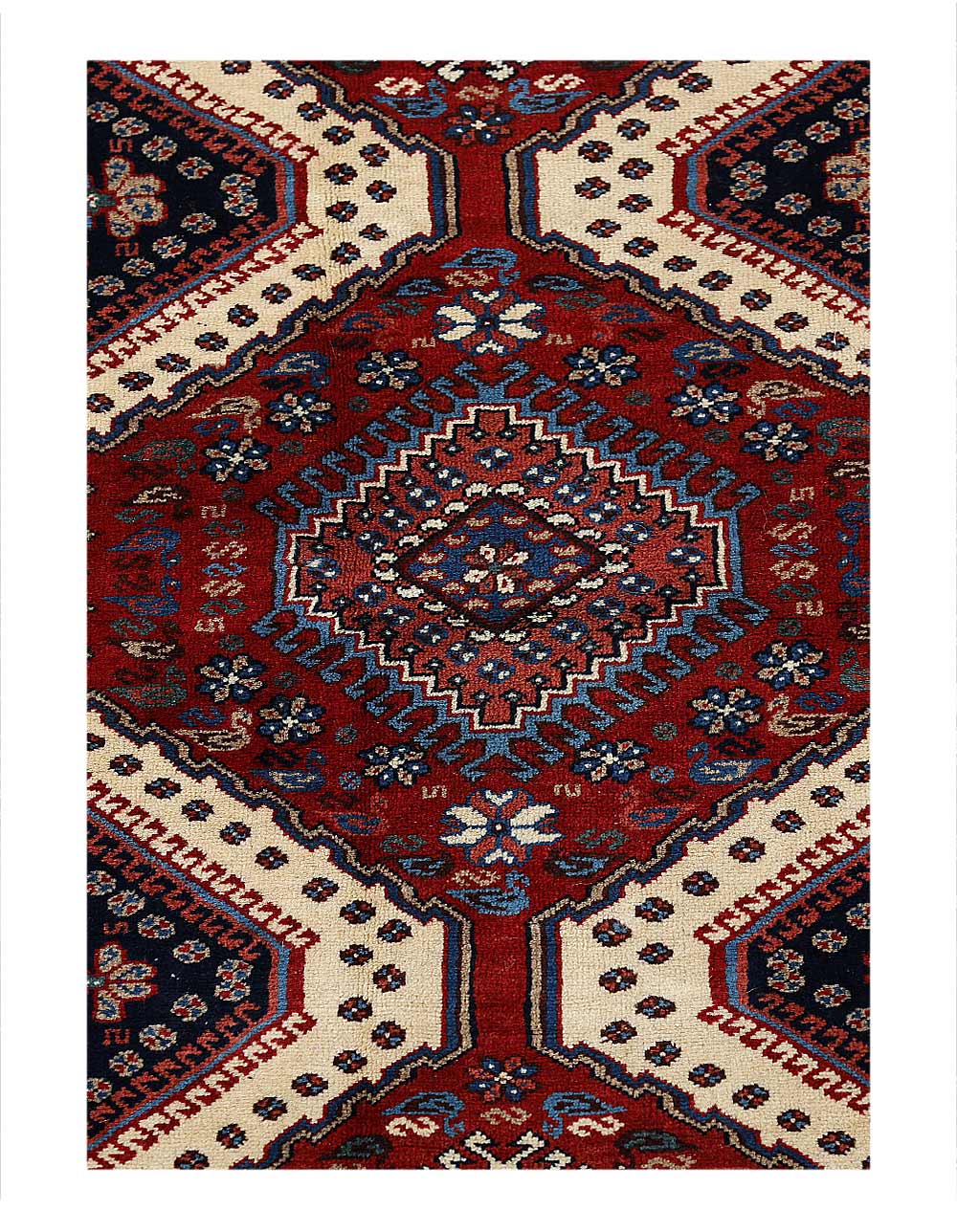 The pile used in Yalameh rugs is very fine, particularly in comparison to other tribal designs, using soft wool based on a Wool foundation. The pattern is distinctive with large repeated diamonds in a straight line down the carpet, often with geometrical animal or human prints scattered across the field. Dark red or light brown on a blue or orange background is most common for Yalameh, similar to Shiraz rugs, the rugs compliment modern or minimalist furniture beautifully, giving the living space an aura of luxurious style and warm.