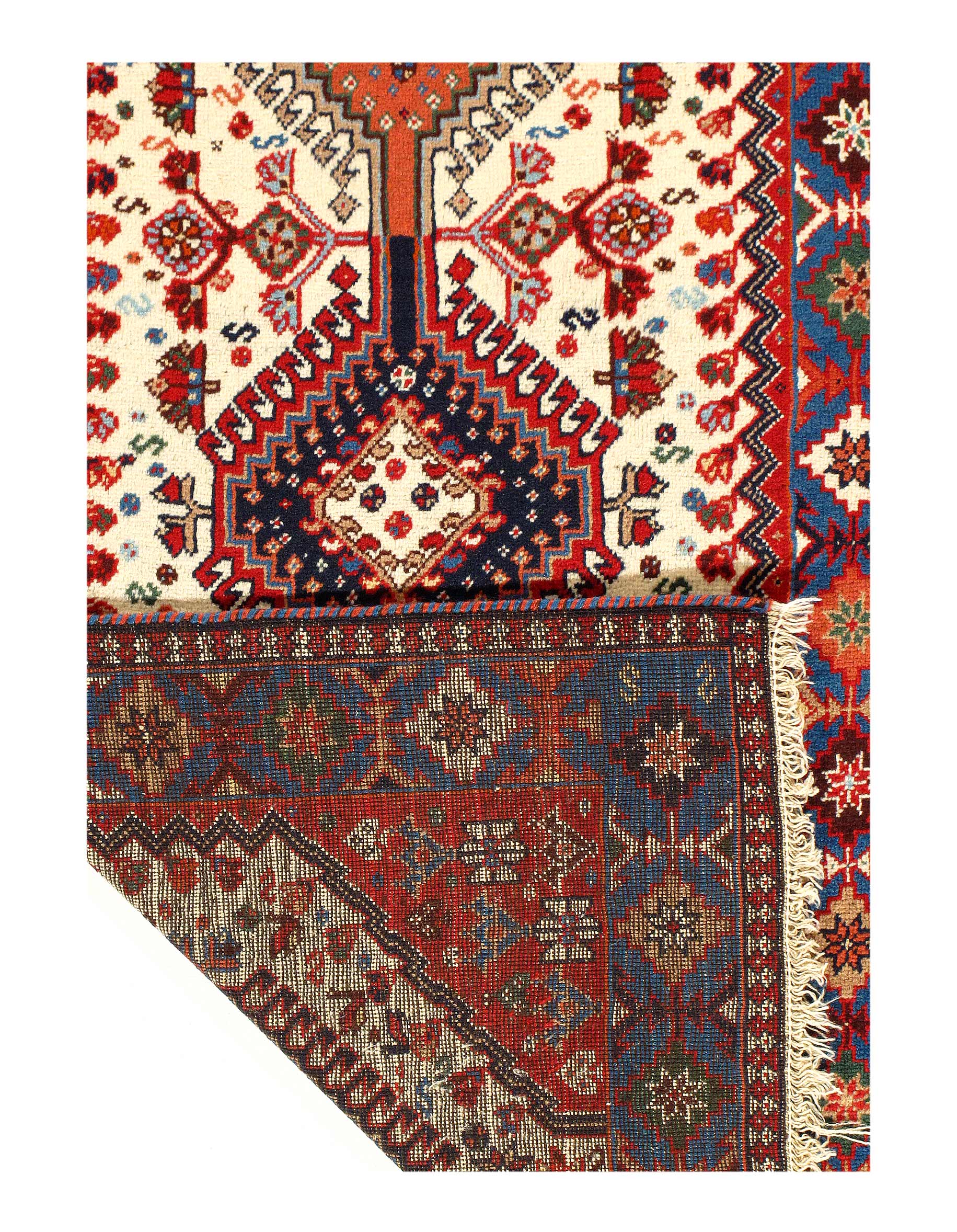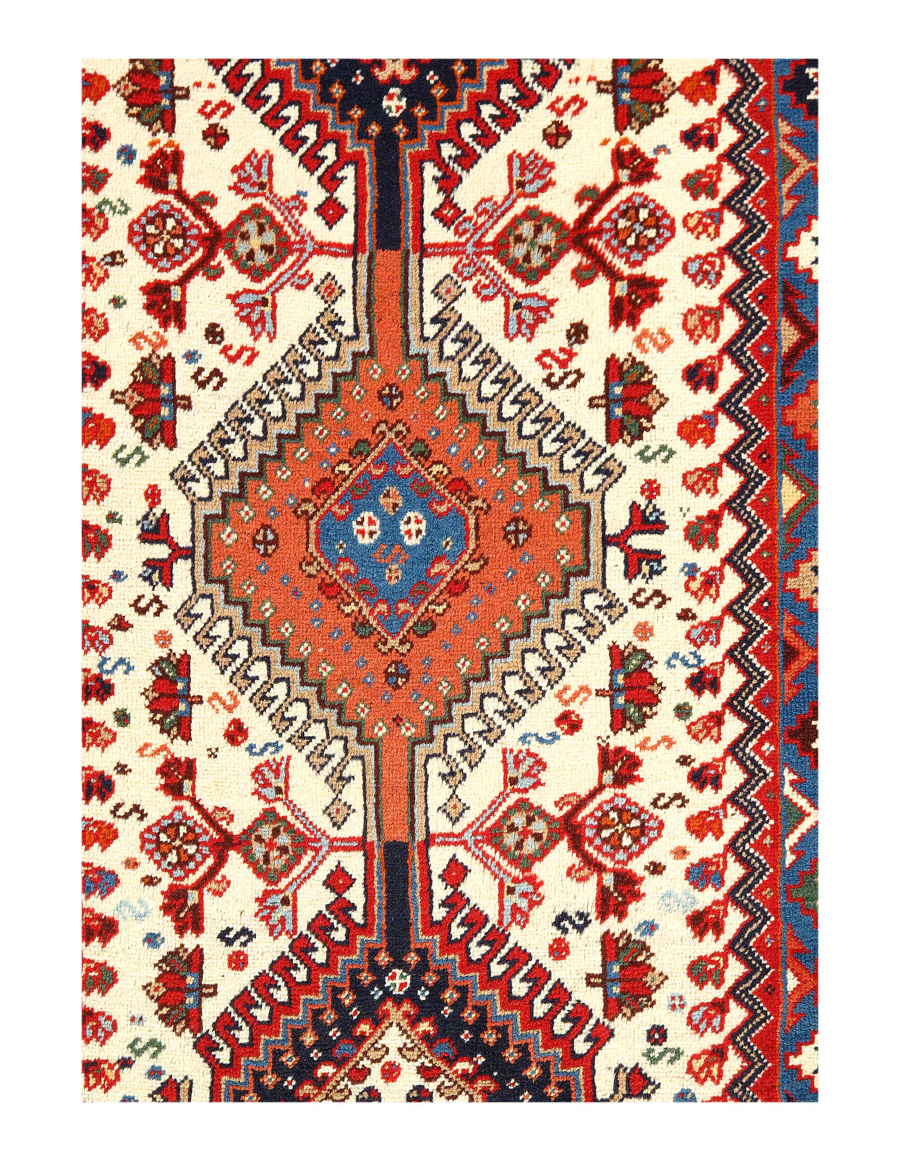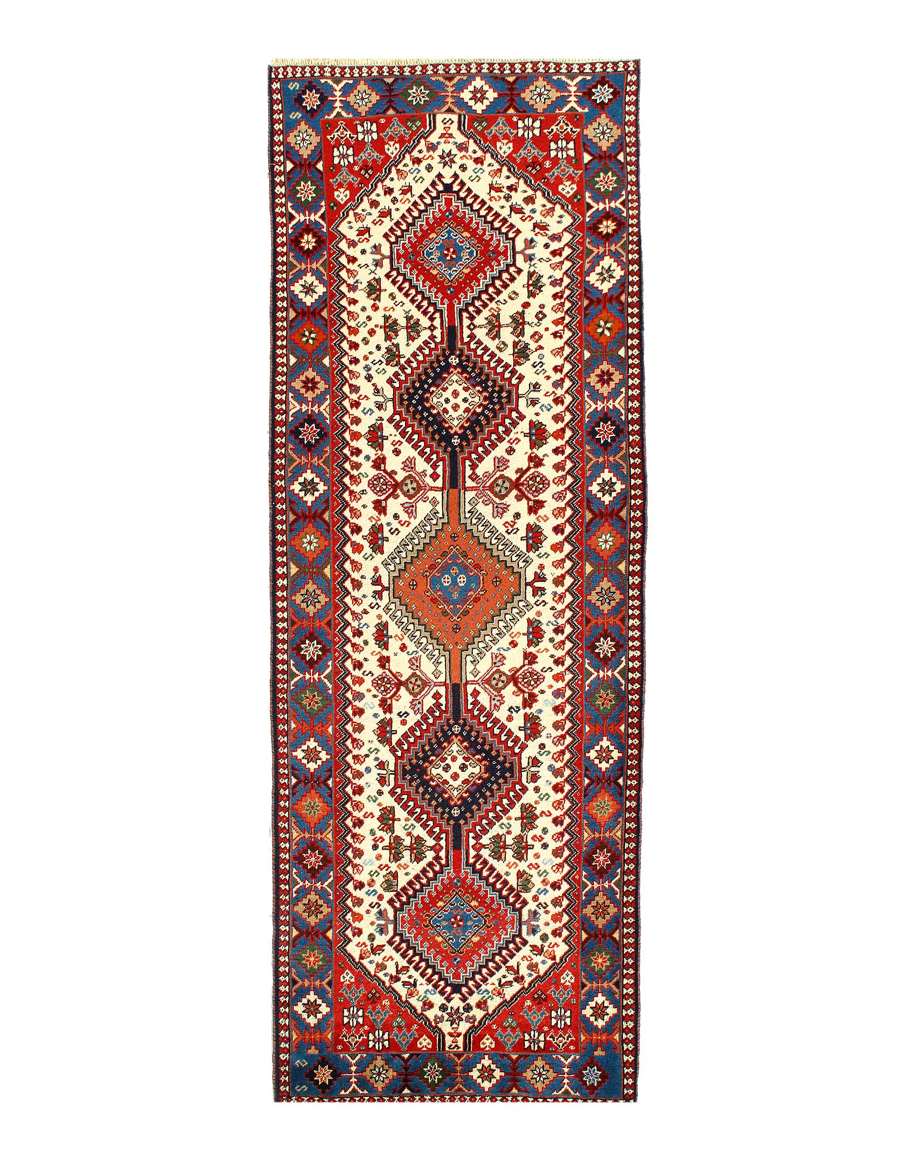 The pile used in Yalameh rugs is very fine, particularly in comparison to other tribal designs, using soft wool based on a Wool foundation. The pattern is distinctive with large repeated diamonds in a straight line down the carpet, often with geometrical animal or human prints scattered across the field. Dark red or light brown on a blue or orange background is most common for Yalameh, similar to Shiraz rugs, the rugs compliment modern or minimalist furniture beautifully, giving the living space an aura of luxurious style and warm.