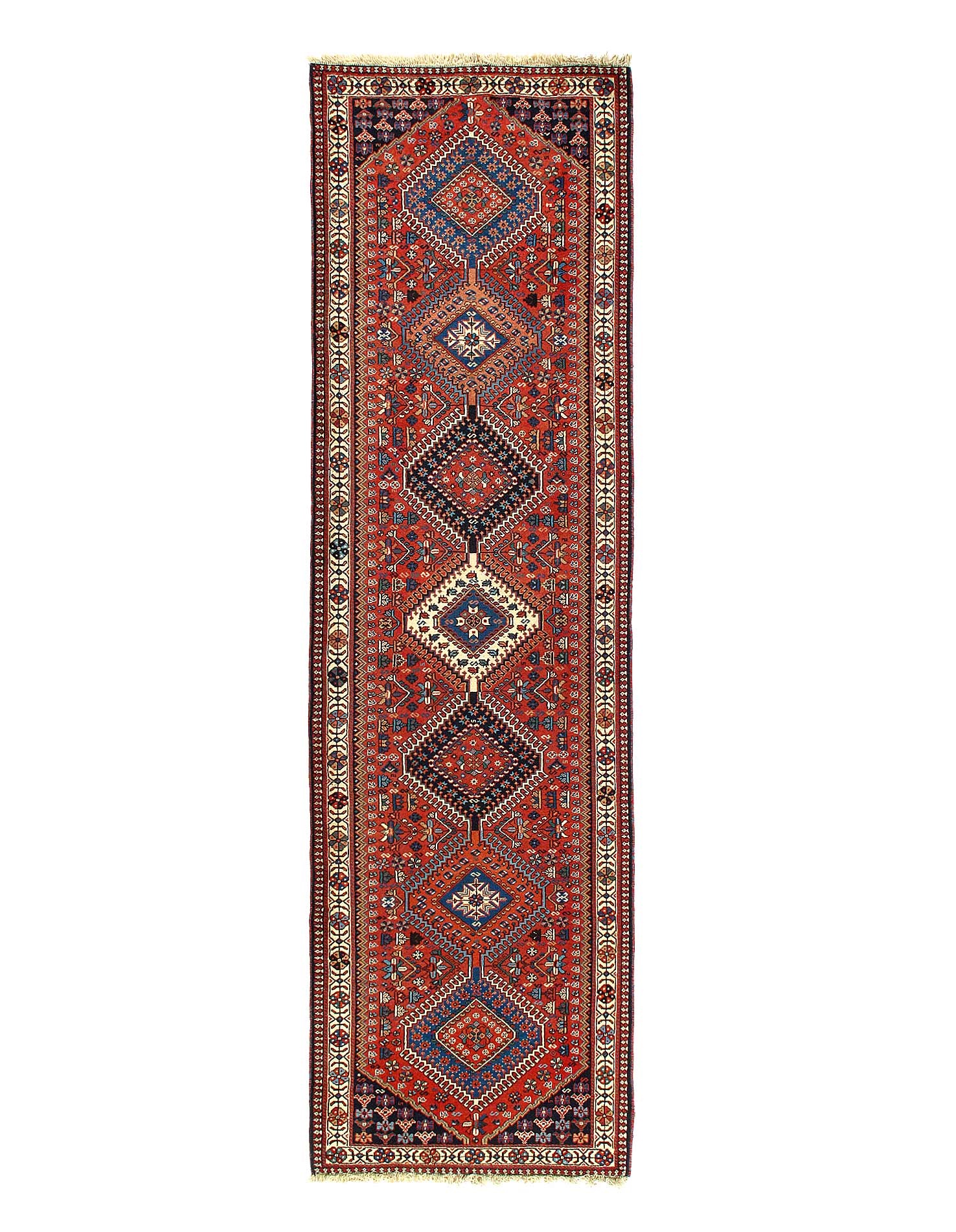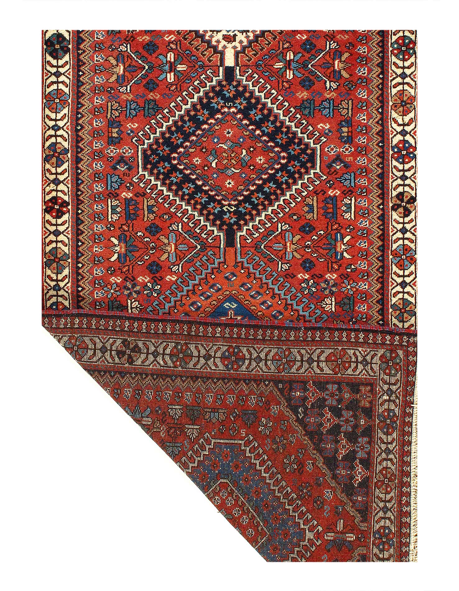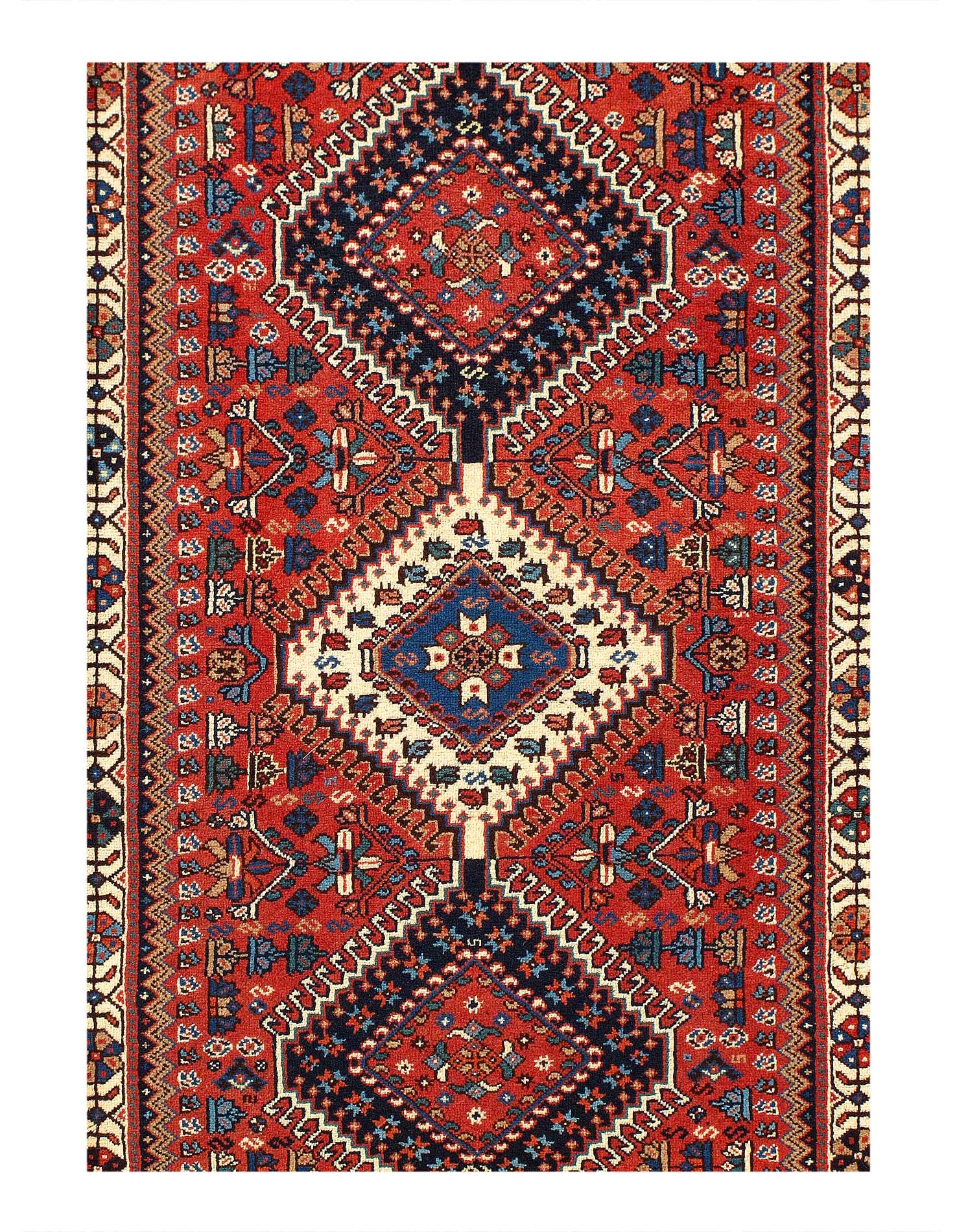 The pile used in Yalameh rugs is very fine, particularly in comparison to other tribal designs, using soft wool based on a Wool foundation. The pattern is distinctive with large repeated diamonds in a straight line down the carpet, often with geometrical animal or human prints scattered across the field. Dark red or light brown on a blue or orange background is most common for Yalameh, similar to Shiraz rugs, the rugs compliment modern or minimalist furniture beautifully, giving the living space an aura of luxurious style and warm.