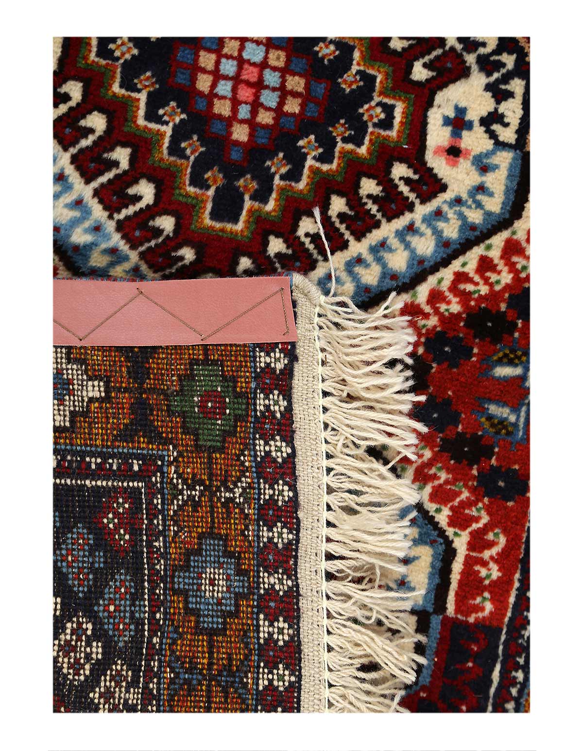 The pile used in Yalameh rugs is very fine, particularly in comparison to other tribal designs, using soft wool based on a Wool foundation. The pattern is distinctive with large repeated diamonds in a straight line down the carpet, often with geometrical animal or human prints scattered across the field. Dark red or light brown on a blue or orange background is most common for Yalameh, similar to Shiraz rugs, the rugs compliment modern or minimalist furniture beautifully, giving the living space an aura of luxurious style and warm.
