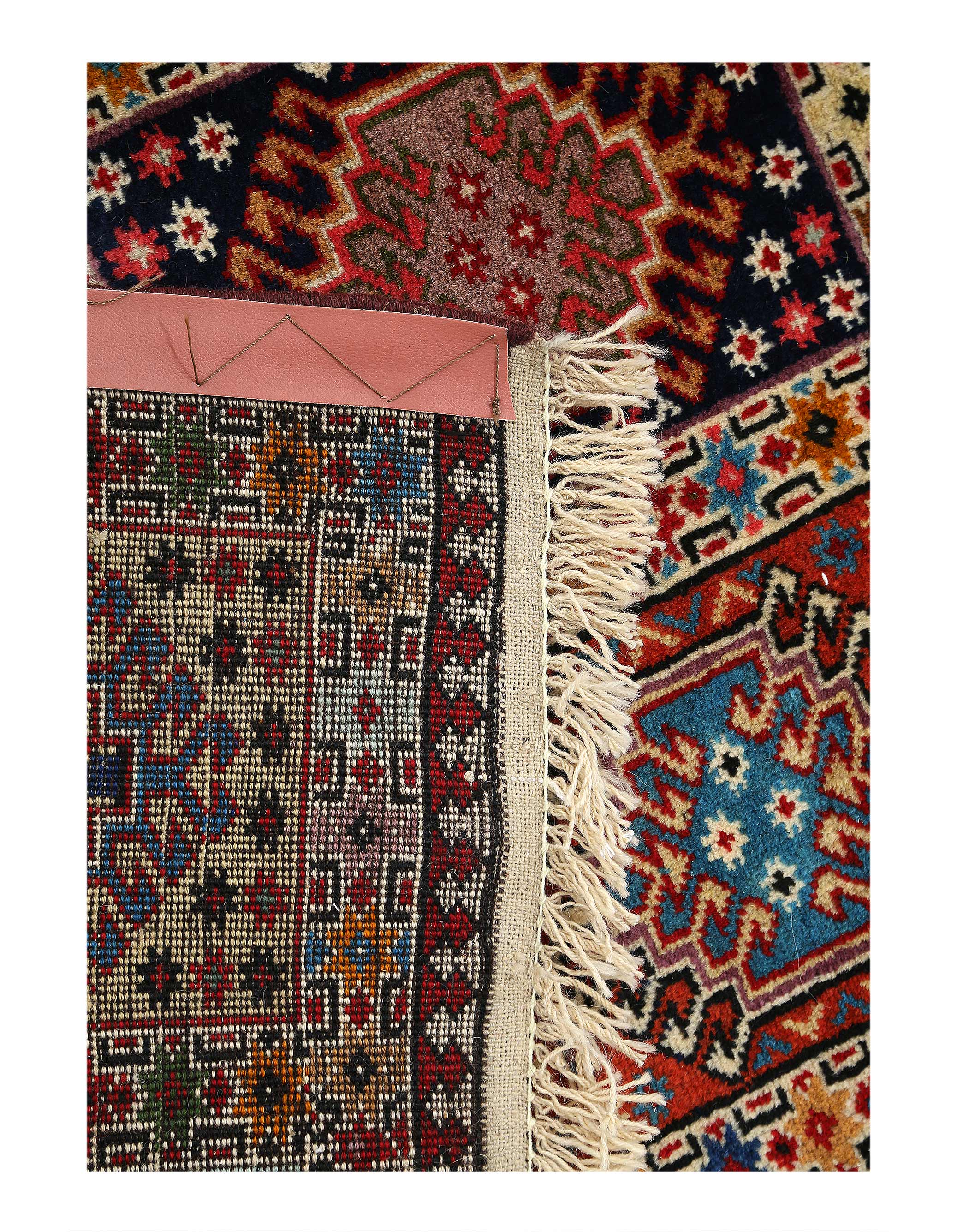 The pile used in Yalameh rugs is very fine, particularly in comparison to other tribal designs, using soft wool based on a Wool foundation. The pattern is distinctive with large repeated diamonds in a straight line down the carpet, often with geometrical animal or human prints scattered across the field. Dark red or light brown on a blue or orange background is most common for Yalameh, similar to Shiraz rugs, the rugs compliment modern or minimalist furniture beautifully, giving the living space an aura of luxurious style and warm.