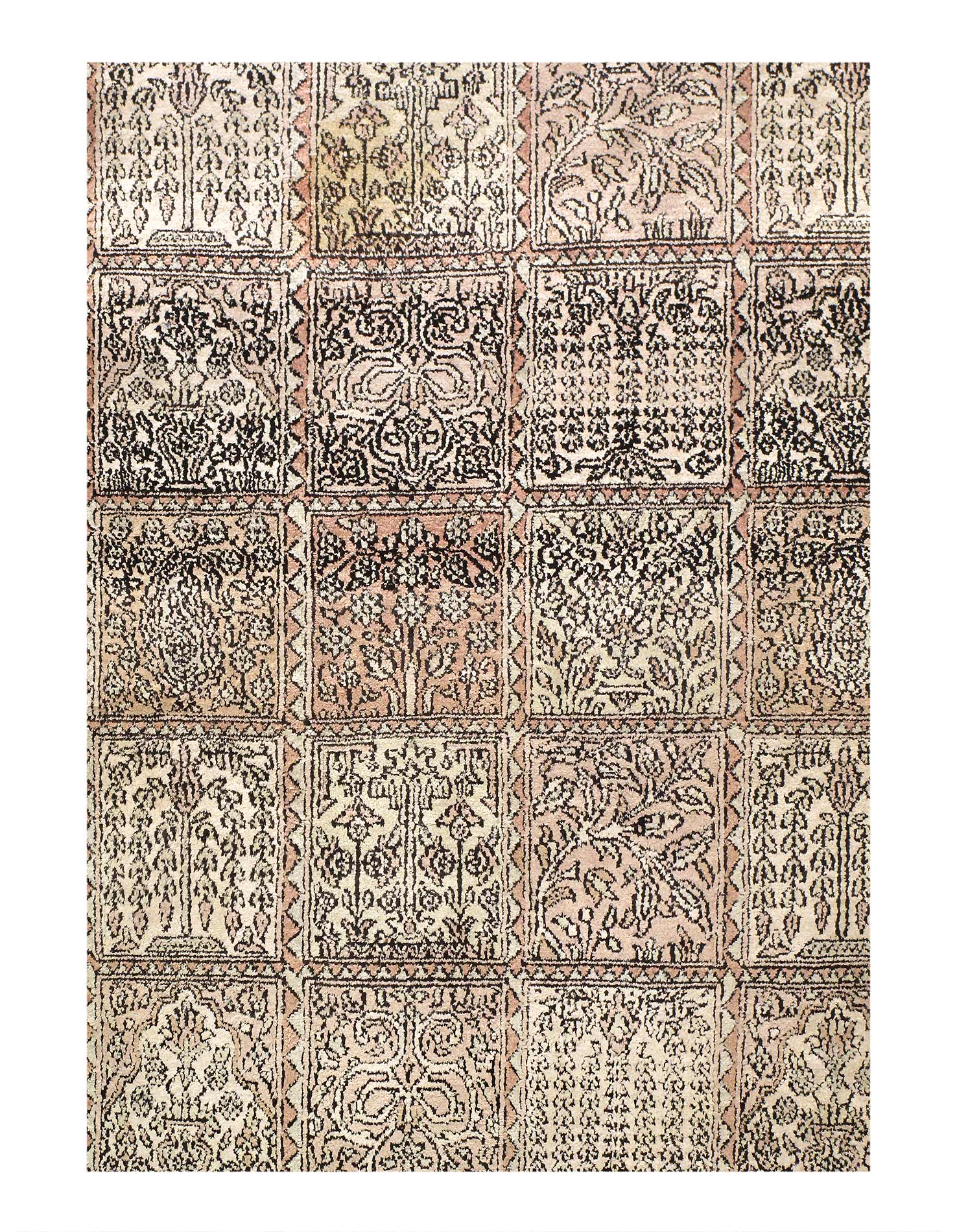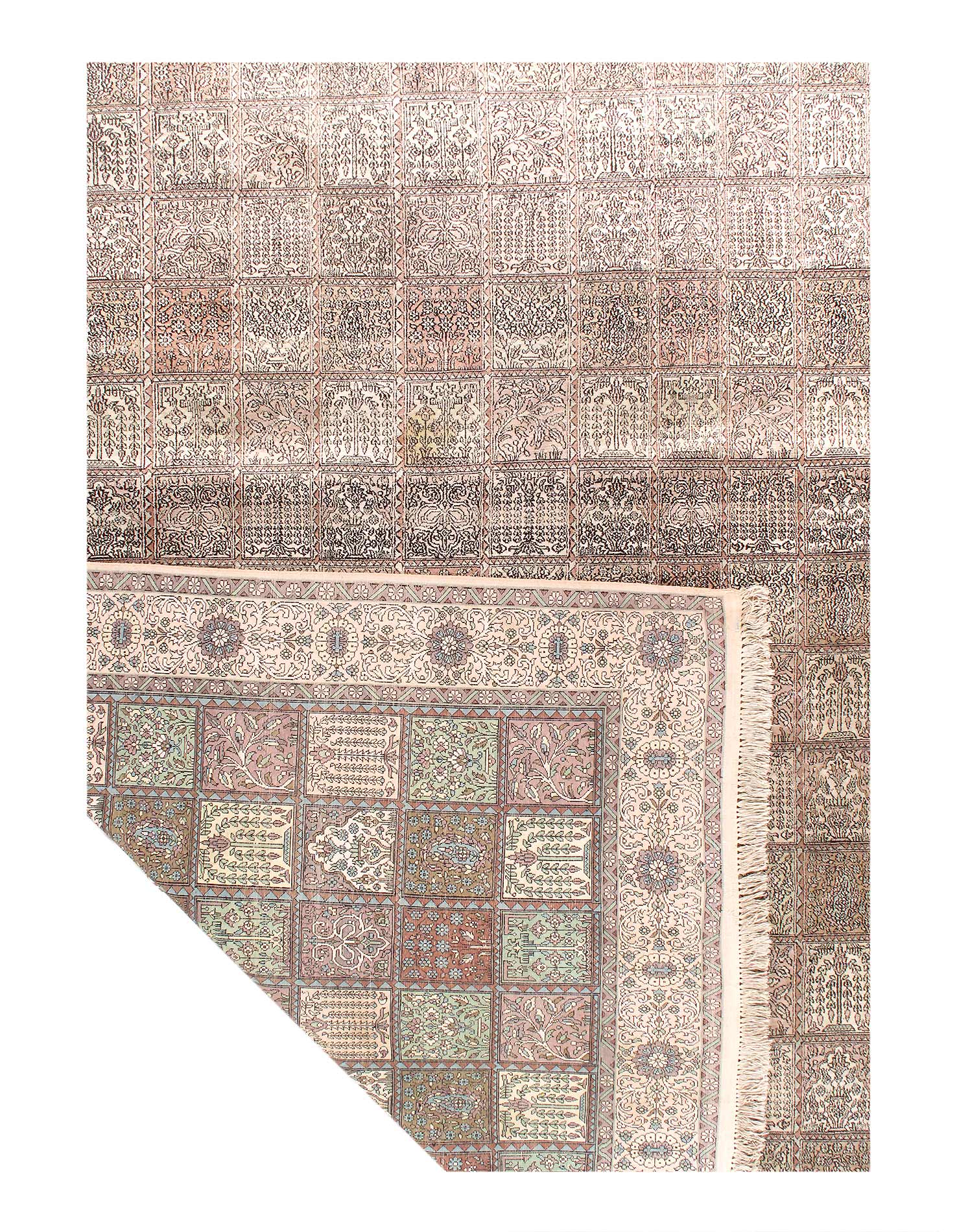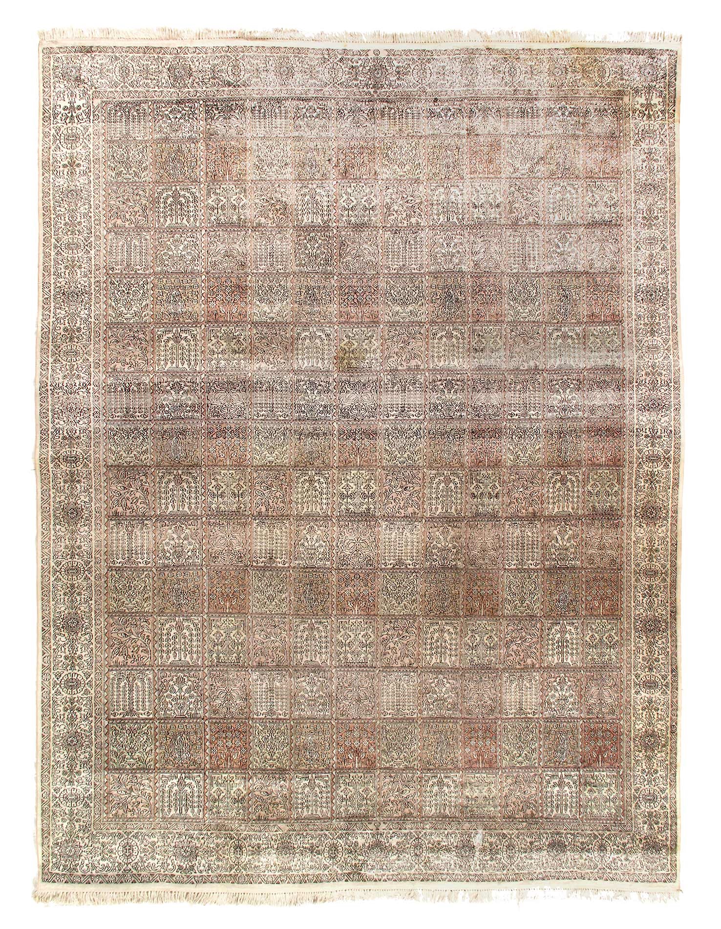 This rug has a Classic Islamic design which originates in traditional gardens. The squares are also named panels - also found in Persian Qum silk rugs. It is in very good full pile condition.