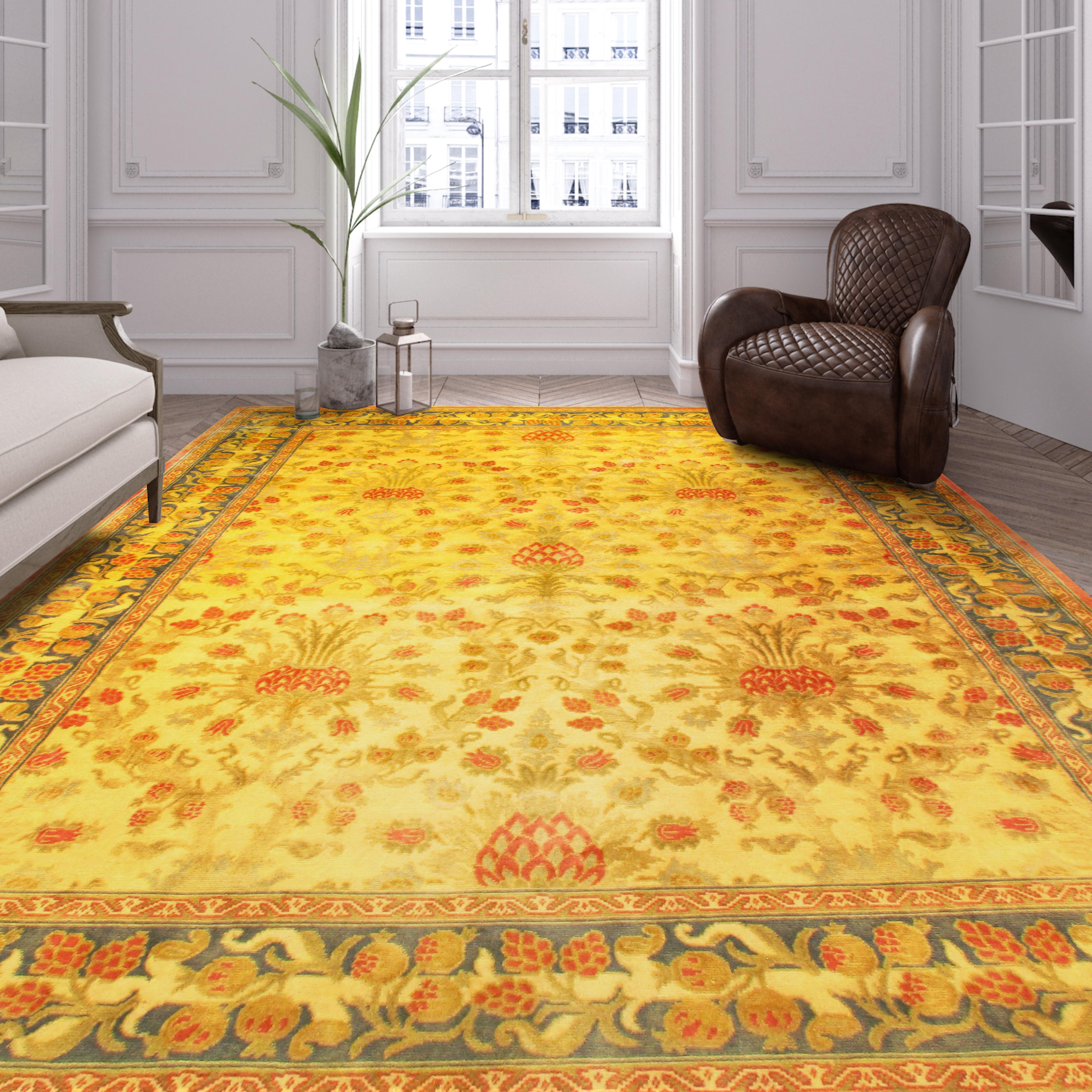 This French Savonnerie inspired modern rug showcases a grand repeating pattern comprised of primary and secondary floral motifs set over a sumptuous walnut brown field. The elegant repeating motifs feature floral sconces with flourishing panicles, pendulous palmettes and polychromatic saz leaves. Each elegant floral features radiant appendages that are encircled by graceful floral sprays, which create a sophisticated repeating pattern. Flourishing saz leaves with contrasting outlines and graceful curves are offset beautifully by the somber brown field of this rug which was woven in China. Elaborate floral motifs that are punctuated with detailed quatrefoils and floral borders that are embellished with endless knots frame the elegant field while continuing the somber earth-tone color palette. sandy brown details complement the stately brown field beautifully