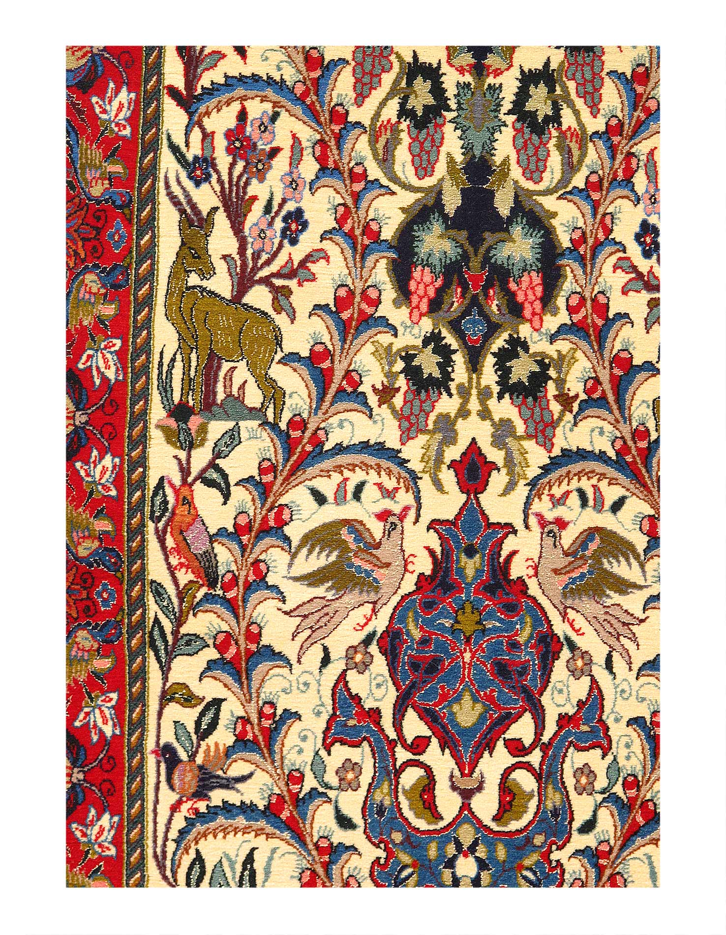 The Isfahan rugs are made with exceptionally good quality of wool & silk. They use traditional motifs inspired by architectural tiles that once decorated the historical buildings from which these rugs originated in. When it comes to high class designs the composition, patterns, and materials of Isfahan meets those expectations. The motifs usually consist of medallions with palmetts and also figural motifs. Isfahan rugs have an extremely high knot density and are woven with silk and golden threads, which give them their luxurious look.
