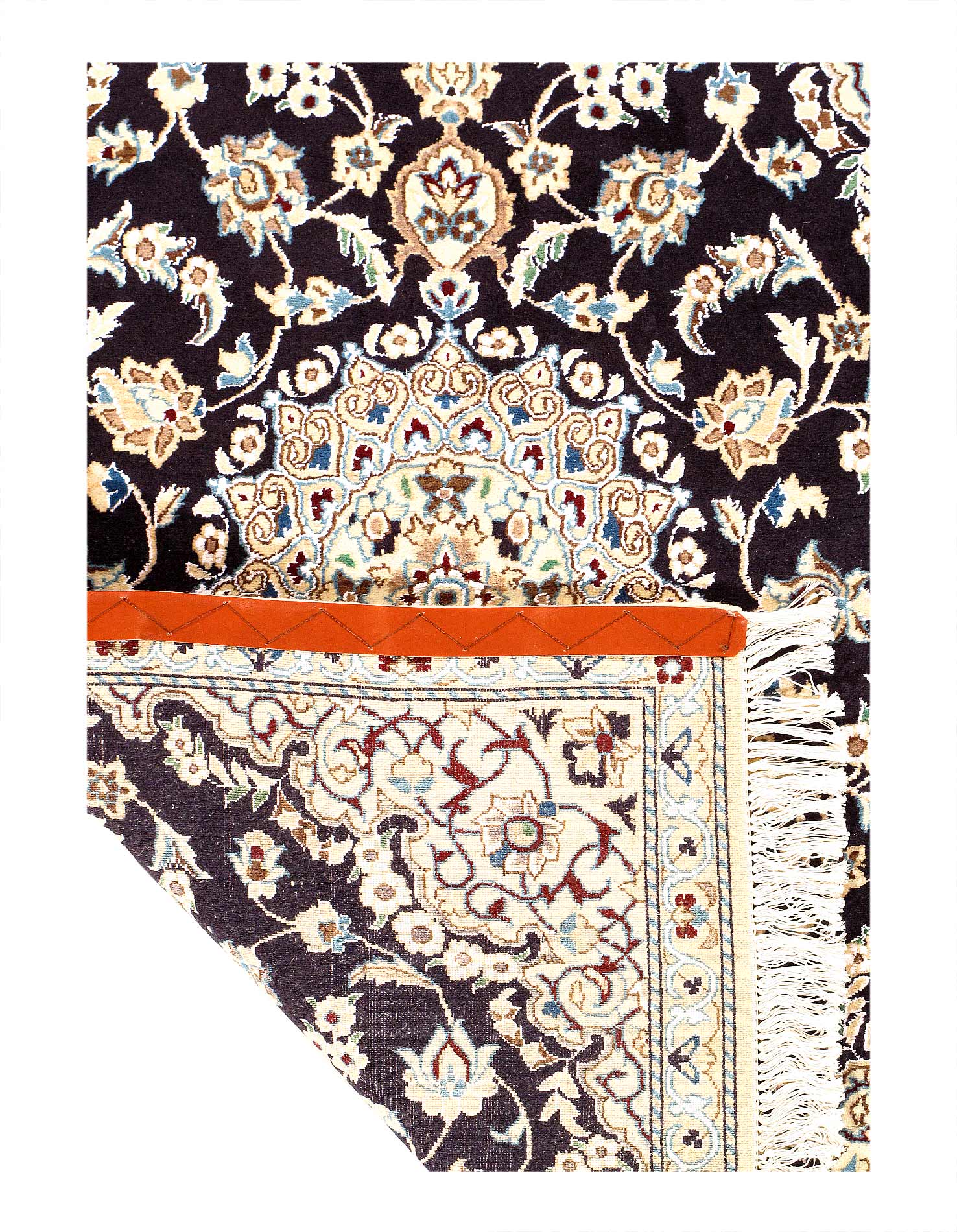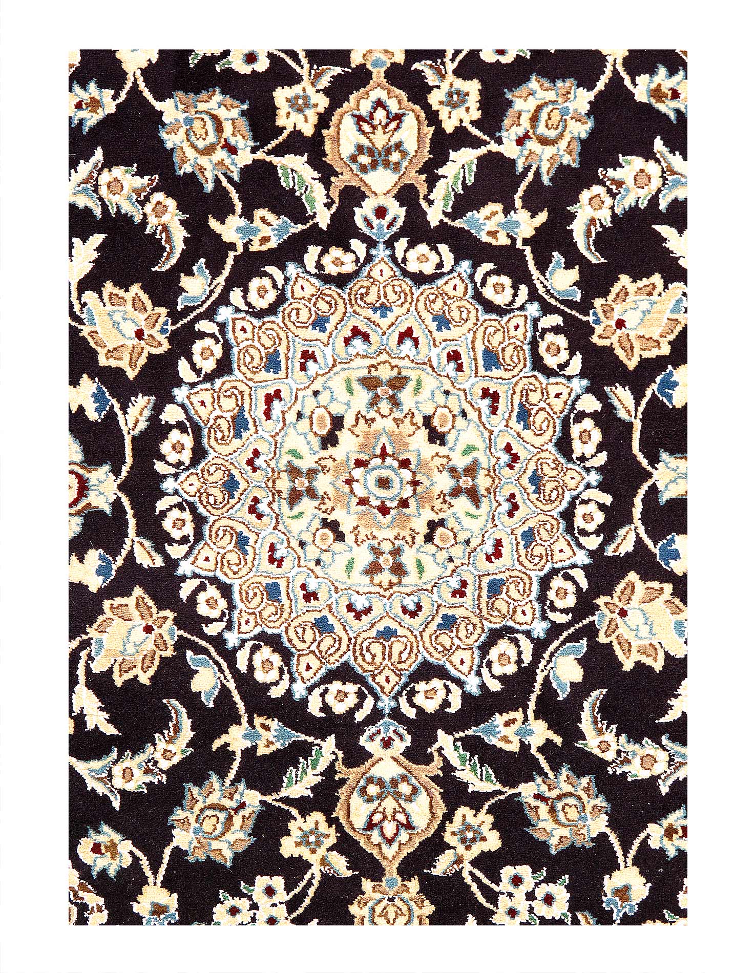 A hand-knotted, Nain rug that features gorgeous wool and silk and an ornate, tan and dark blue-ish/black field. This rug is from Persia.