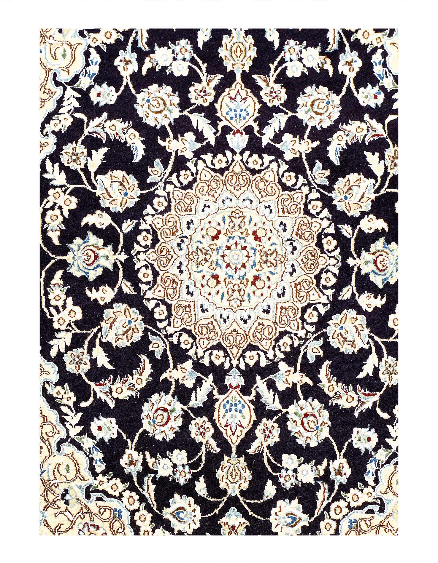A hand-knotted, Nain rug that features gorgeous wool and silk and an ornate, tan and dark blue-ish/black field. This rug is from Persia.