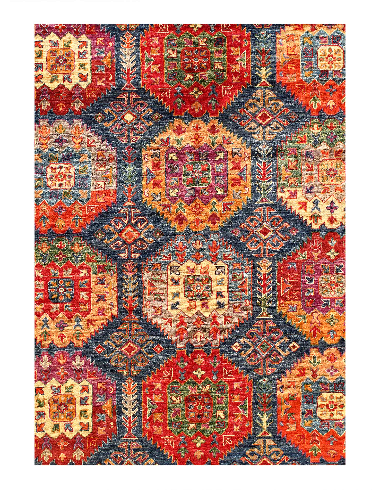 Turkman is a modern shape of old Caucasian rugs which strictly adheres to traditional design elements of the Caucasus. It has elements such as the stepped hooked polygons, geometrical medallions and rosettes, presented in more stylized manner and with a new dimension. Natural dyes produce soft luminous shades and abrashes causing a beautiful sheen. Handspun wool yarn is normally used in the variety of vibrant warm colors. Kazaks rugs in our collection are all fine quality pieces from Pakistan made with Ghazni handspun wool and natural dyes.