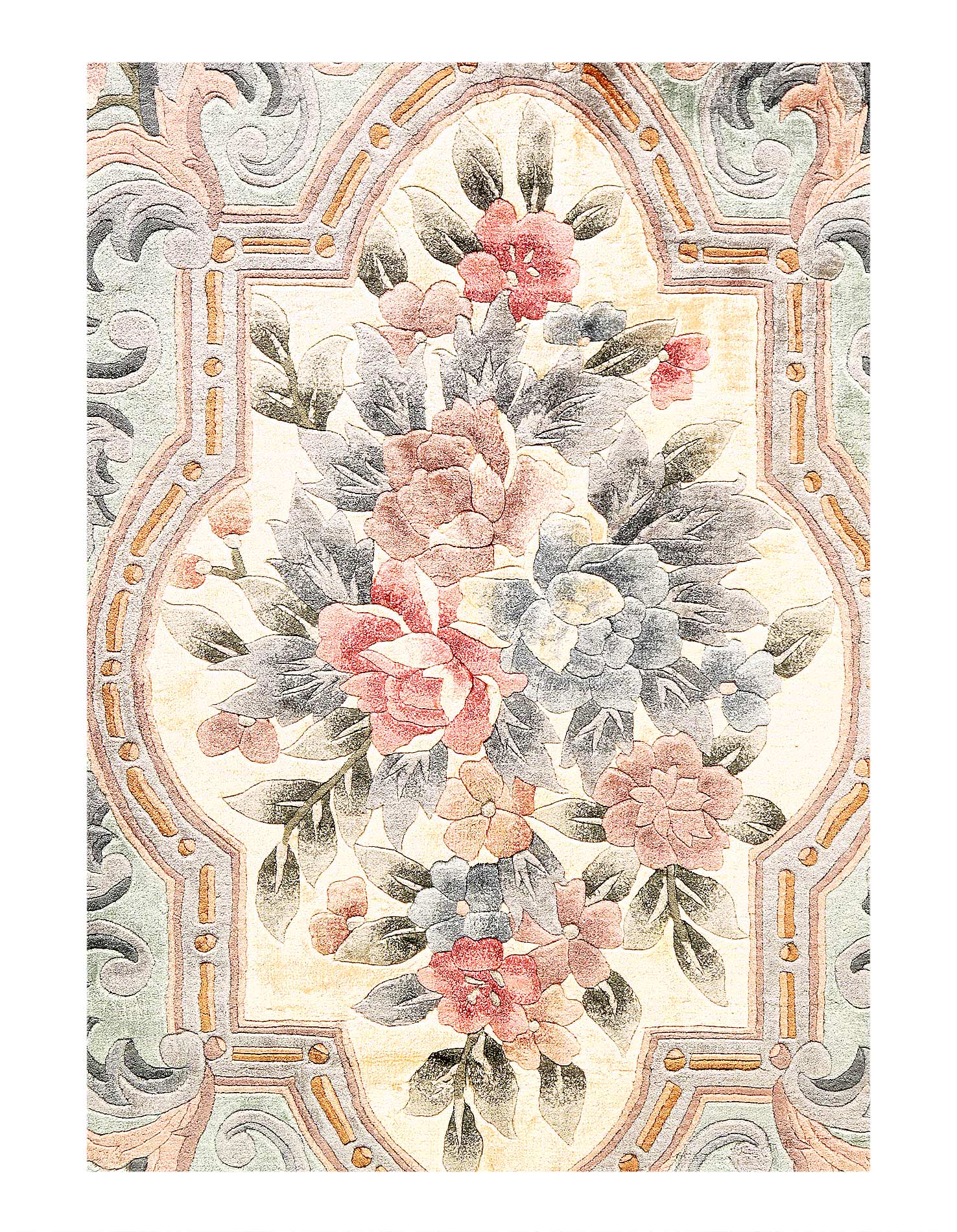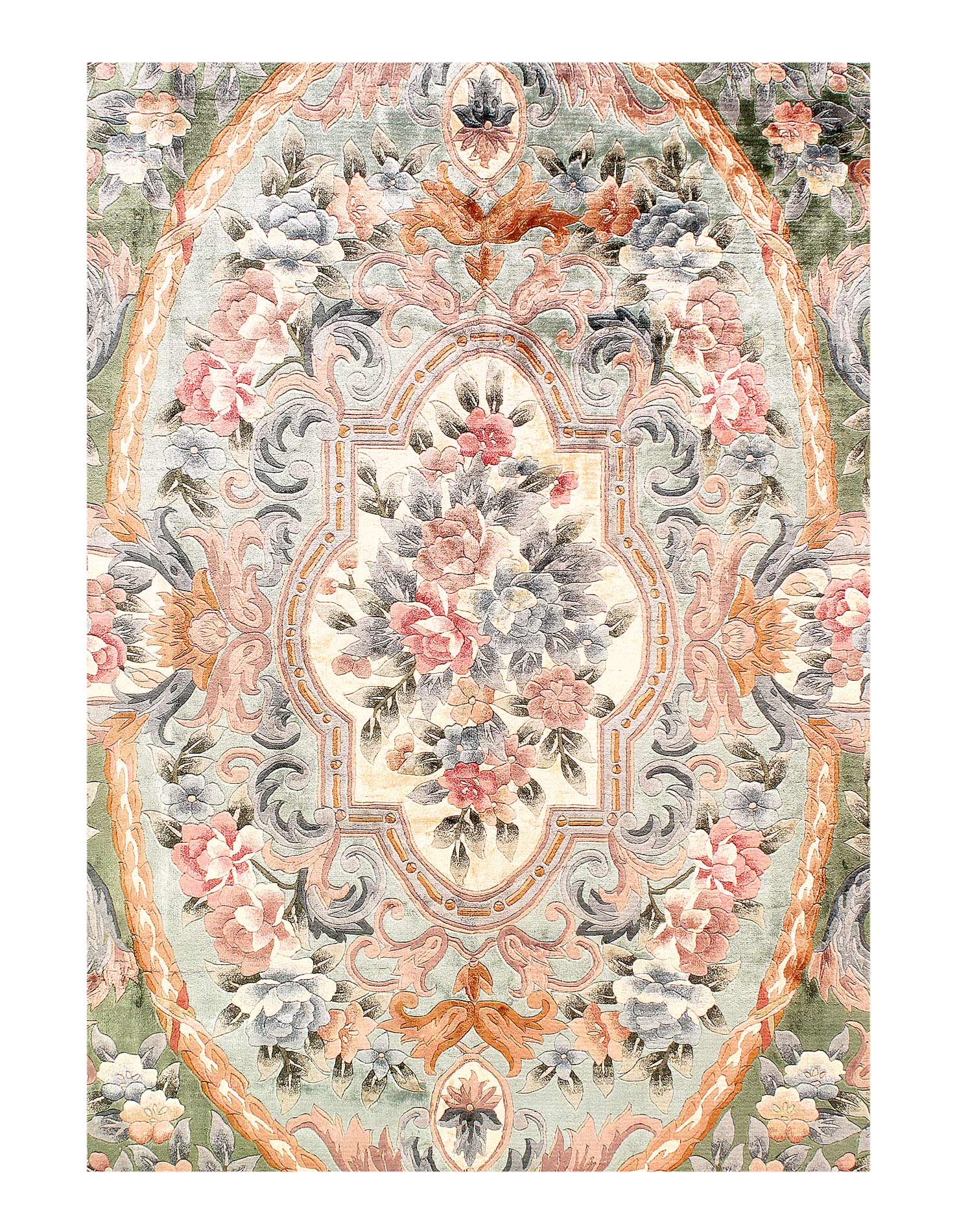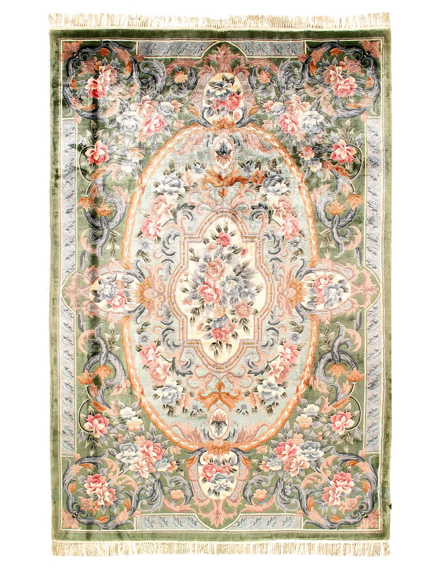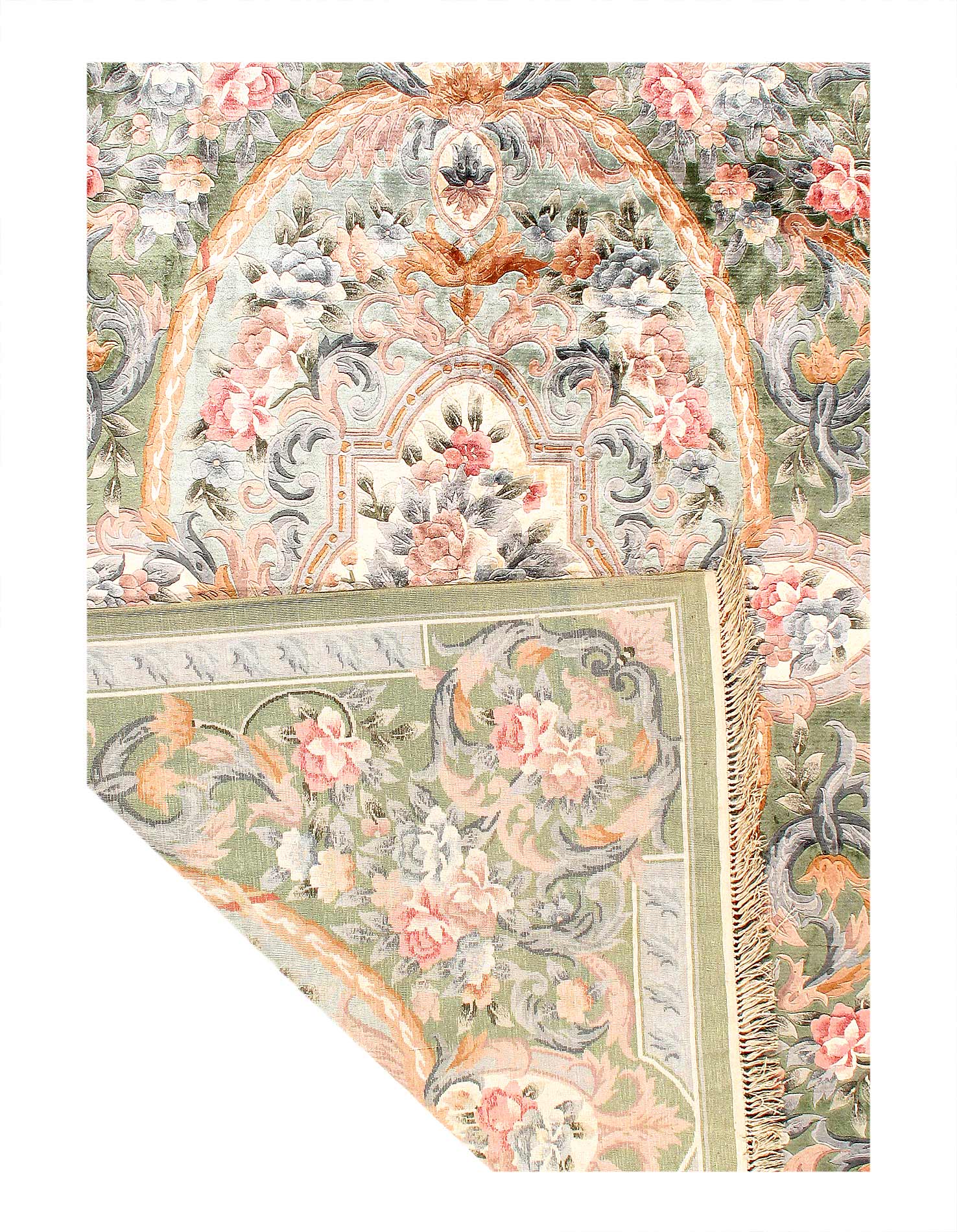 Delight in the plush Pure silk of this Chinese Aubusson Oriental rug. This Pure silk rug is hand-knotted for durability, and the soft colors make it ideal for a bedroom or Hallway