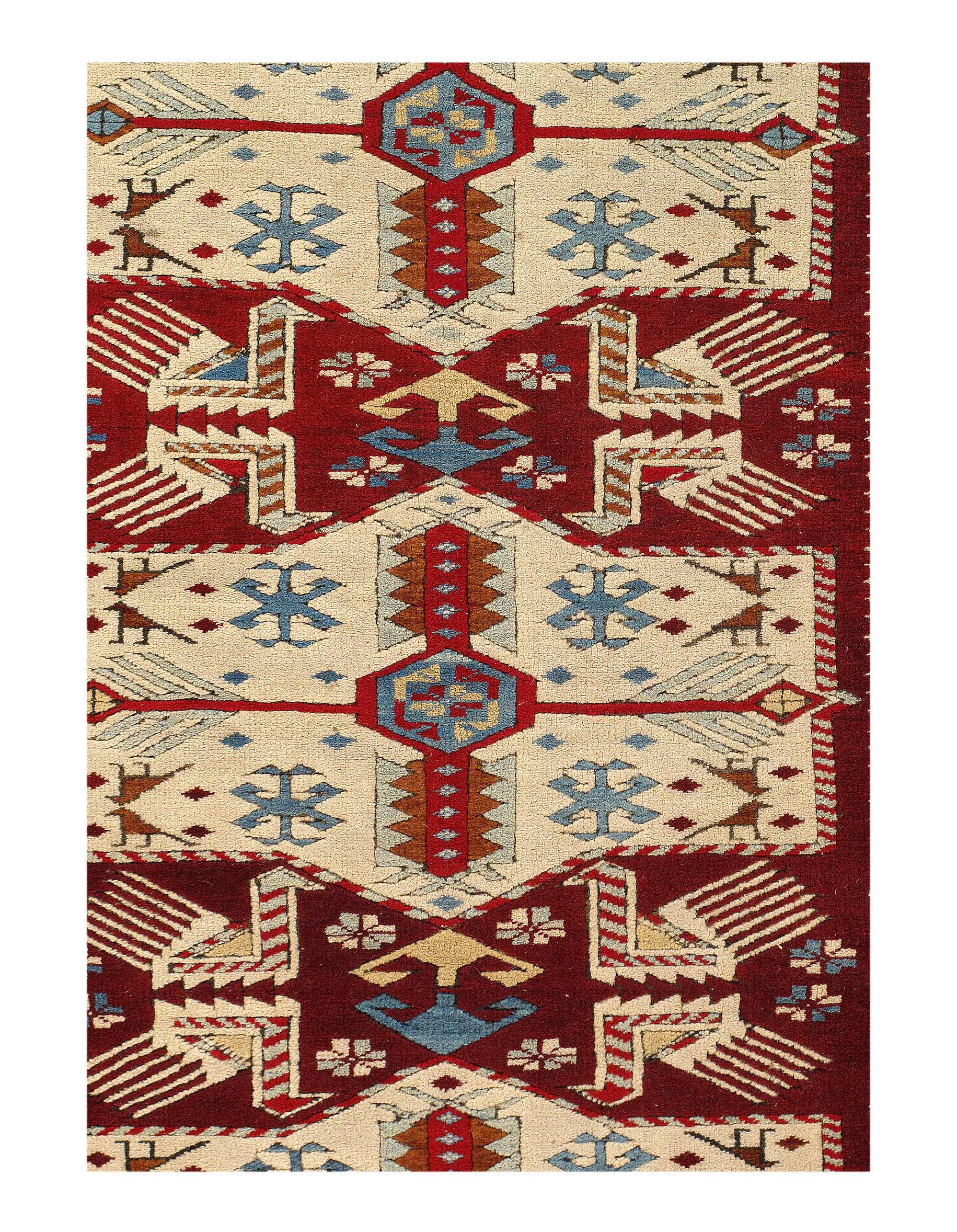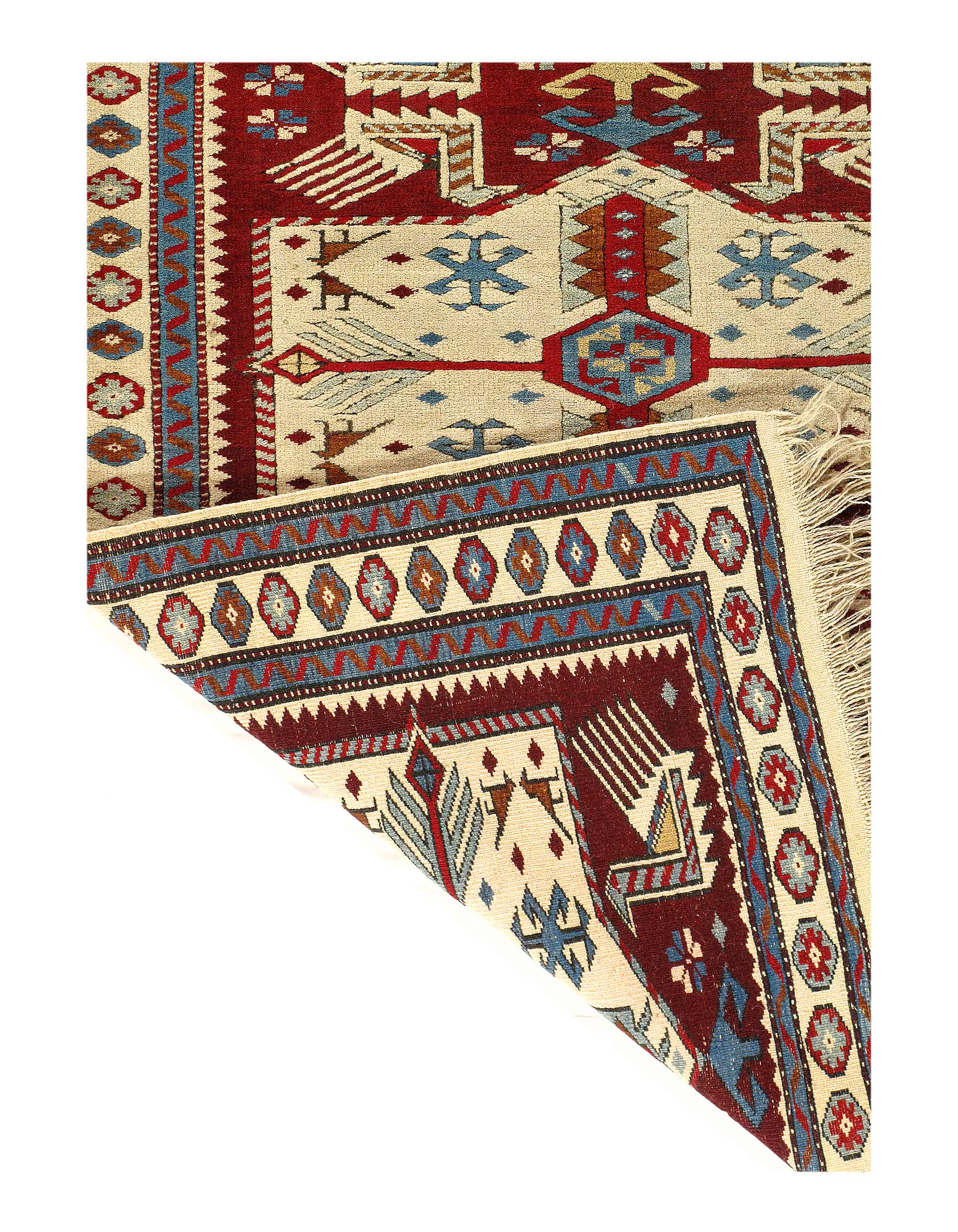 Kazak is a modern shape of old Caucasian rugs which strictly adheres to traditional design elements of the Caucasus. It has elements such as the stepped hooked polygons, geometrical medallions and rosettes, presented in more stylized manner and with a new dimension. Natural dyes produce soft luminous shades and abrashes causing a beautiful sheen. Handspun wool yarn is normally used in the variety of vibrant warm colors.