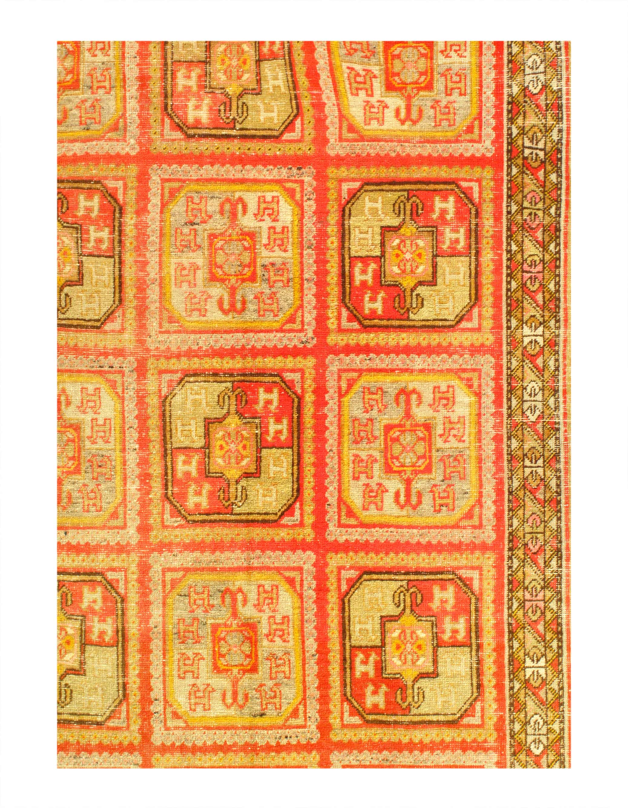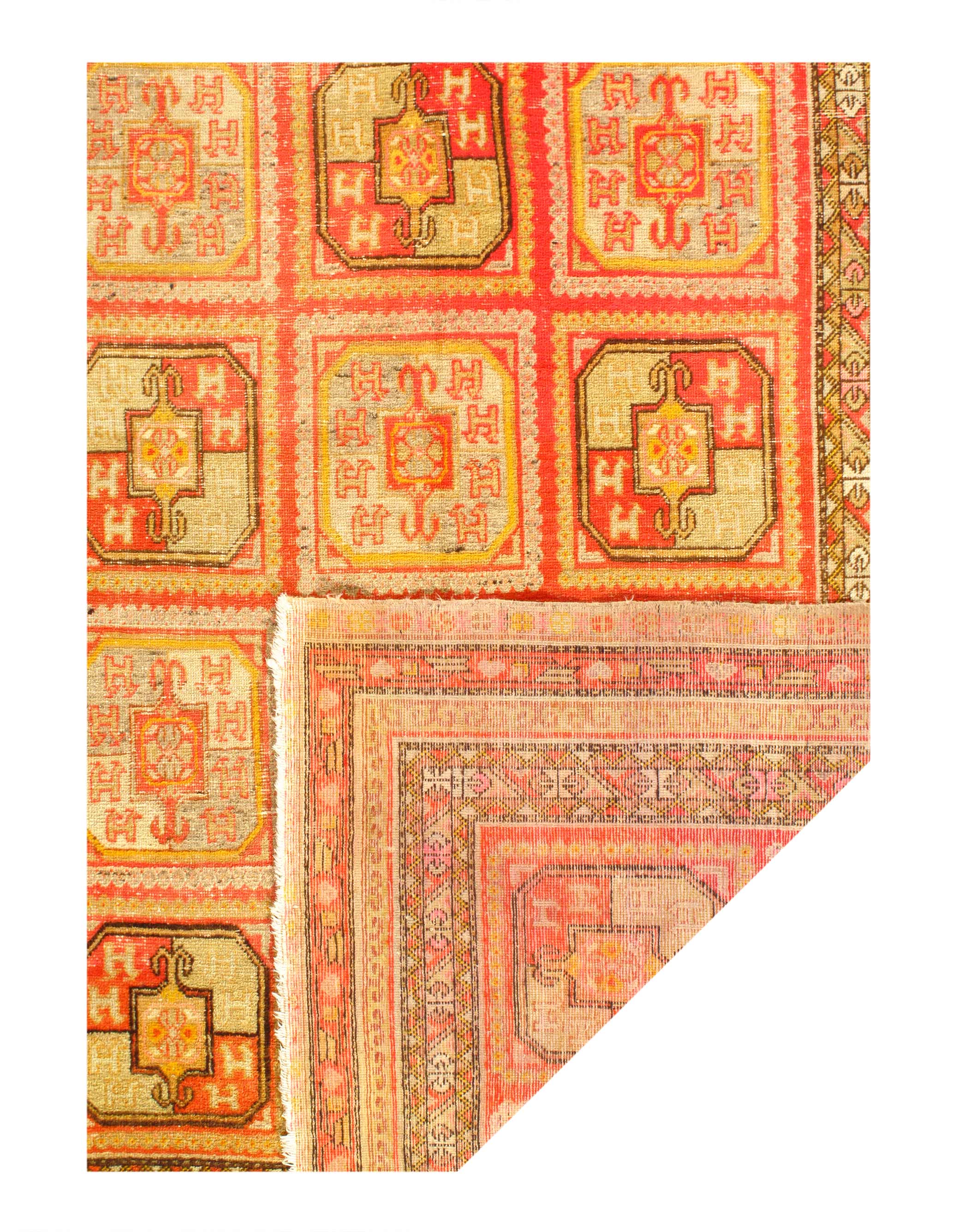 Originating from East Turkestan between 1920-1940, this antique transitional Khotan rug has a medallion-style field design with key cultural imagery from the region. Hand woven in high quality wool, the medallion field design employs an iconic pomegranate shrub design, symbolizing fertility, abundance, and growth—and the distinct choice of pomegranate red on beige further reflects this imagery. The sharp geometric spandrels at the corners of the field also indicate Oriental influence in the design, as special Khotan weavers have been known to feature Buddhist and Islamic imagery in their rugs. Quick and easy to clean .