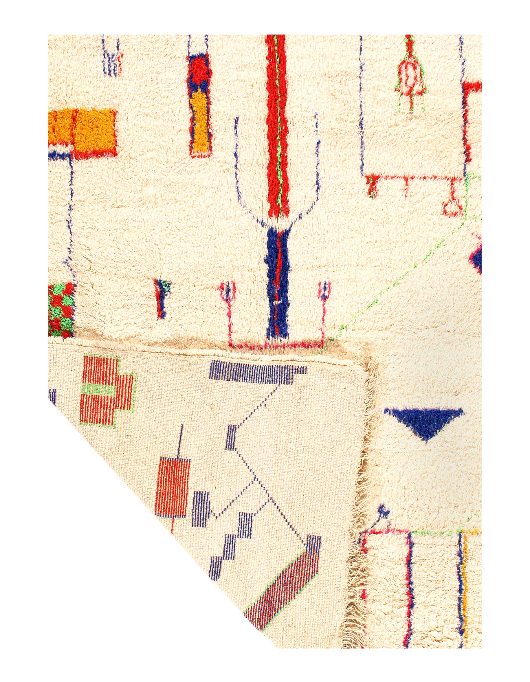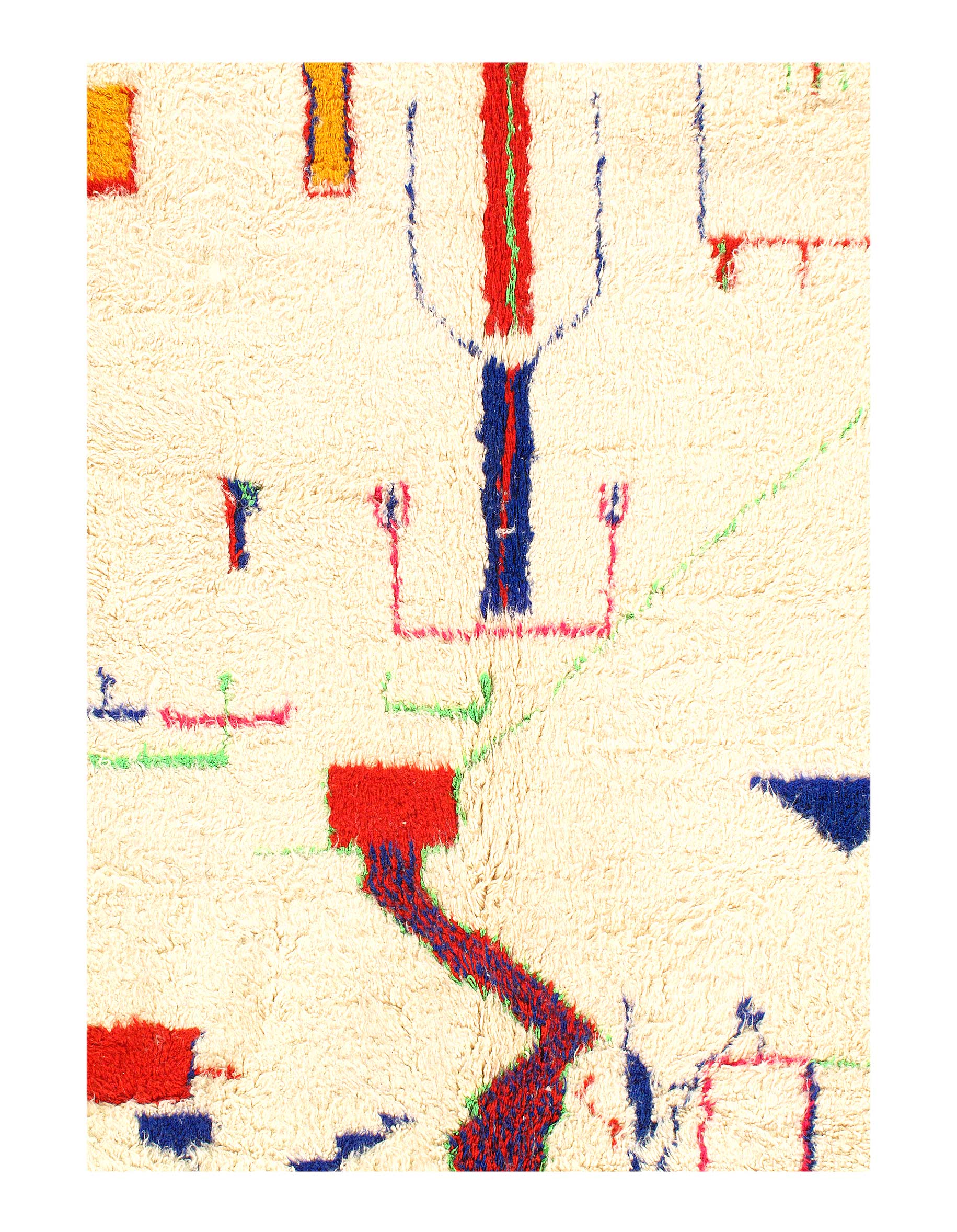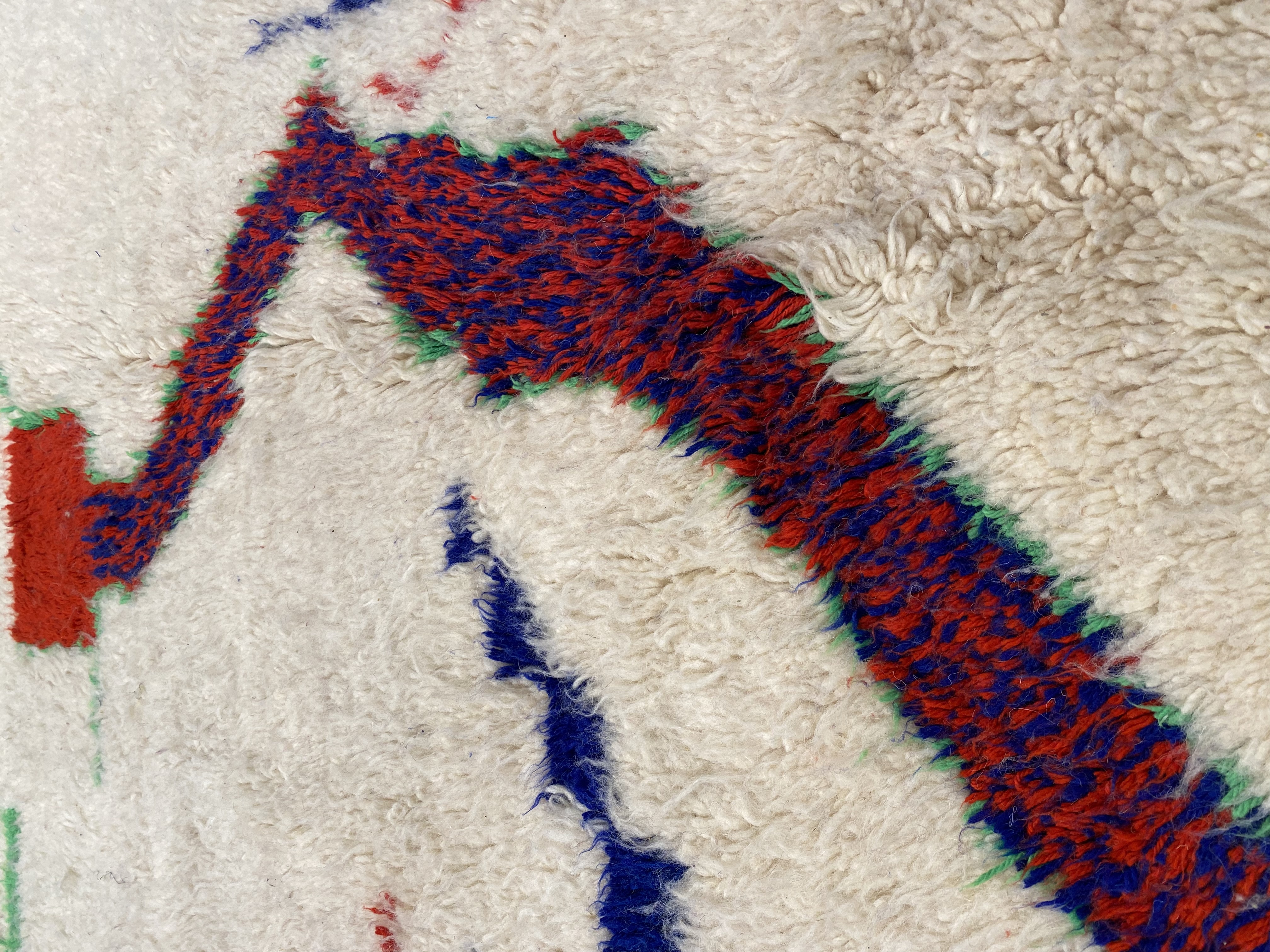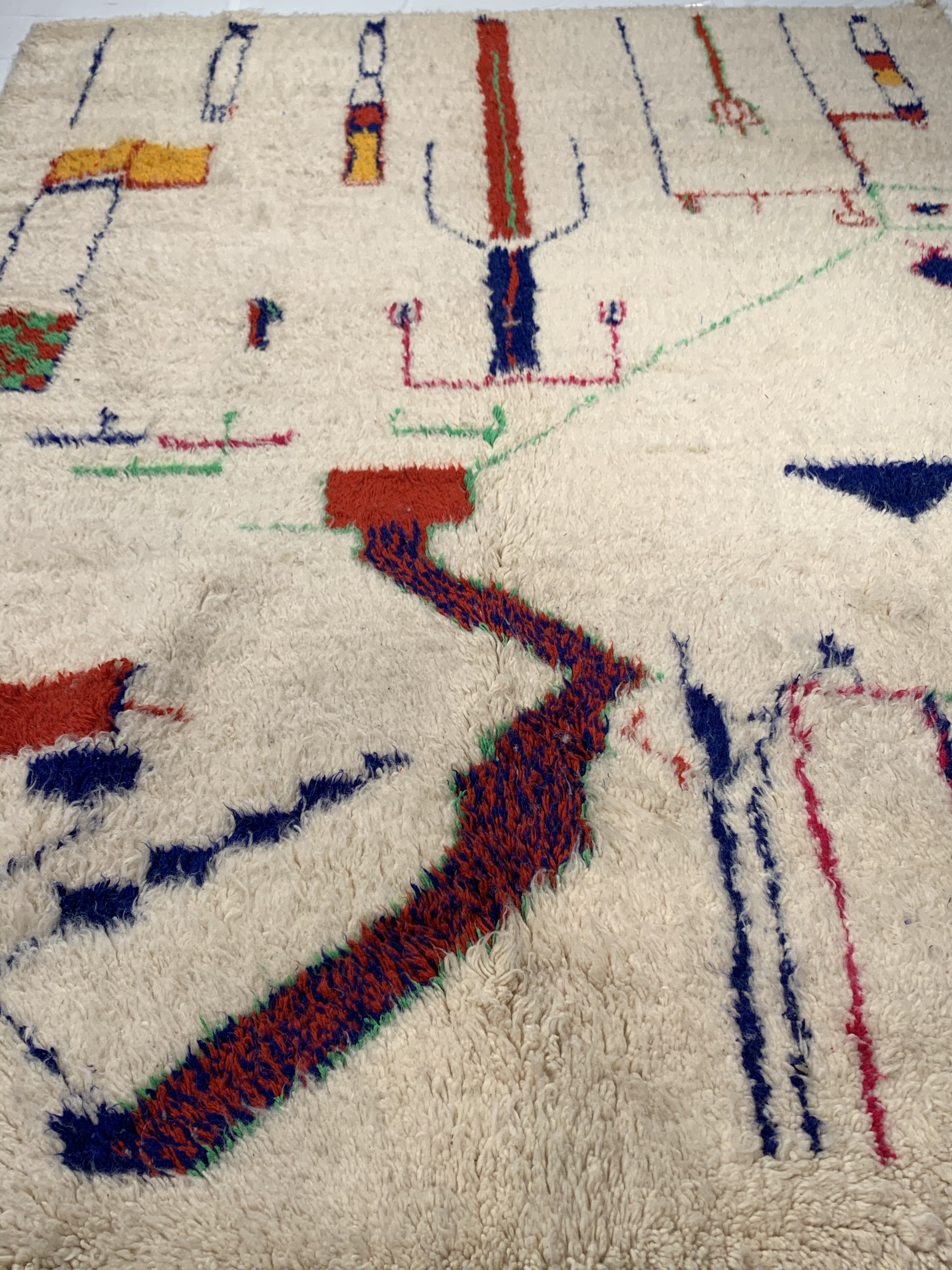 This is a true Moroccan magnum opus, full of art, vibrancy and character. Vintage rugs share the wisdom and elegance that comes with age, while still retaining its flair. These rugs have matured to allow the softening of the colours while extracting some of the natural Lanolin oil contained in the wool fibres to produce a beautiful finish.