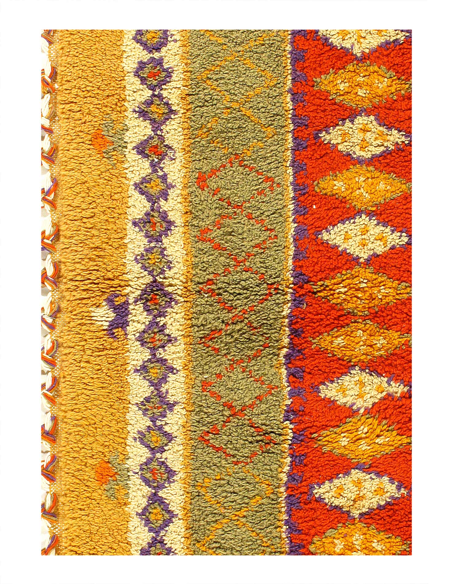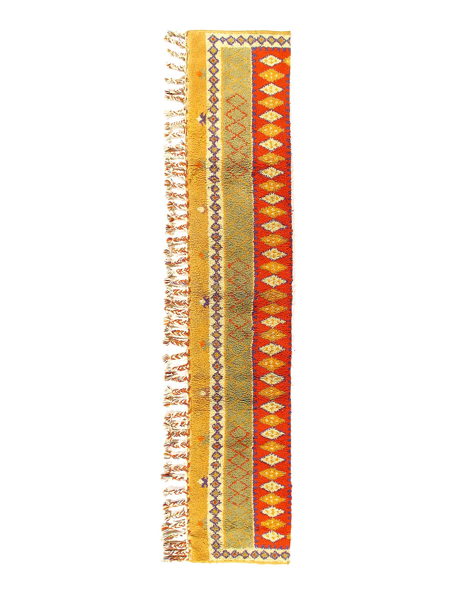 This beautiful and very long old runner has an array of open lozenges, diamond, and partial diamonds motifs organised within a simple meandering grid design. Woven in heavy mixed fibres the bold and bright colours have some charming sun fading, giving the piece an original soft patina. With some gentle wear.
