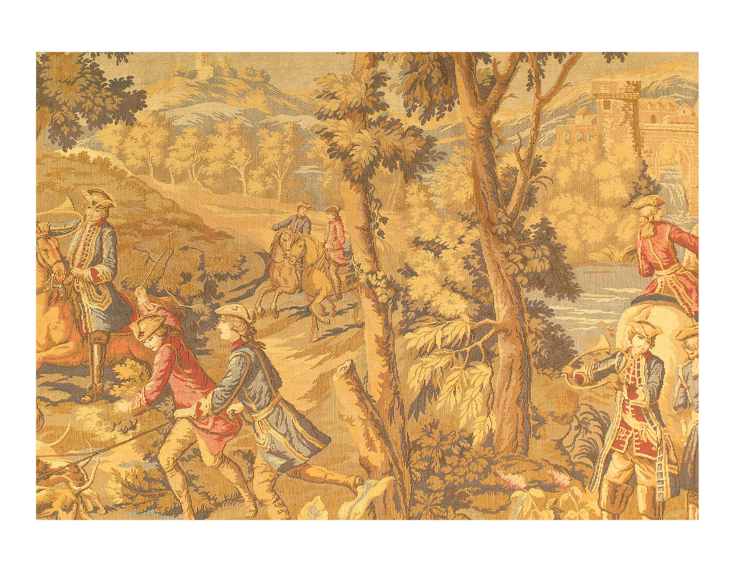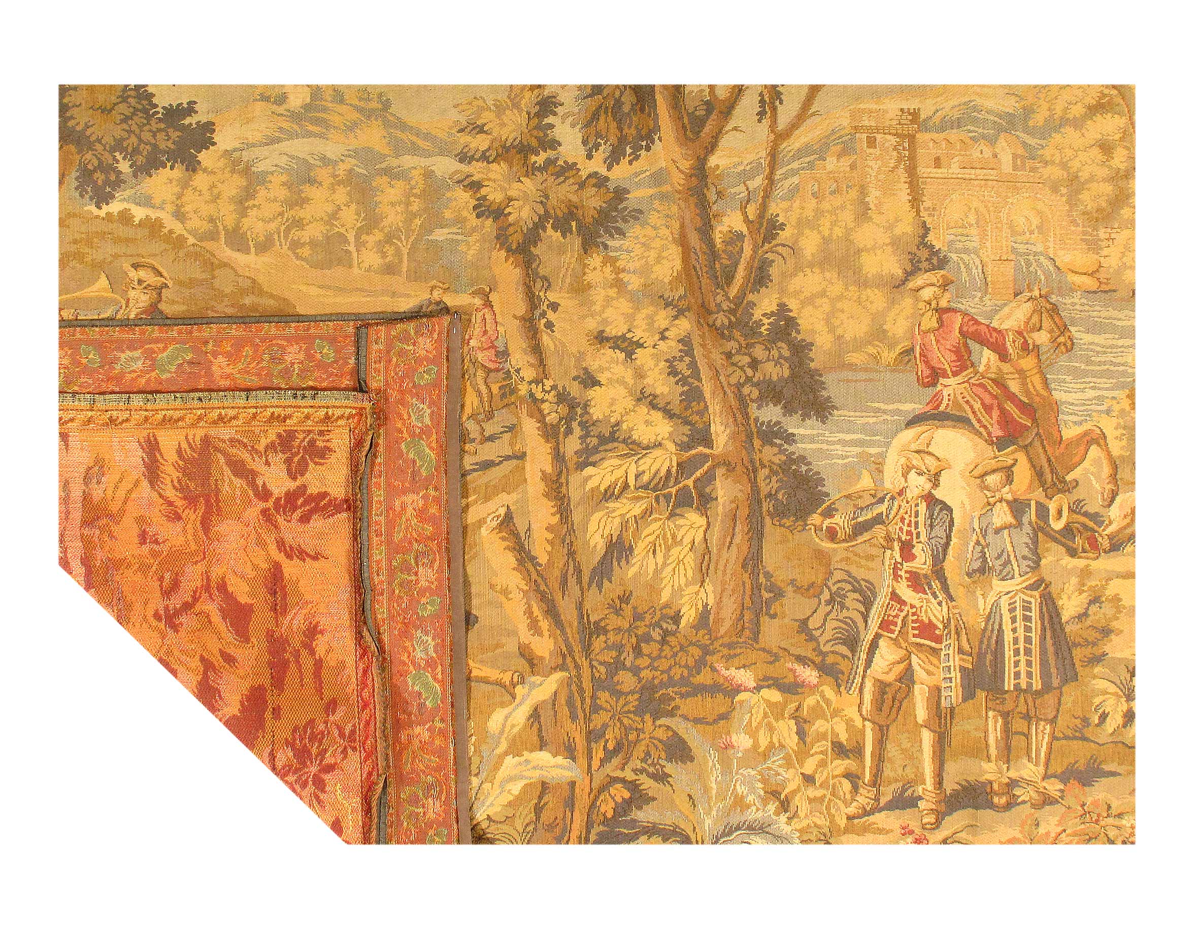 French Tapestry, France – Here is a truly wonderful rug – a tapestry made in France. This rug represents something genuinely special, and is a testament to the artisans who produced it. A beautiful piece, this rug possesses many of the qualities most sought after by collectors and experts, and would bring beauty and sophistication to any home. Surrounded by an archetypal floral border, this naturalist tapestry from France features a pastoral forest scene with rocks, plants, grasses, vines and trees extending into the distance. Detailed shading adds depth and dimension to the craggy rocks, textural tree bark and shadowy foliage while the scalloped leaves in the tree canopy evoke a vague oriental influence. Simply put, this rug is a remarkable piece of work. A lovely and elegant design and composition combine to make this rug something more than a decorative piece: they combine to make it a veritable work of art