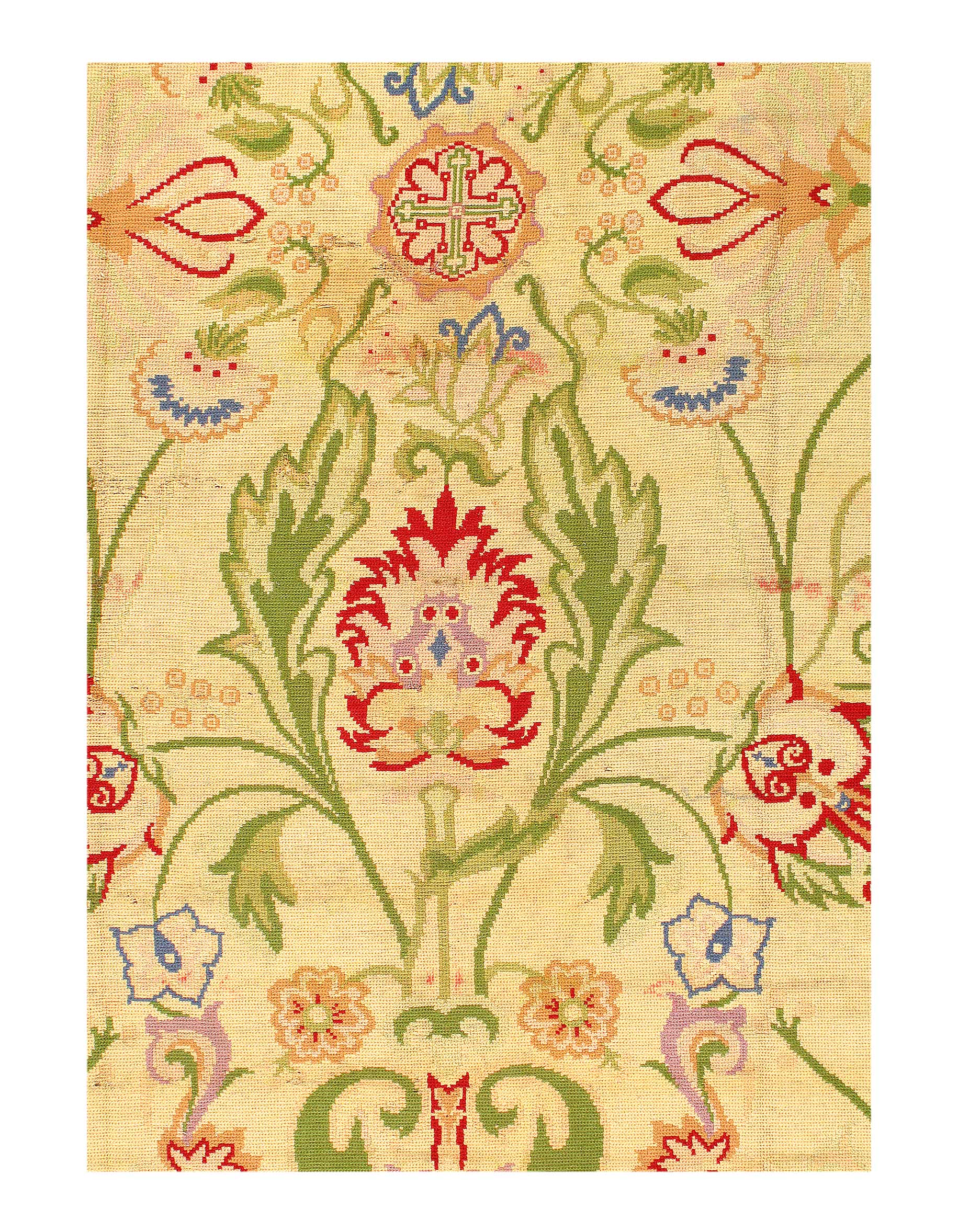 This entire antique carpet is simply charming and would make an excellent addition to many different styles. It has an Arts and Crafts feel, or perhaps it could be considered farmhouse. It would be the perfect addition to a traditional or historical room. As a collector’s piece, it is a significant piece, not only for its splendid design but also for its place in the history of the needlewomen of Arraiolos.