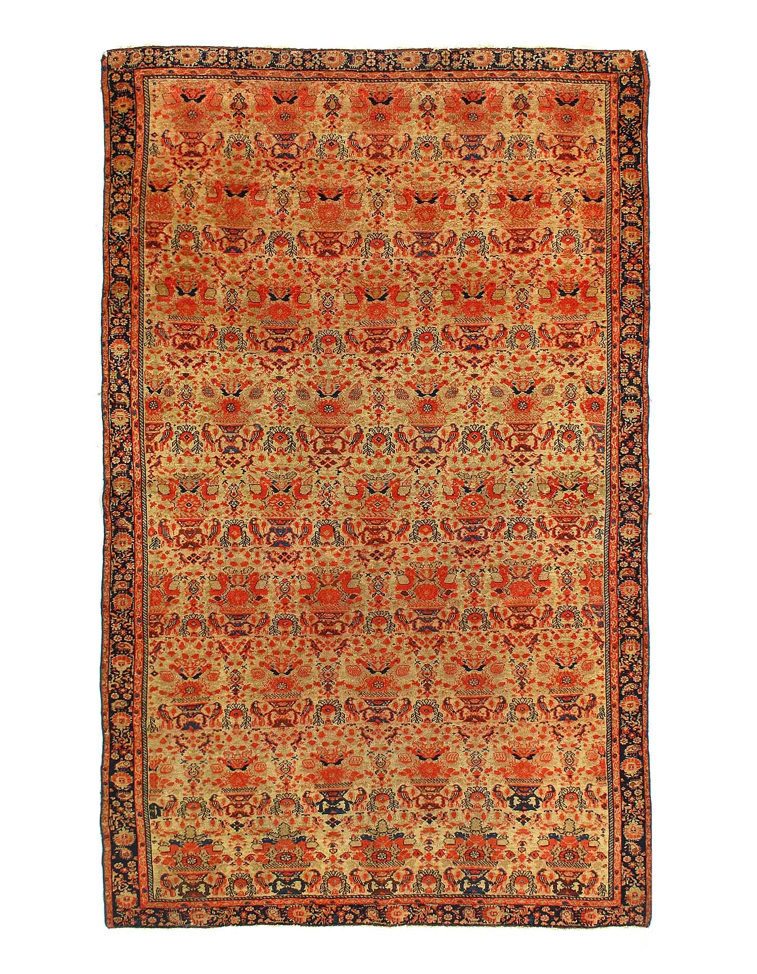 Antique rugs from the Malayer region constitute an important and distinctive group of Persian weavings. Technically they stand between those made in nearby Senneh and Hamadan. They were produced in a range of medallion and allover designs which, although they come from classical Persian sources, tend to be somewhat abstract or geometricized in their rendering. Sometimes Malayer carpet designs can utilize small-scale and fine forms like the Herati pattern, but they can also combine such features with larger composition schemes and the use of open, empty space. Their coloration is generally soft but varied. Malayer rugs have a quiet formality and reserve that makes them excellent decorative pieces for elegant settings.
