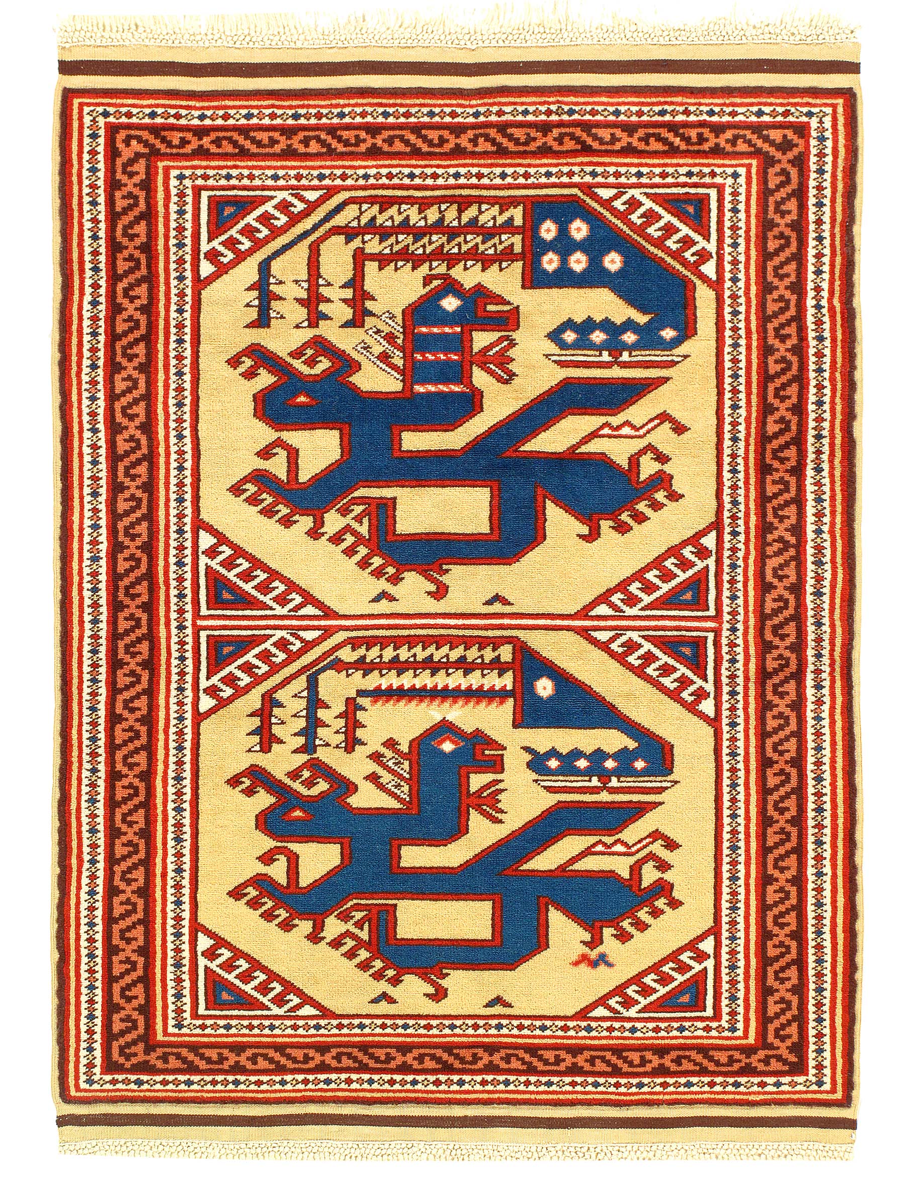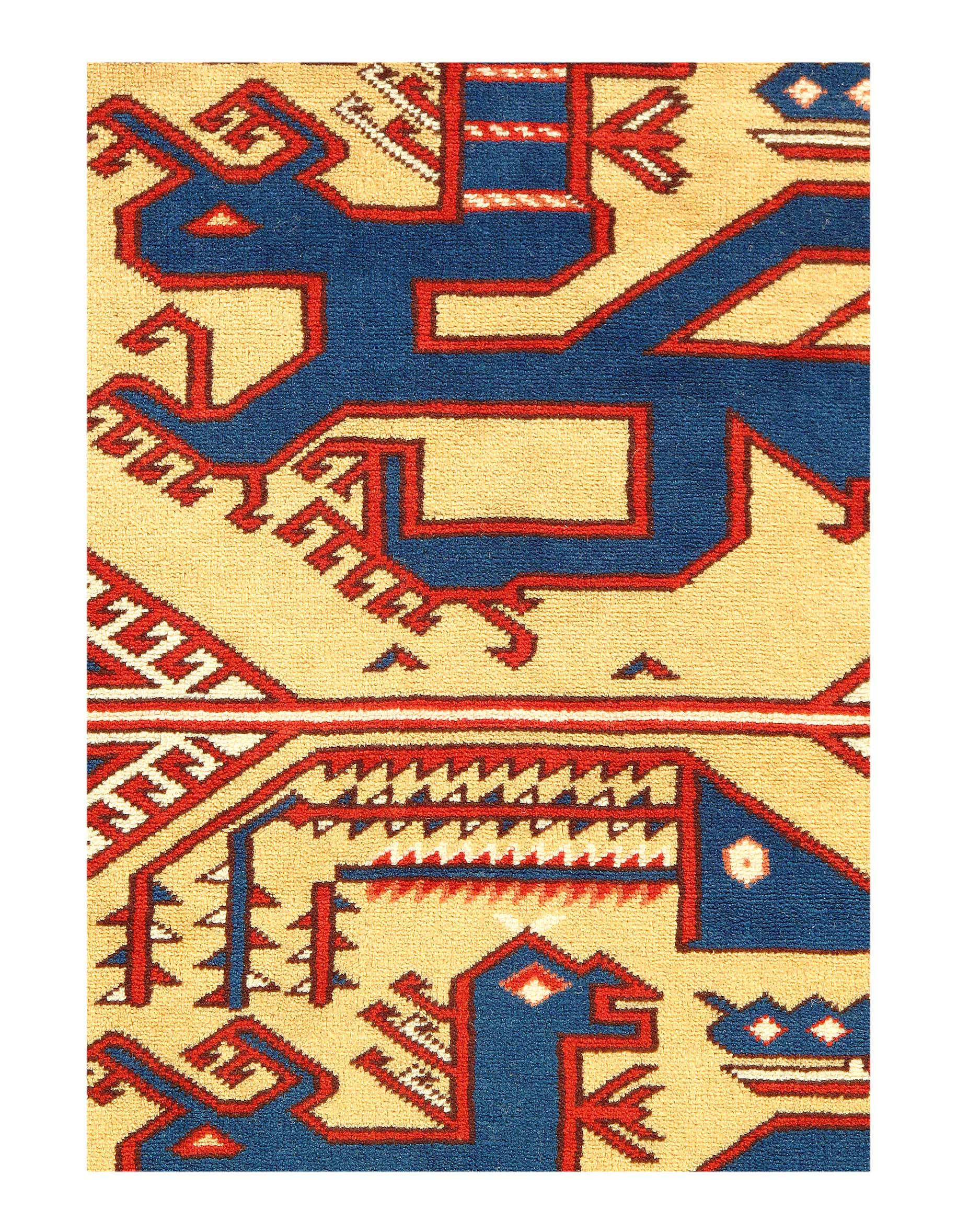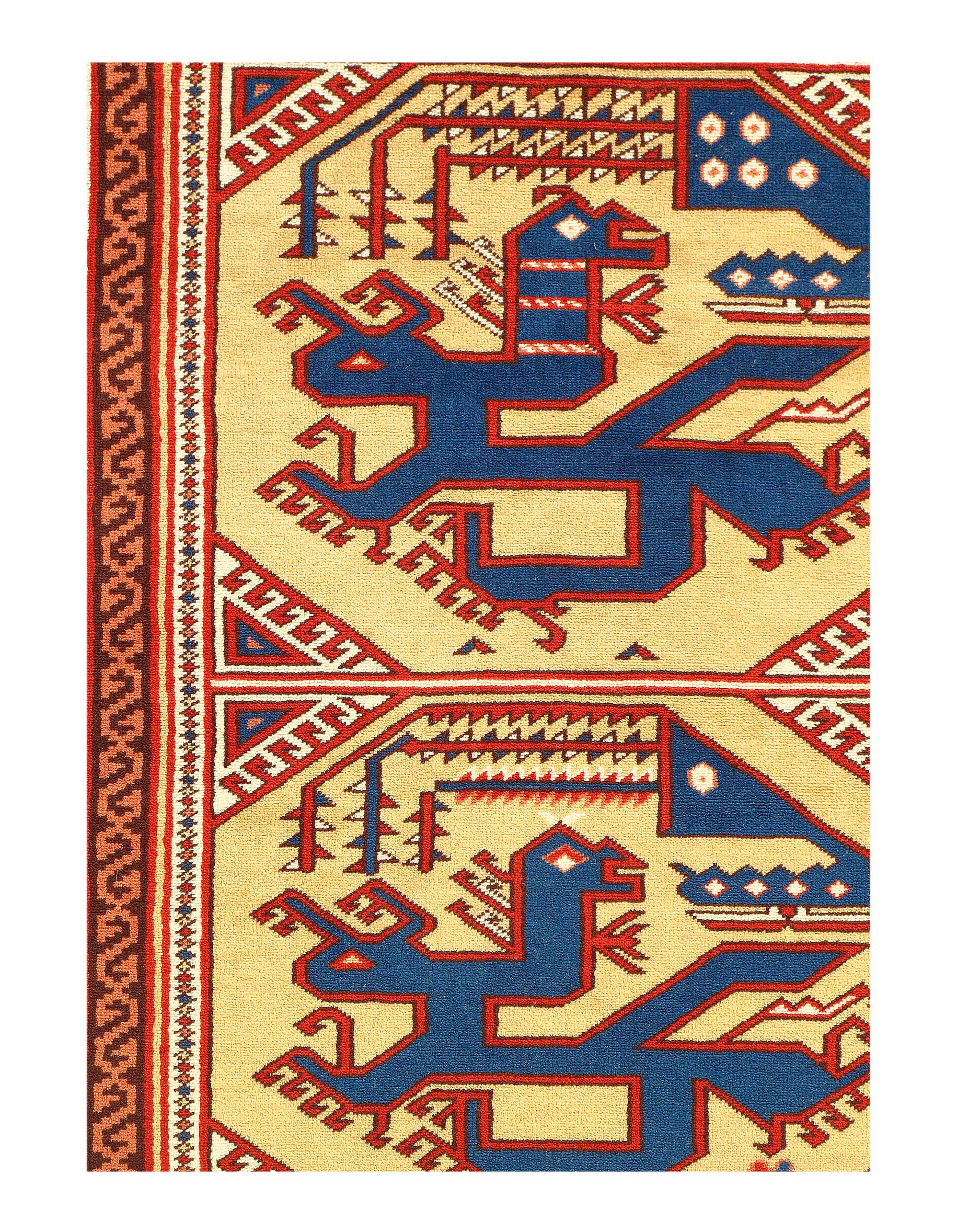 Today's Kazak is a modern shape of old Caucasian rugs which strictly adheres to traditional design elements of the Caucasus. It has elements such as the stepped hooked polygons, geometrical medallions and rosettes, presented in more stylized manner and with a new dimension. Natural dyes produce soft luminous shades and abrashes causing a beautiful sheen. Handspun wool yarn is normally used in the variety of vibrant warm colors. Kazaks rugs in our collection are all fine quality pieces from Pakistan made with Ghazni handspun wool and natural dyes.