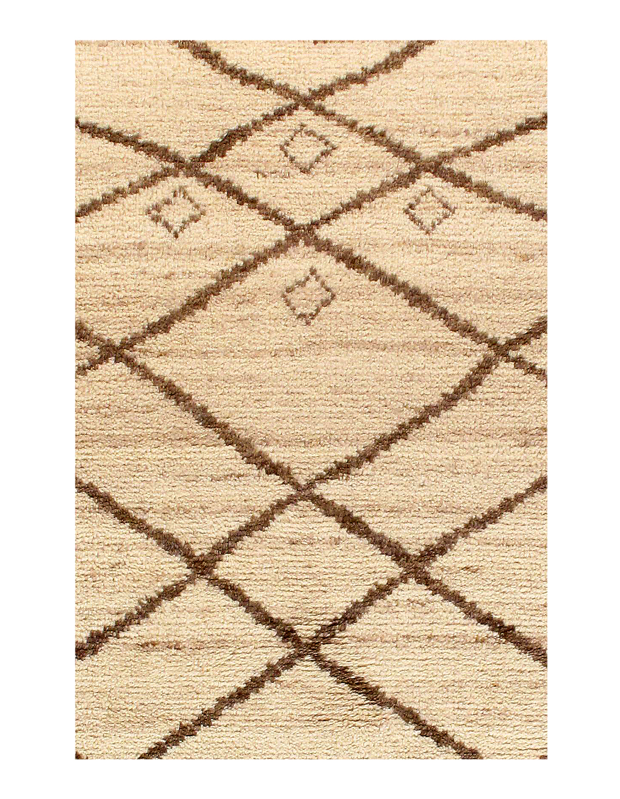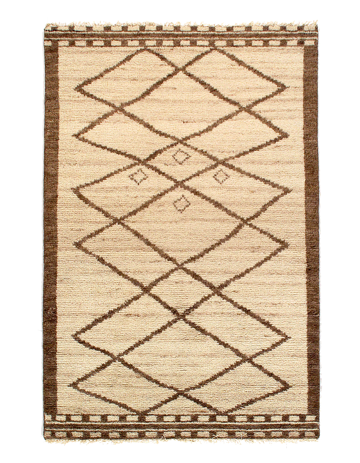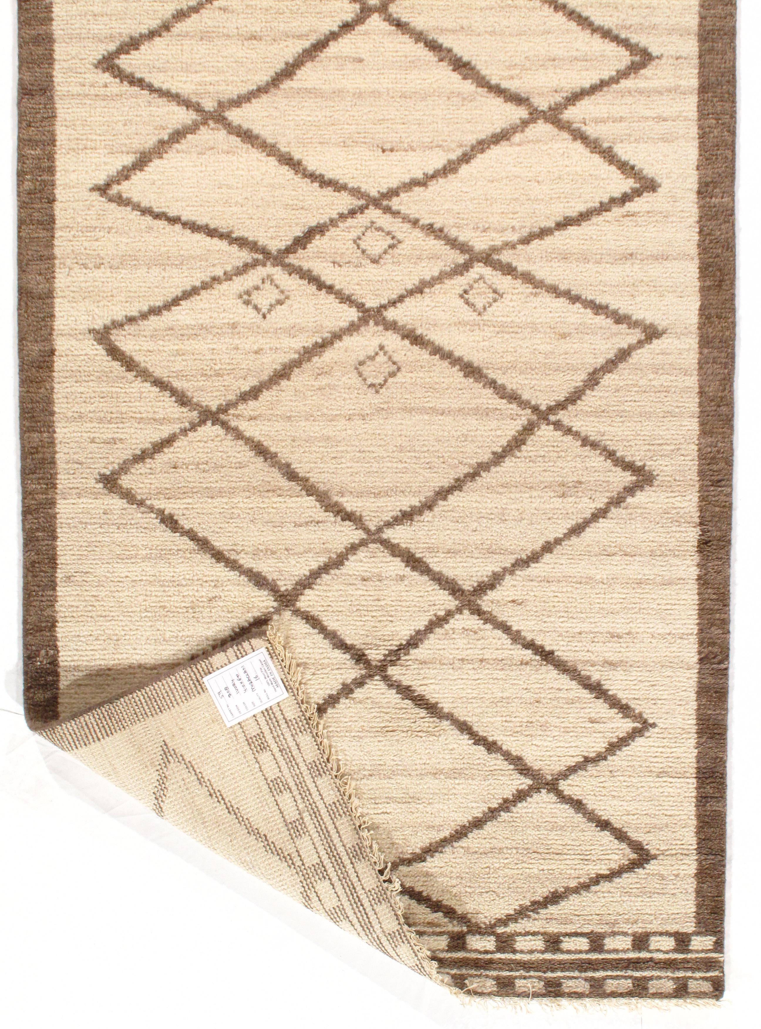 Moroccan designed piece in contrasting light and dark brown features a modern design of overlapping lines that create a diamond-patterned mesh. The rich tone of the darker hue is reminiscent of a warm mocha, accented by the lavish creaminess of the field backing the pattern. The irregular network features some paired lines, moving together in parallel across the light field. In some places, the lines break or stray, creating unique irregularities across the indian rug. The lines are imperfectly straight, curving in tandem to create visual contrast. A thick, plush texture gives the fine line-work an added appeal, its softness offsetting the unambiguous modernity.