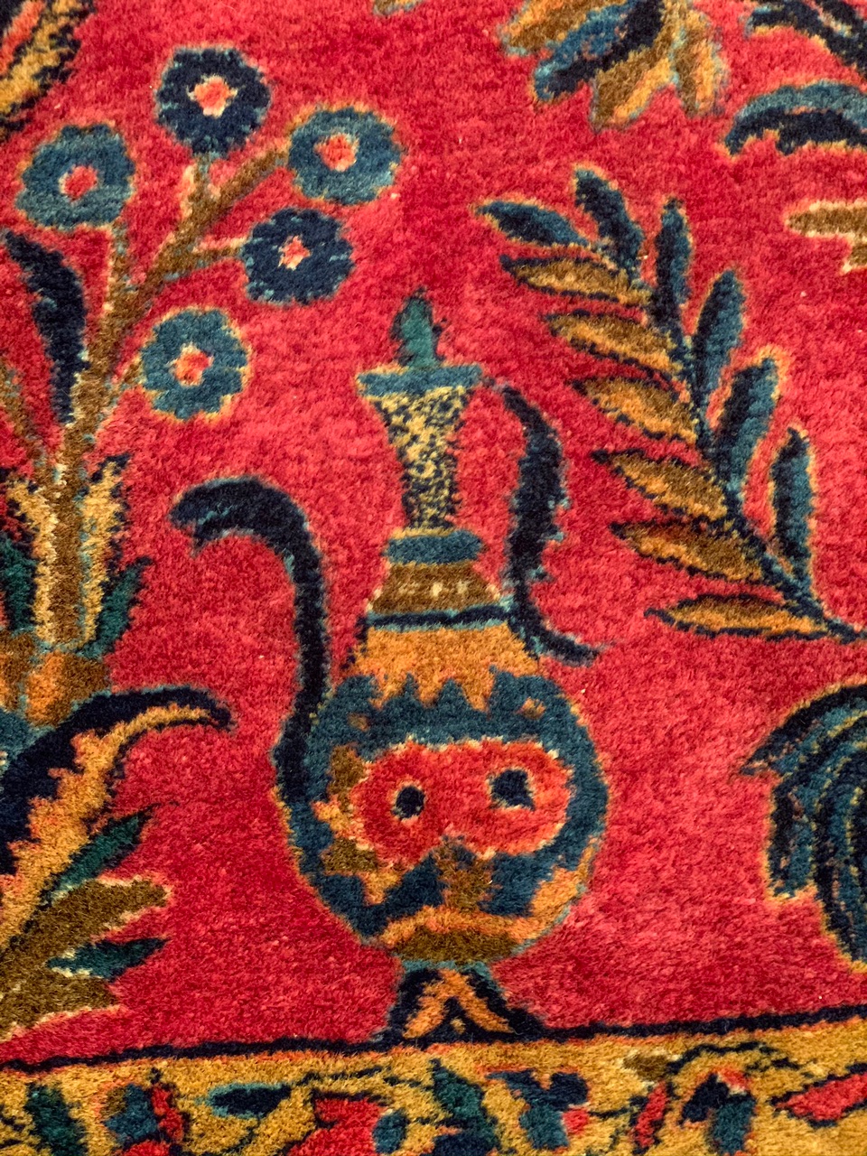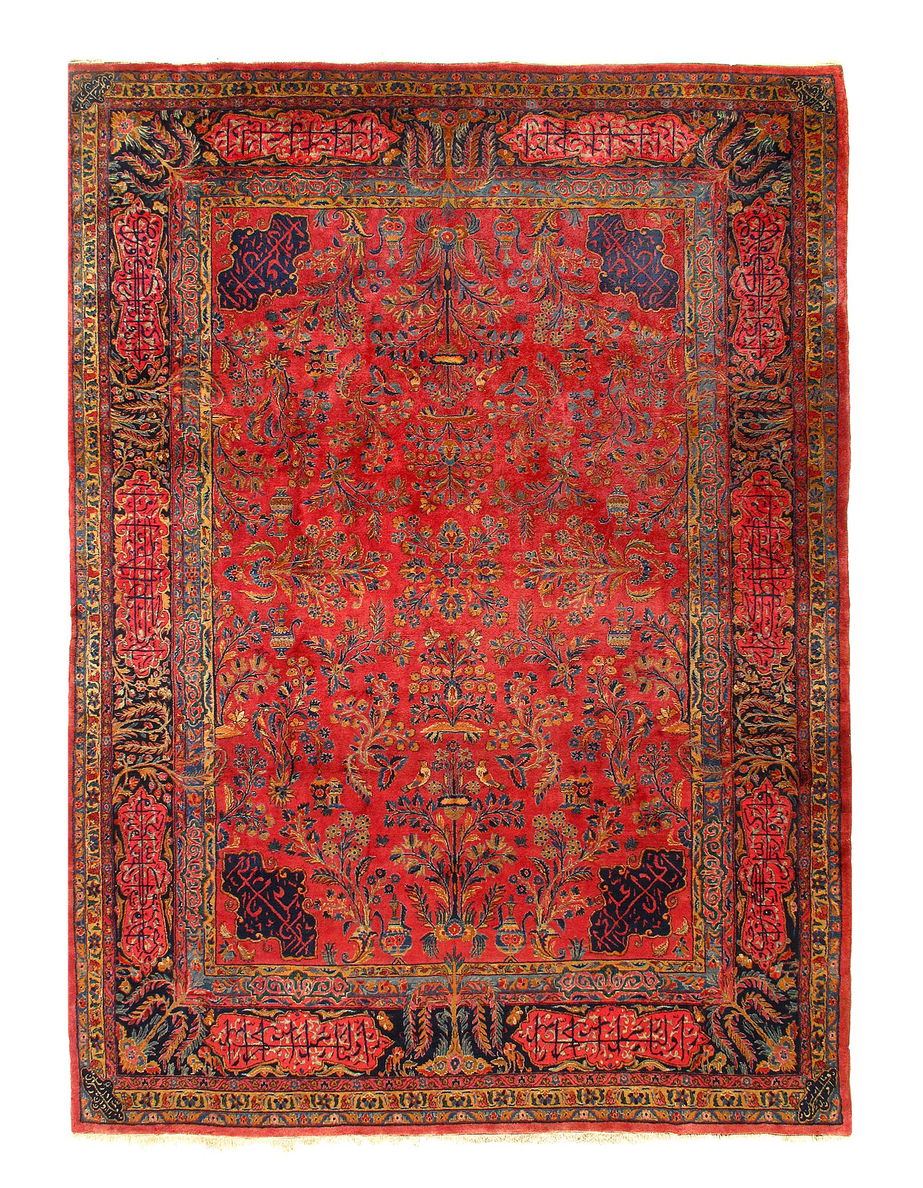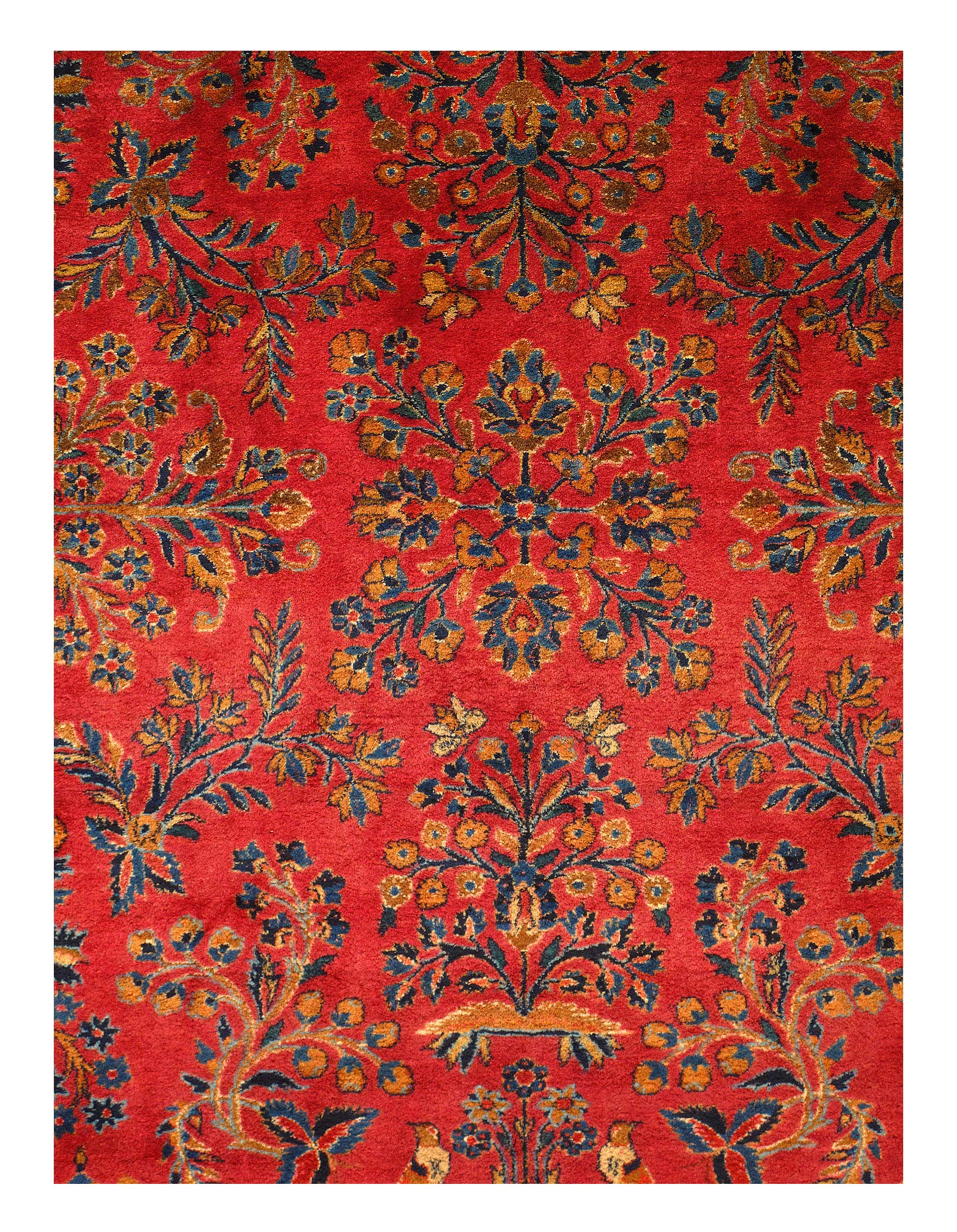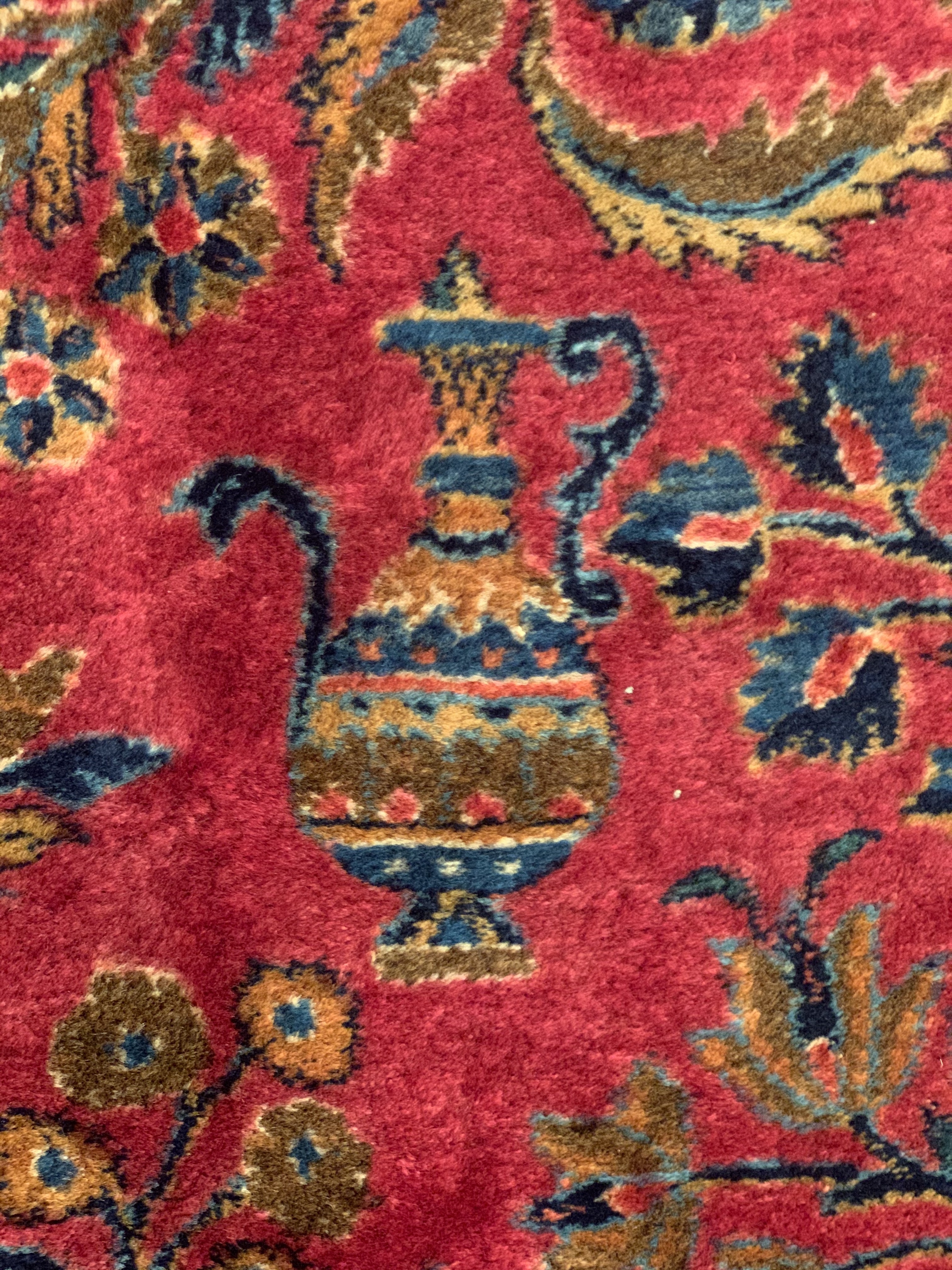 This carpet creates an eye-catching visual impact with its colors. Throughout the design, you will notice stylized willow trees that are arranged to make them look like flickering flames from a distance. This gives the piece motion and reflects incredible artistic skill. The motifs in the design are reminiscent of the tiles found throughout the Islamic world.