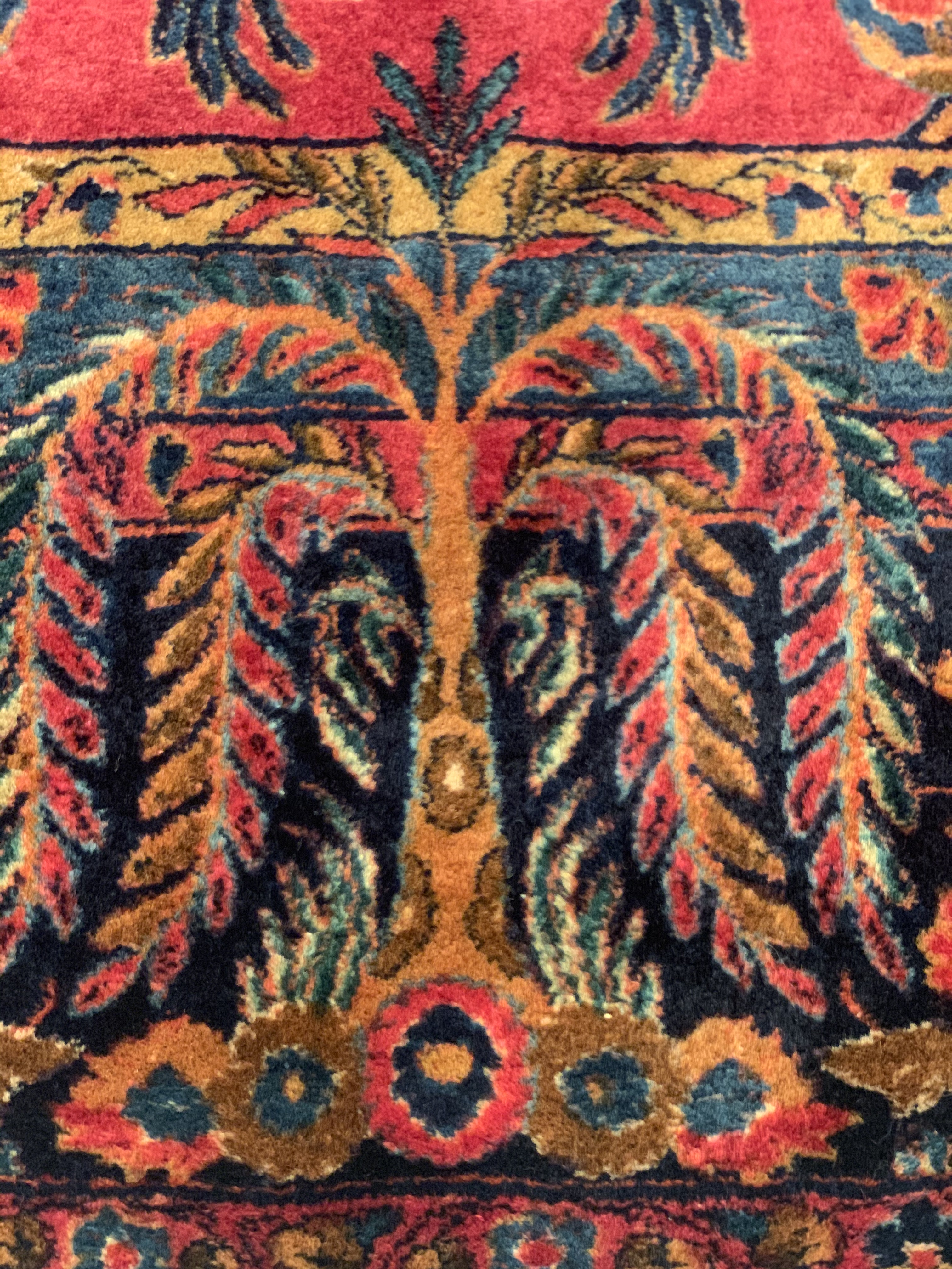 This carpet uses a colorful all over design based on repeating geometric patterns. The Garden of Paradise is a common source of inspiration for Kashan weavers and was the inspiration for the abundance of plants in this carpet, but the treatment of the theme is nontraditional.