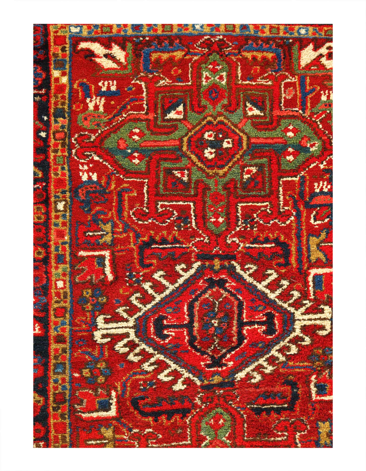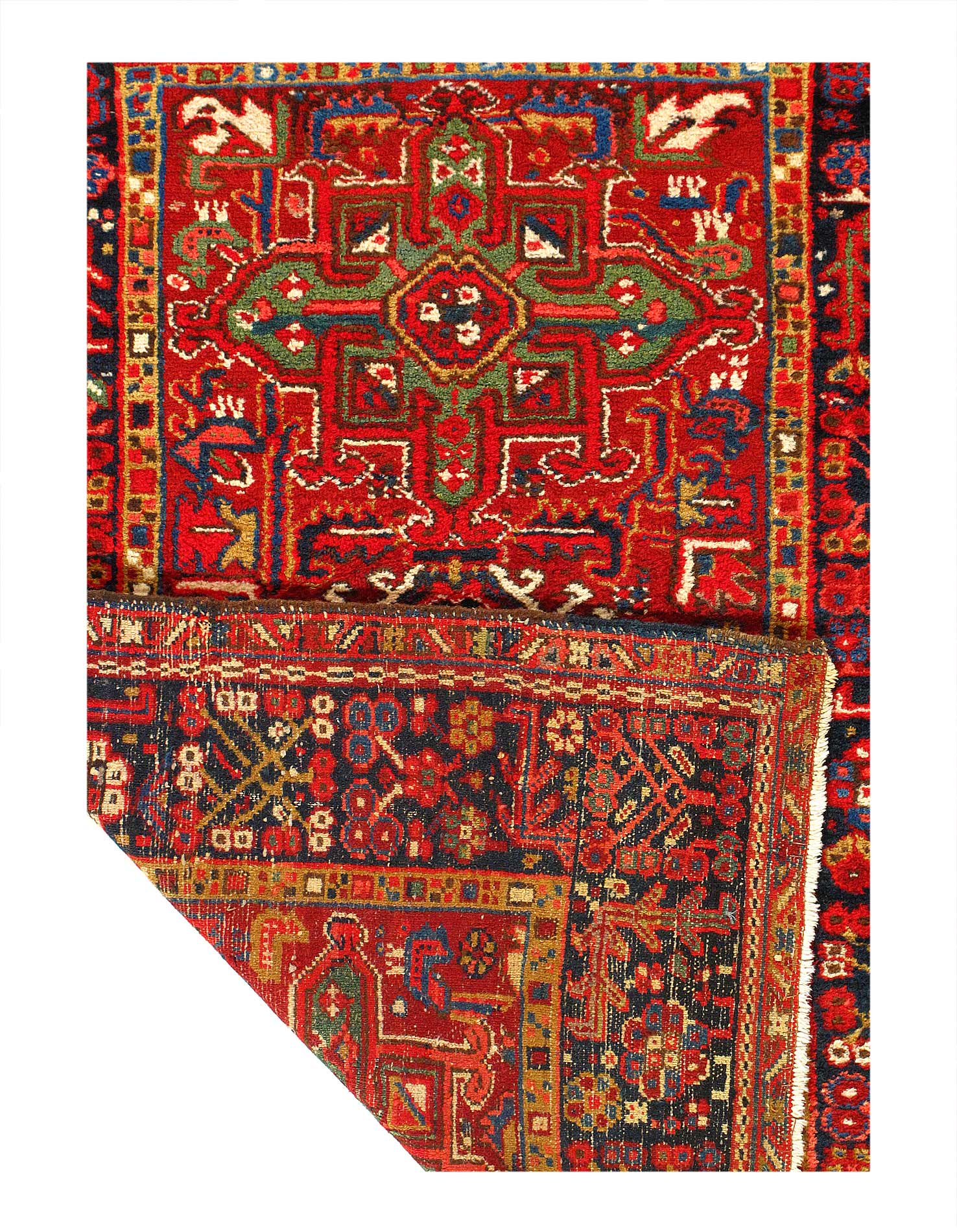 Established with luxurious jewel tones, this antique Karaje rug from Persia is a striking piece. It is engagingly accented with a brilliant white and tangerine tone, which play off of the cool-toned turquoise and navy elements to create an alluring design. This 1920’s beauty features a generous number of floral borders that seamlessly draw the eye to the center of the work. Its overall theme can be described as tribal, with the focal point featuring a diamond surrounded by florets of varying sizes and shapes, set in a field of deep navy.