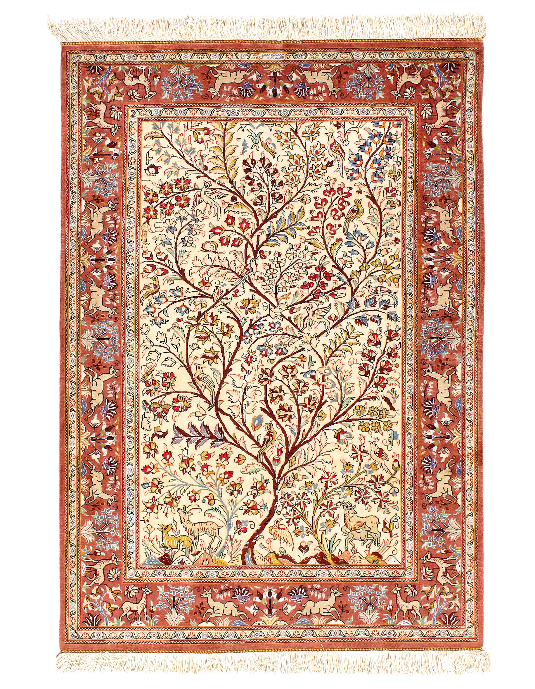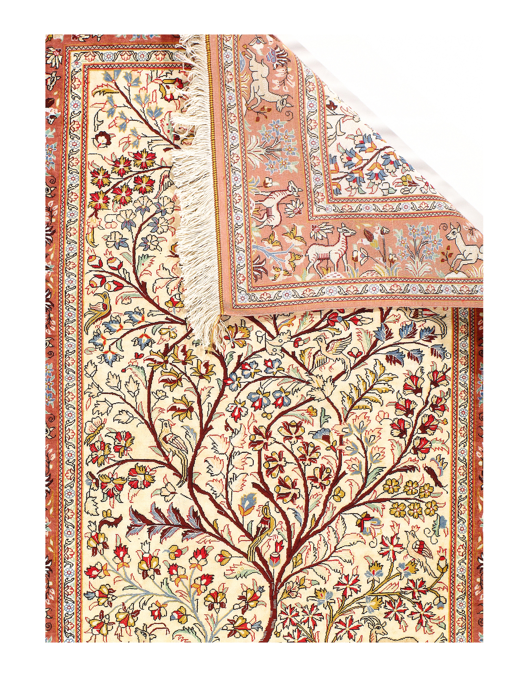 This handmade, hand-knotted of pure silk on a silk foundation. Vegetable dyed. This rug has a dense, soft pile, and excellent quality, to ensure that you will enjoy the look and feel of your rug for years to come.