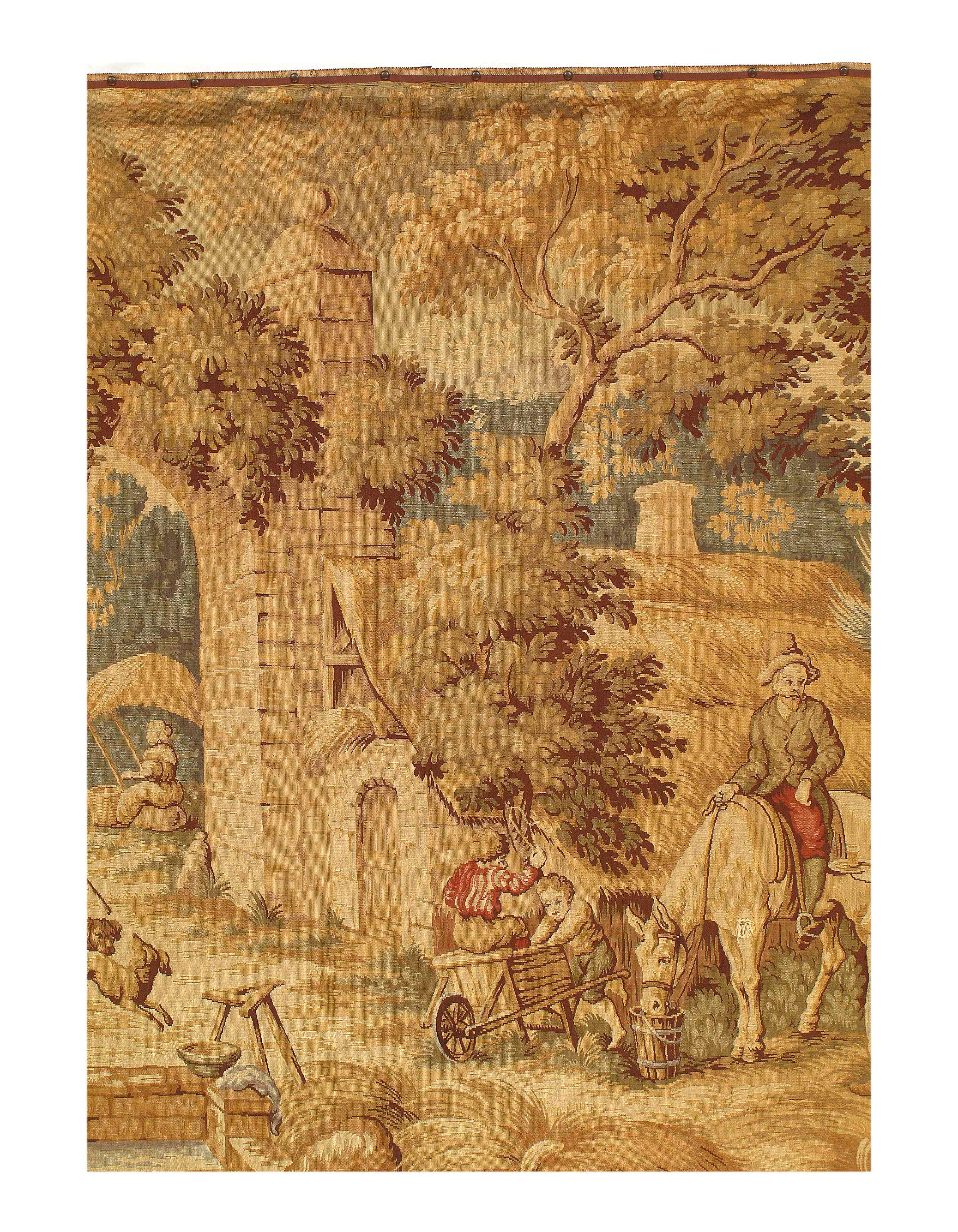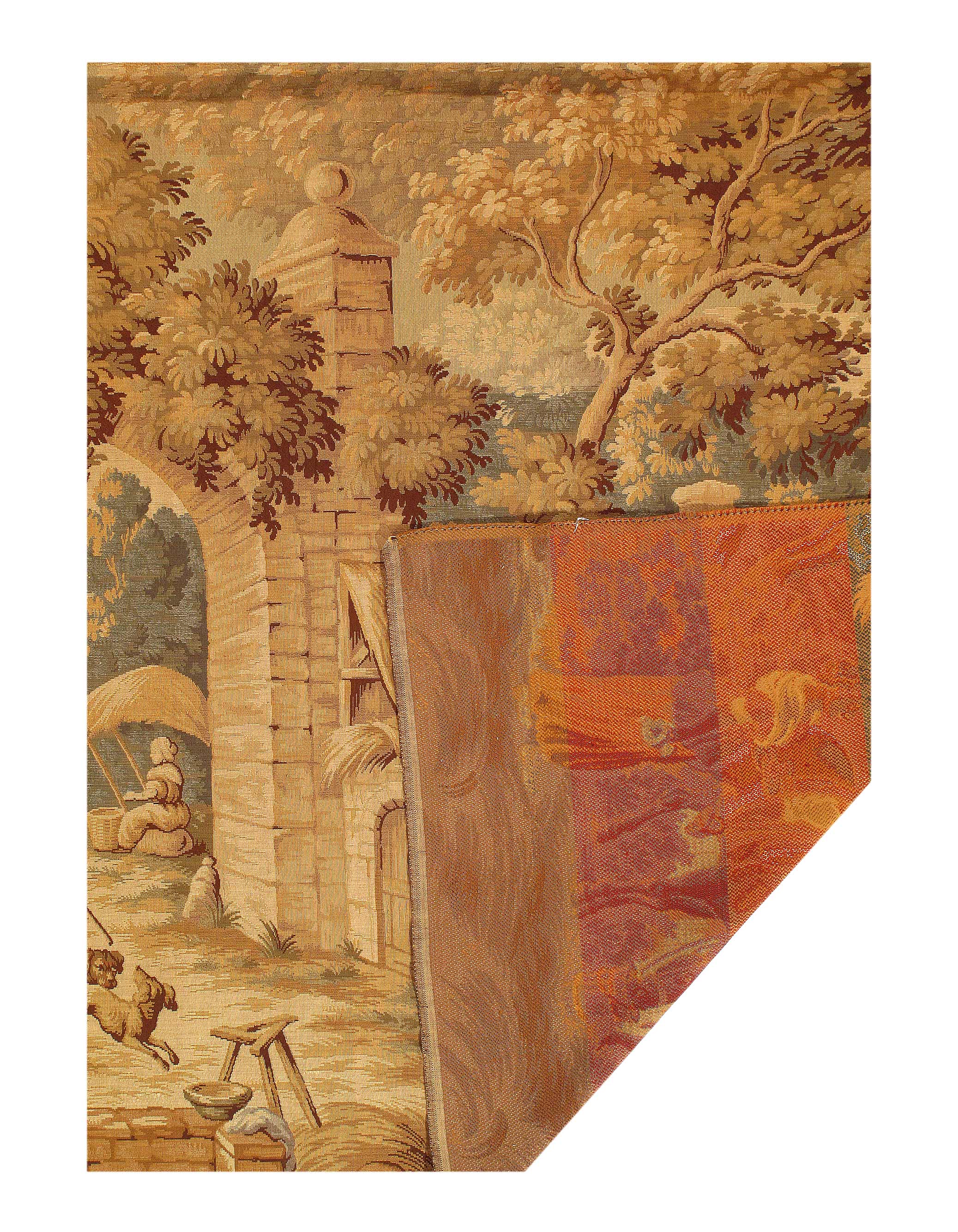 French Tapestry, France – Here is a truly wonderful rug – a tapestry made in France. This rug represents something genuinely special, and is a testament to the artisans who produced it. A beautiful piece, this rug possesses many of the qualities most sought after by collectors and experts, and would bring beauty and sophistication to any home. Surrounded by an archetypal floral border, this naturalist tapestry from France features a pastoral forest scene with rocks, plants, grasses, vines and trees extending into the distance. Detailed shading adds depth and dimension to the craggy rocks, textural tree bark and shadowy foliage while the scalloped leaves in the tree canopy evoke a vague oriental influence. Simply put, this rug is a remarkable piece of work. A lovely and elegant design and composition combine to make this rug something more than a decorative piece: they combine to make it a veritable work of art