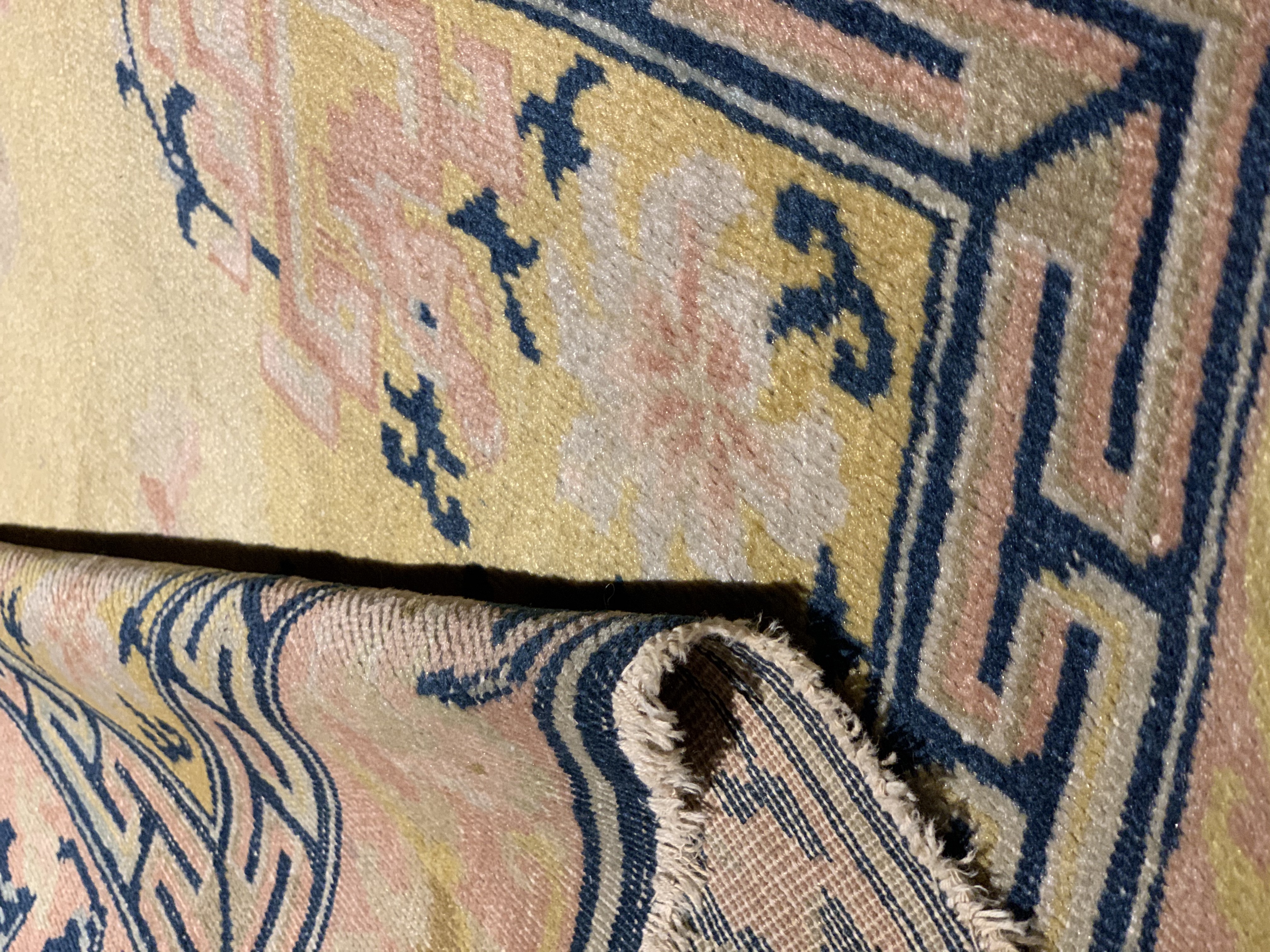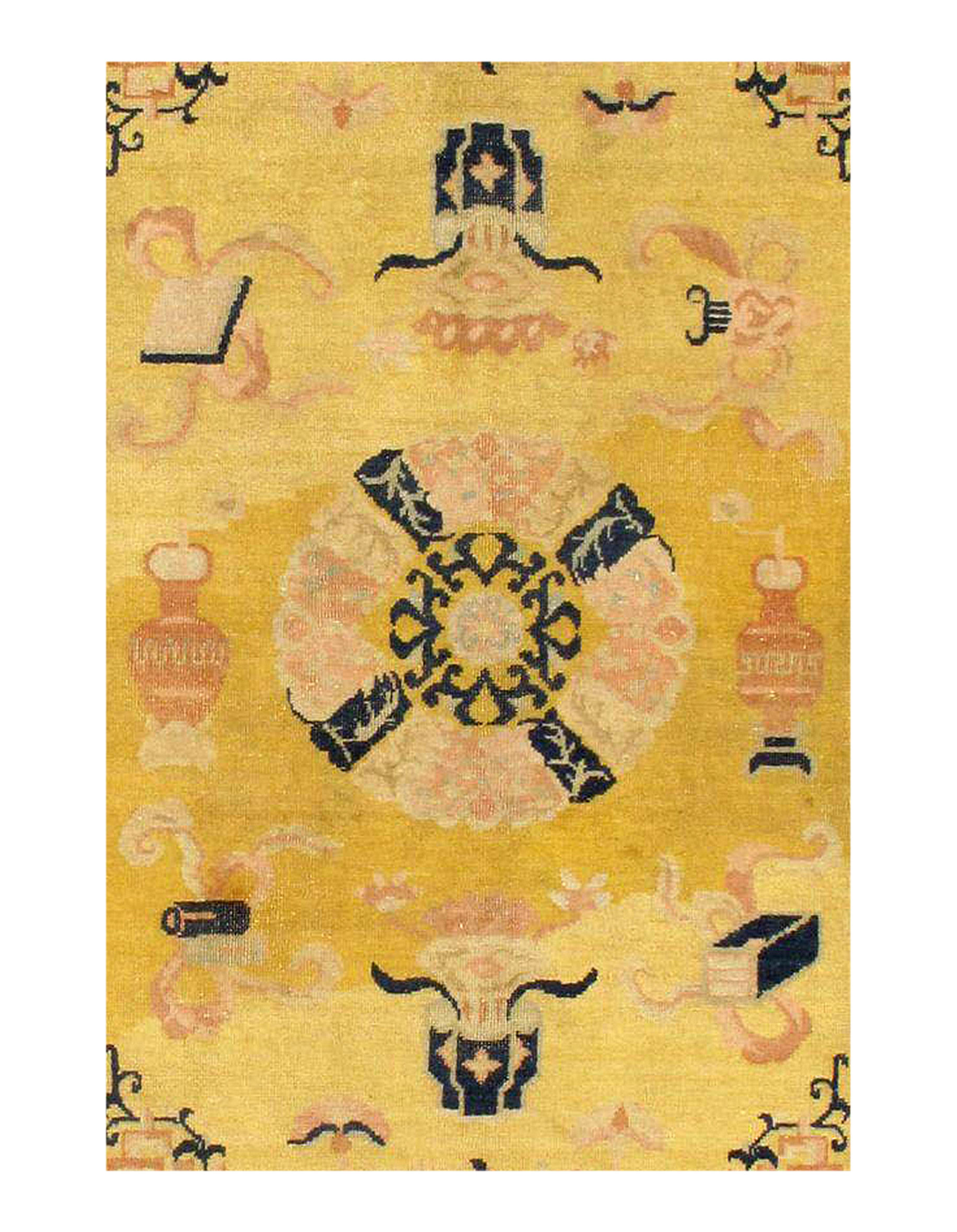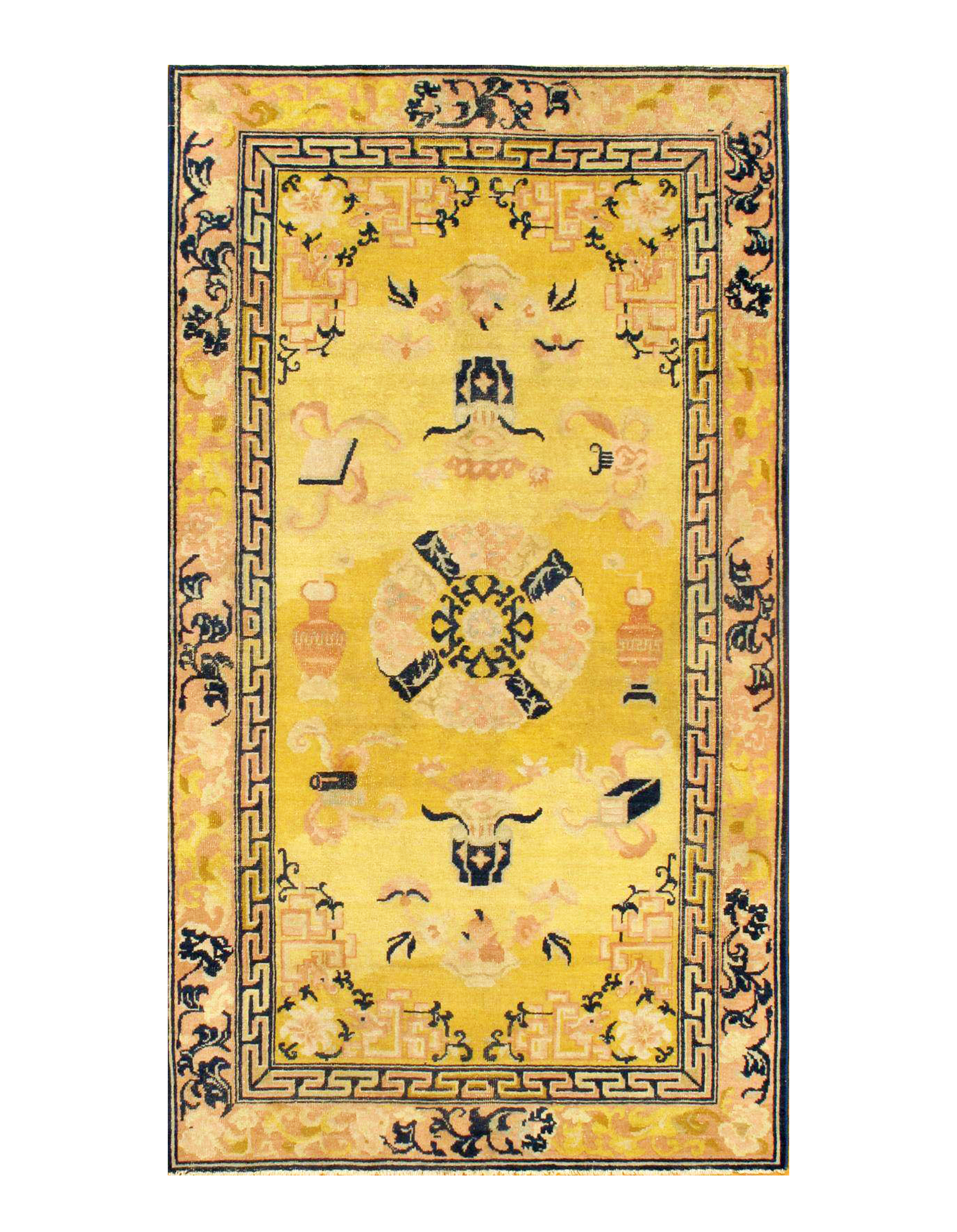 Antique Chinese Peking Rug, This Chinese rug showcases an Eastern composition with a medallion that creates a decorative pattern. The beautifully styled field is emblazoned with ornate auspicious vase motifs, which are one of the most revered symbols for good luck. The traditional combination of gold and Prussian blue captures the natural minimalist style of the Far East.