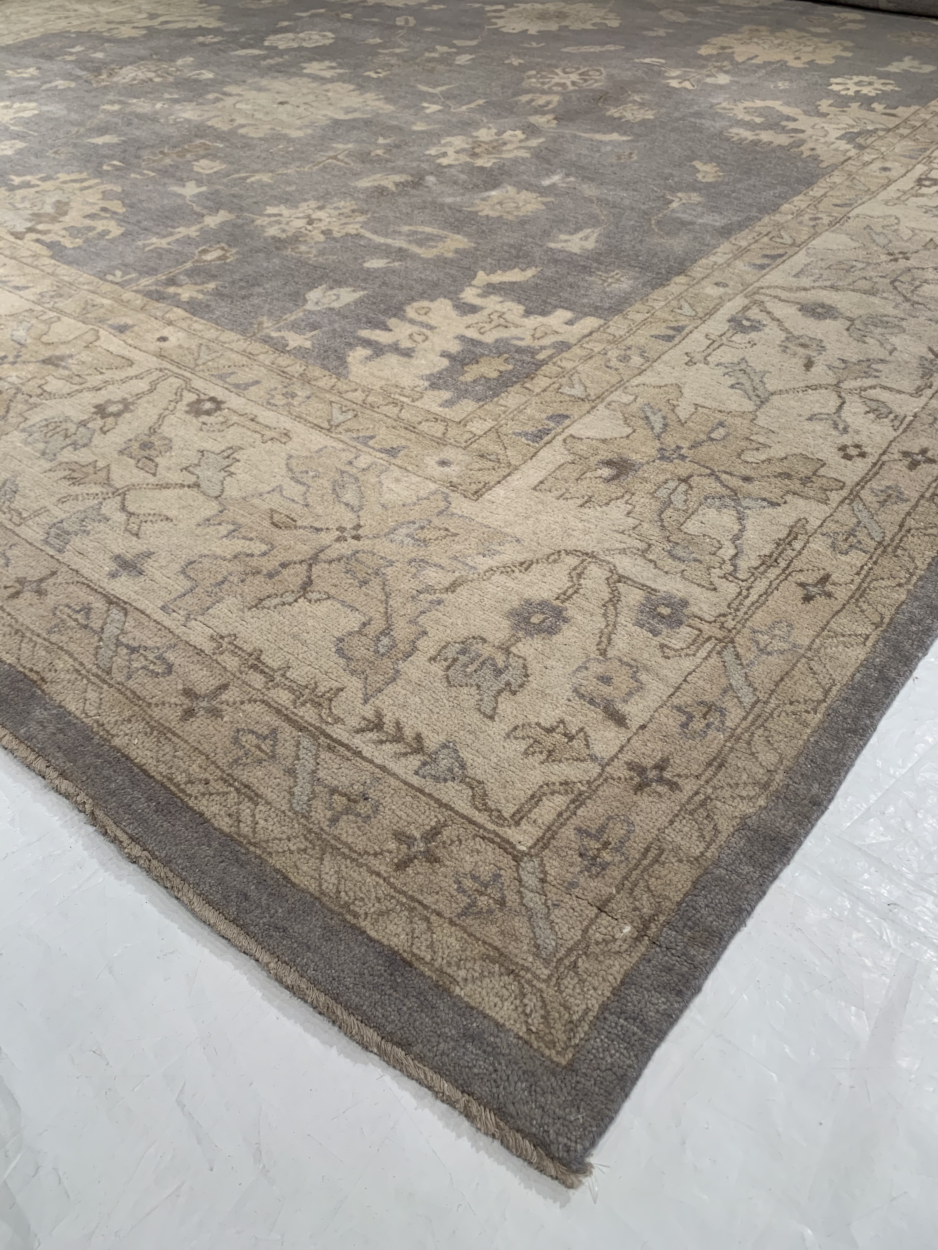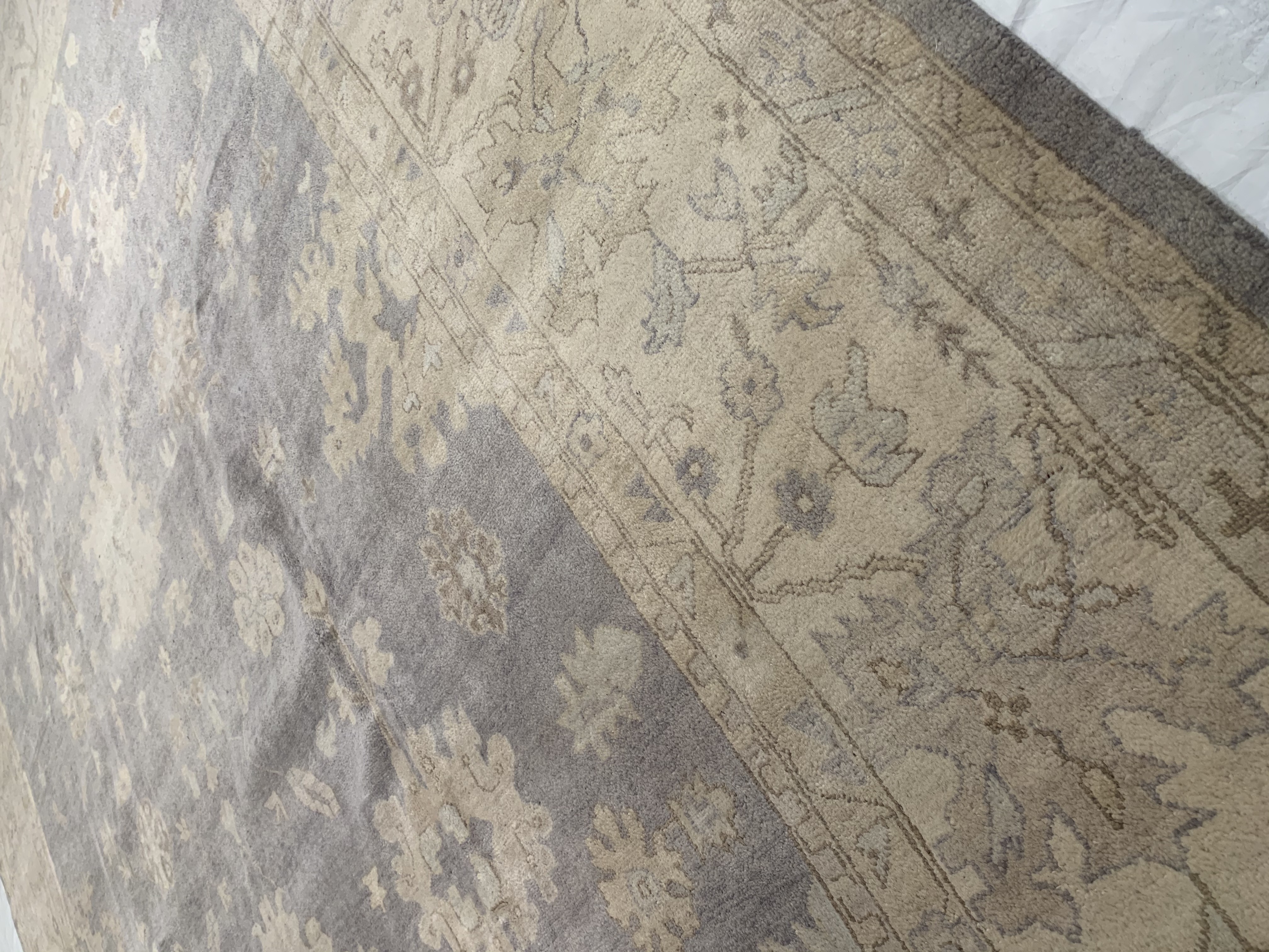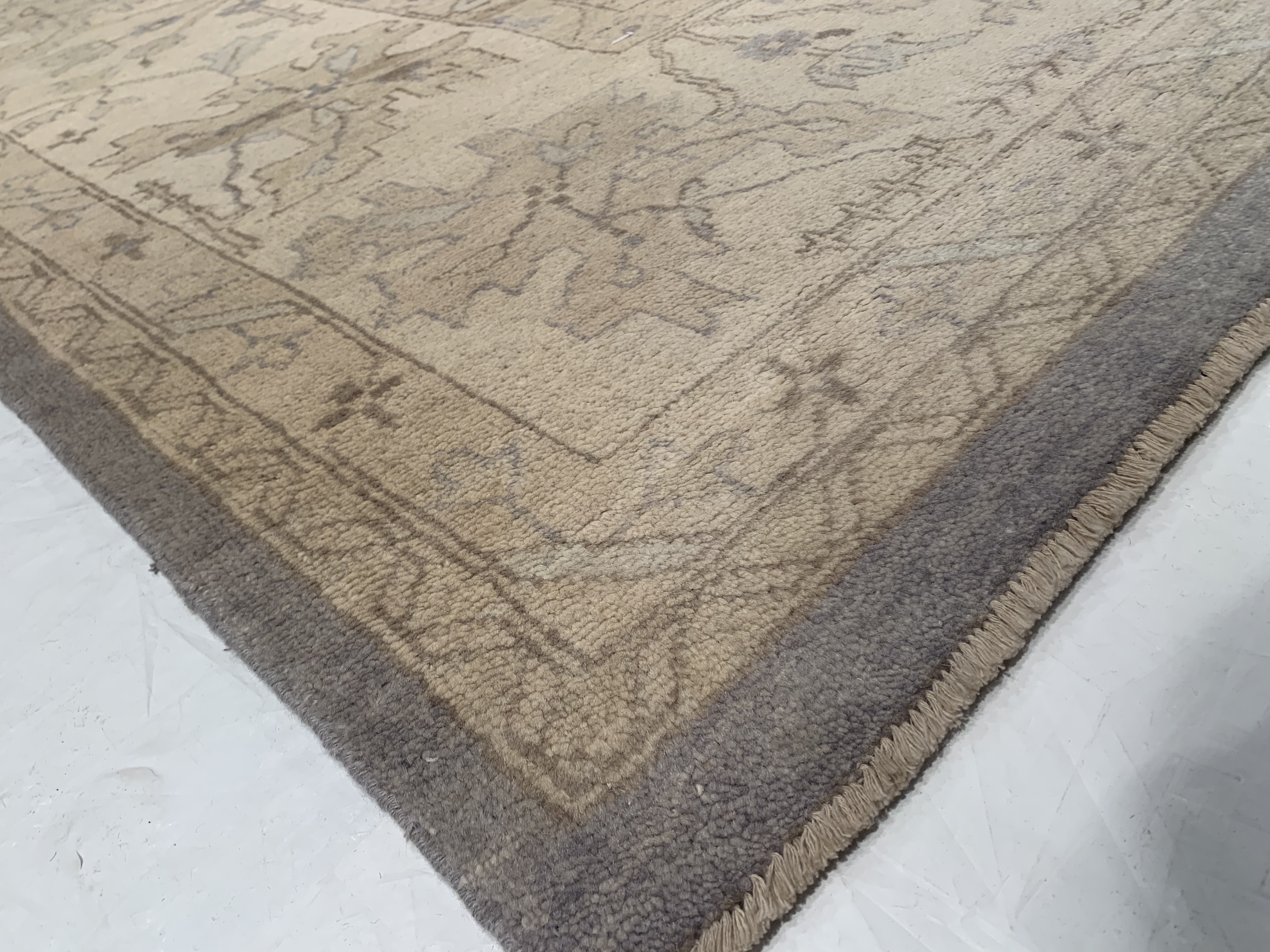Oushak Rugs are distinctive in both pattern and color palette. Most have a blue, green, dark ivory, or gold & their designs are typically based on geometric motifs and vine / leave motifs. All colors are created with natural vegetable dyes, and the hushed tones are enhanced by the soft, lustrous wool texture. The foundation of an Oushak is cotton while the pile is wool. Oushak rugs are also double-knotted for durability.