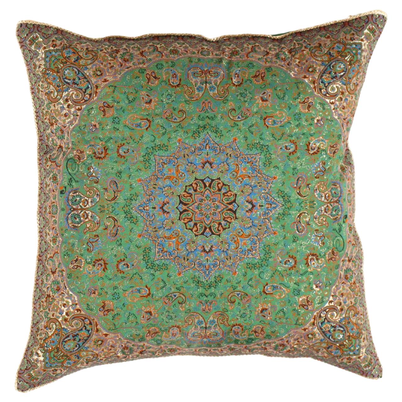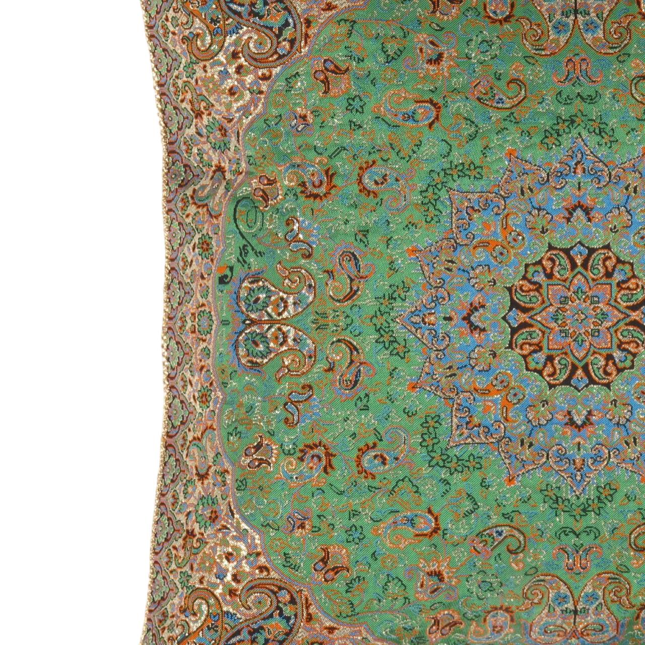 Beautiful reproduce Very Rare Termeh ( Silk Made Material With Design ) With hand made . 700 hundred years old Persian Zoroastrian art only produced in the city of Yazd and demonstrates the glorious ancient Persian empire bright culture, These truly peaces of arts represents the special designs workmanship on silk waving materials and exquisite handwork on placing Green and Ivory threads, A fine Decorative objects to be placed on tables, Furniture or Framed as art decor for your walls or a FANTASTIC GIFT SIZE: 20'' X 20''