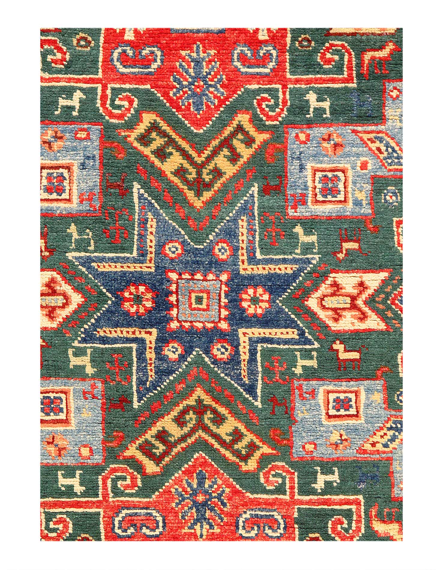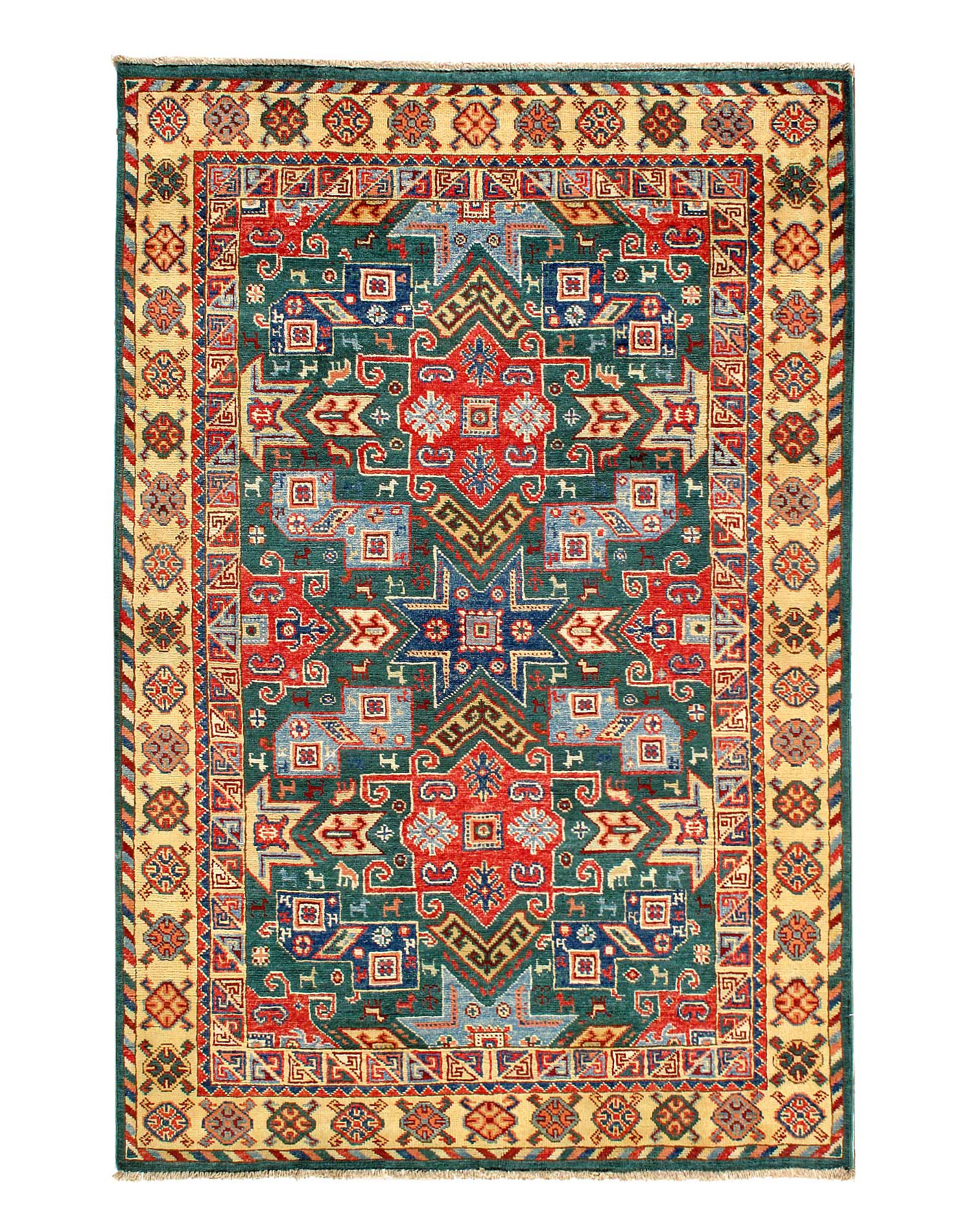 Kazak is a modern shape of old Caucasian rugs which strictly adheres to traditional design elements of the Caucasus. It has elements such as the stepped hooked polygons, geometrical medallions and rosettes, presented in more stylized manner and with a new dimension. Natural dyes produce soft luminous shades and abrashes causing a beautiful sheen. Handspun wool yarn is normally used in the variety of vibrant warm colors. Kazaks rugs in our collection are all fine quality pieces from Pakistan made with Ghazni handspun wool and natural dyes.