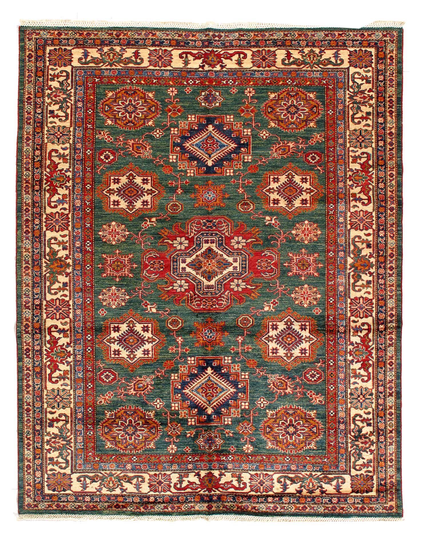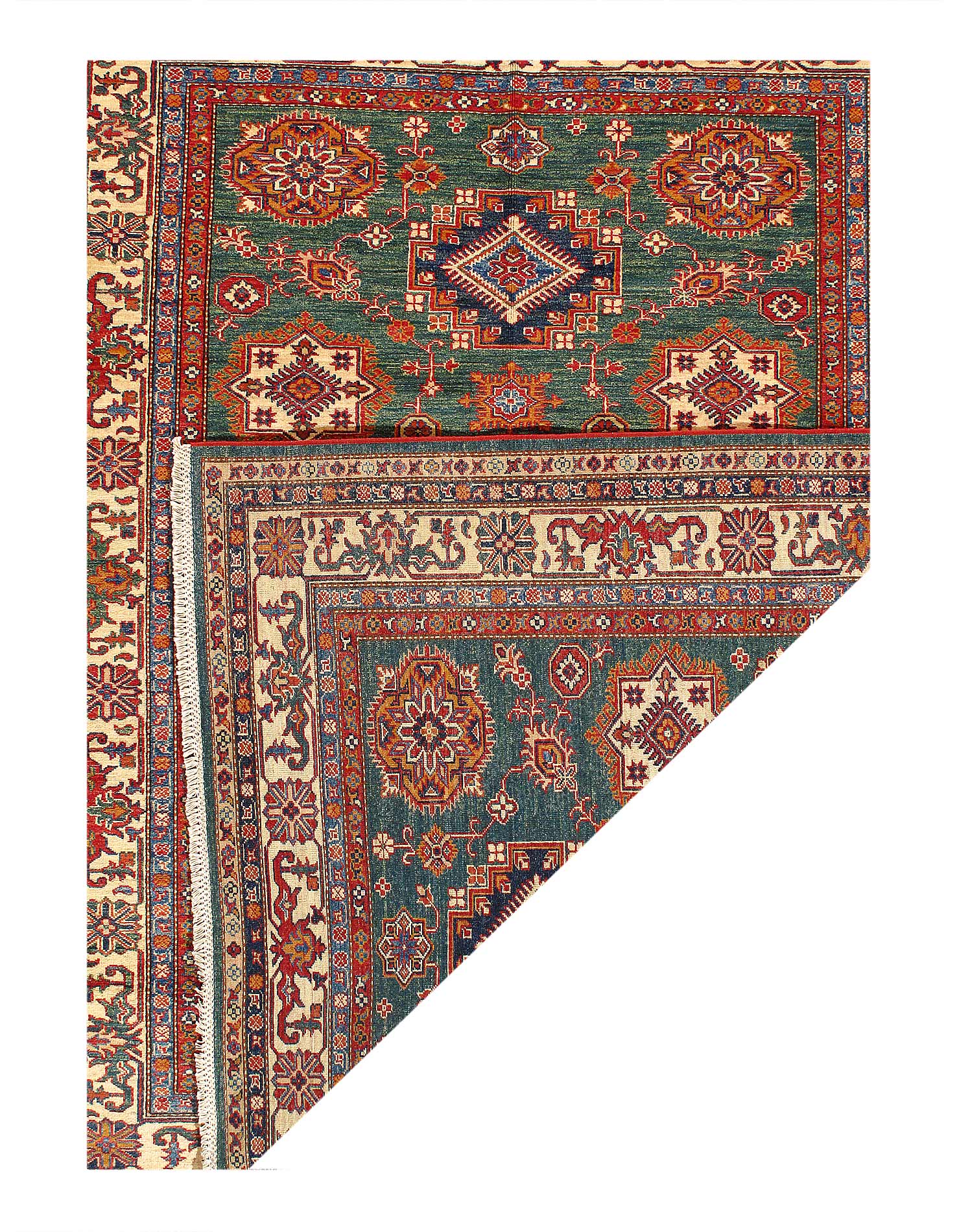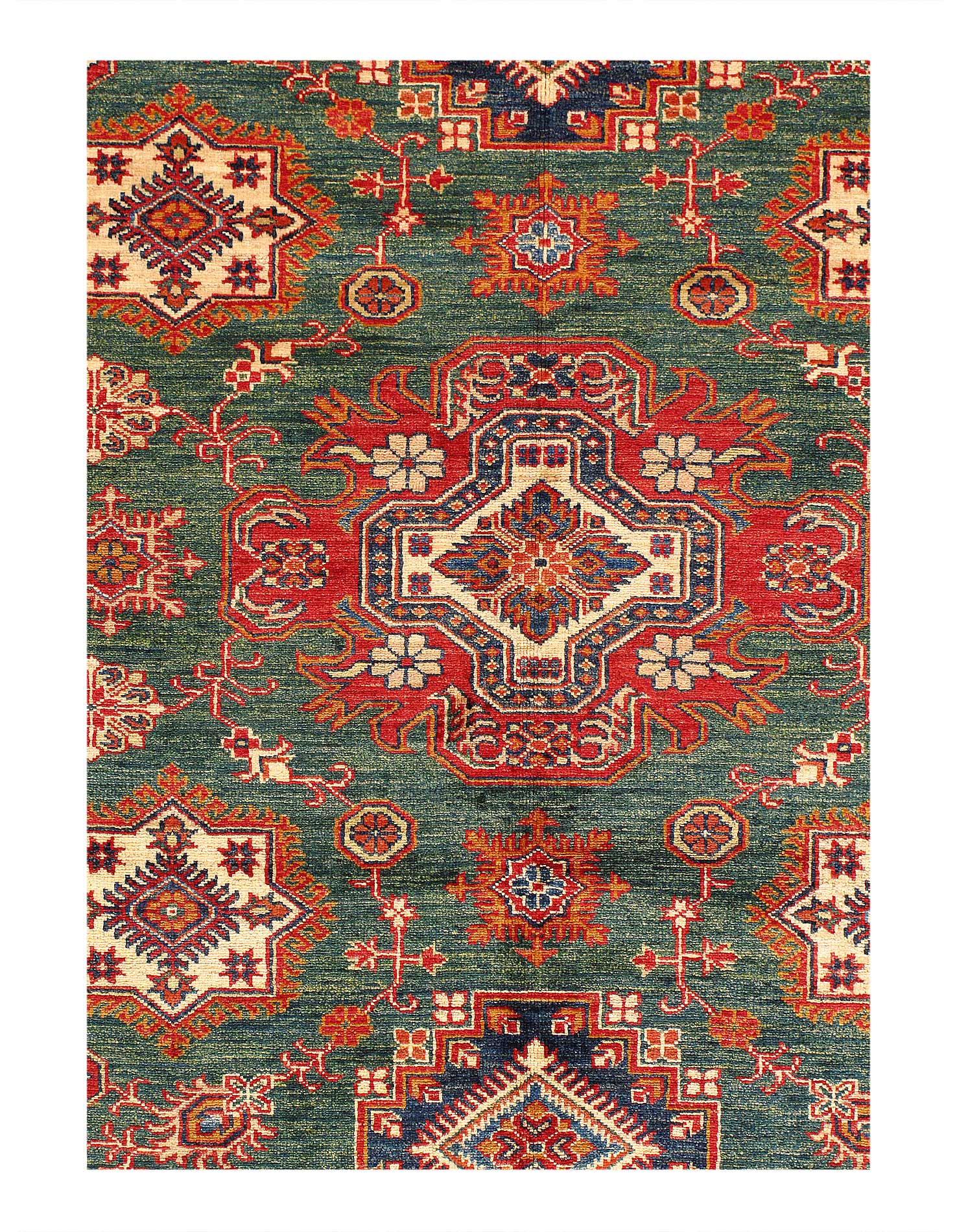 Kazak is a modern shape of old Caucasian rugs which strictly adheres to traditional design elements of the Caucasus. It has elements such as the stepped hooked polygons, geometrical medallions and rosettes, presented in more stylized manner and with a new dimension. Natural dyes produce soft luminous shades and abrashes causing a beautiful sheen. Handspun wool yarn is normally used in the variety of vibrant warm colors. Kazaks rugs in our collection are all fine quality pieces from Pakistan made with Ghazni handspun wool and natural dyes.