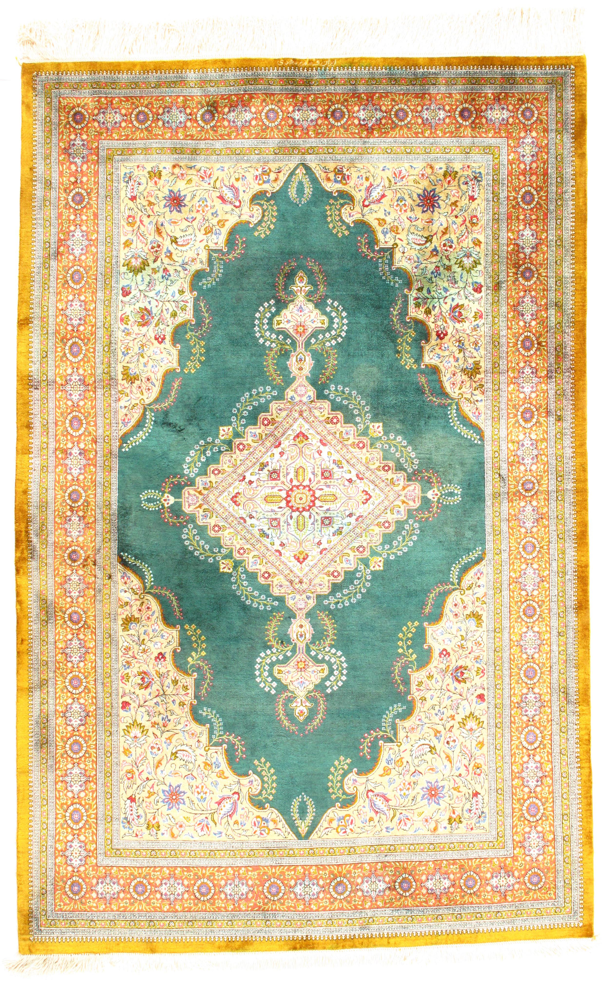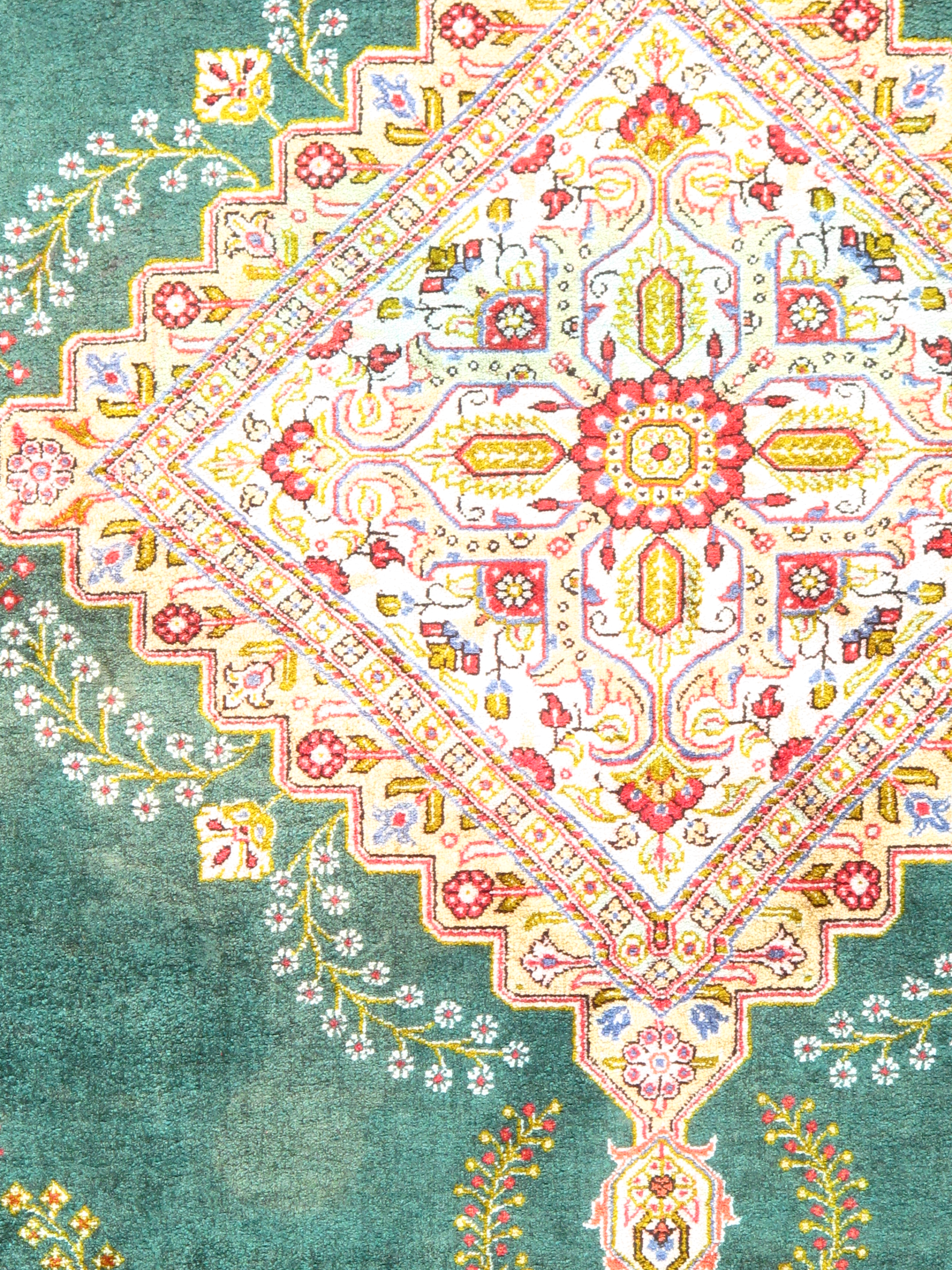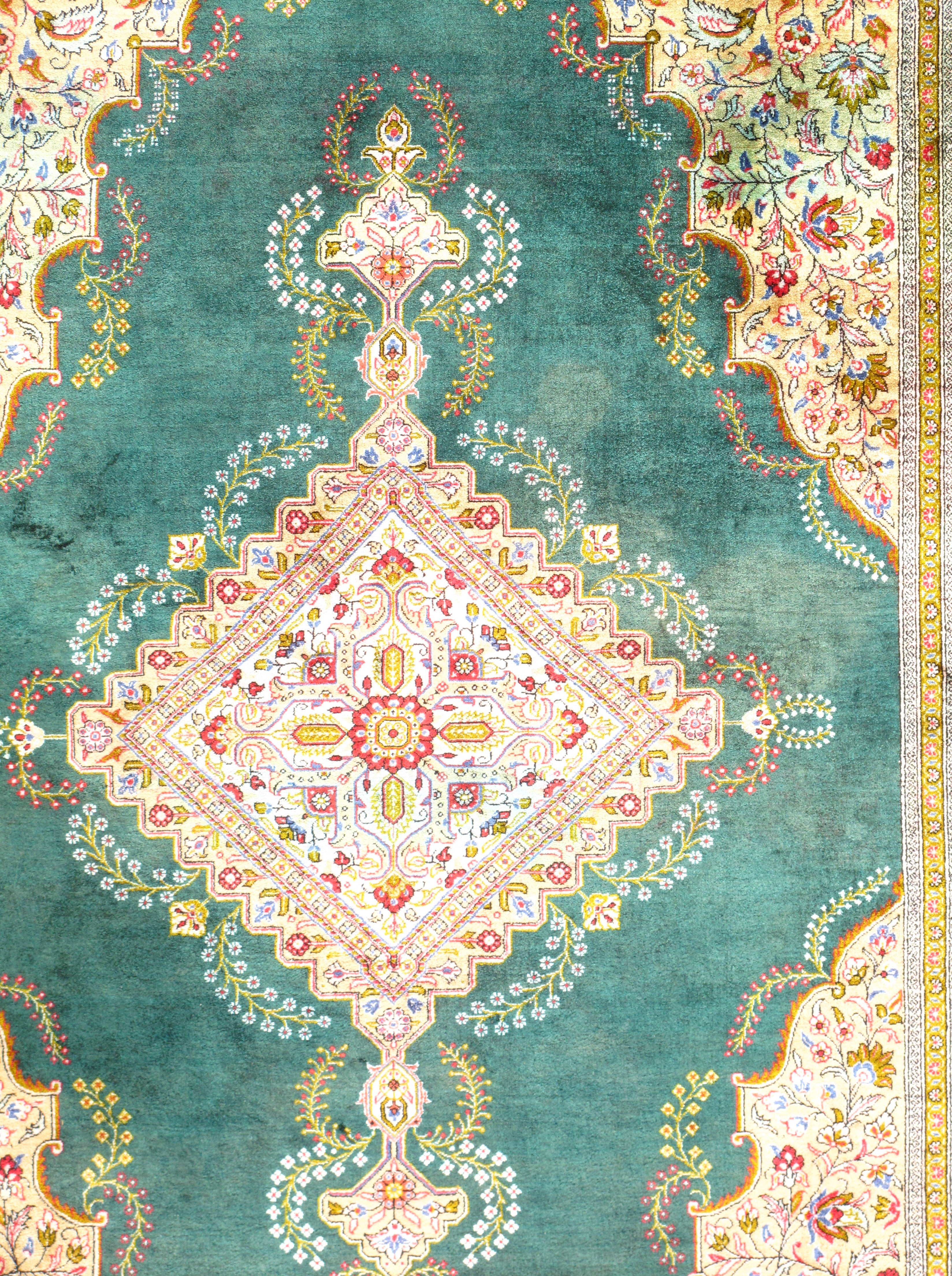 Super fine semi-antique vintage Persian Qum. 100 % pure silk handmade hand knotted in Qum Iran. This rug has a dense, soft pile, and excellent quality, to ensure that you will enjoy the look and feel of your rug for years to come. All rugs are individually inspected before leaving our warehouse. Signed