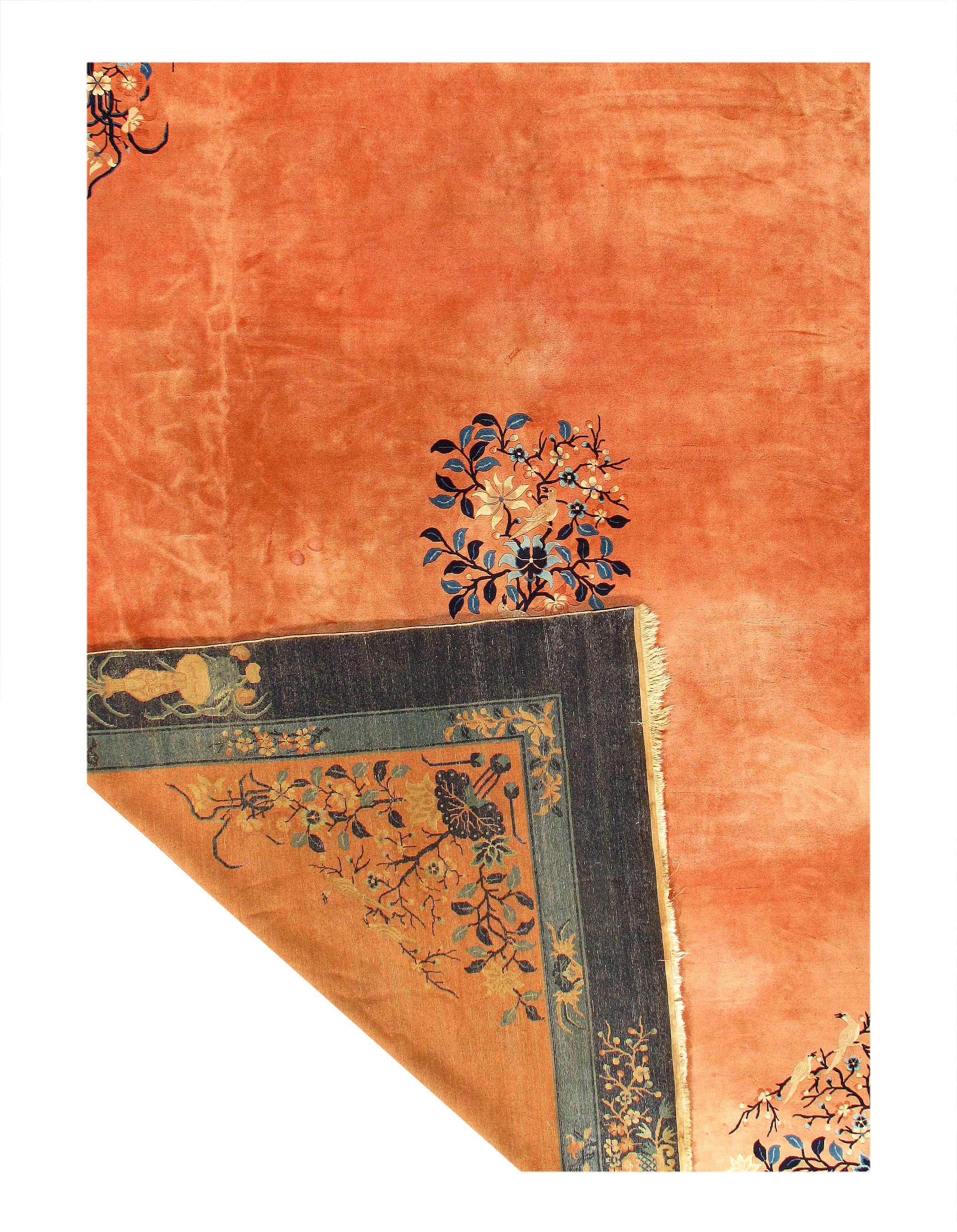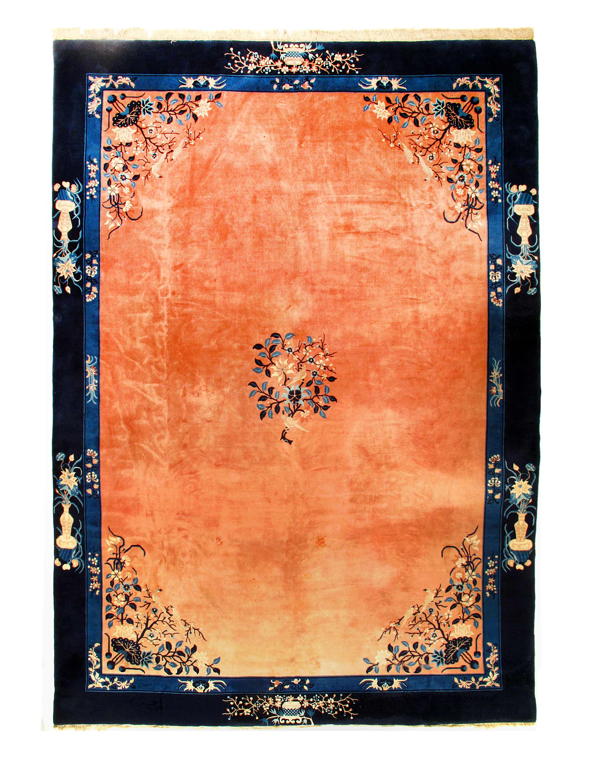 Traditional Chinese rugs and carpets are immediately recognizable by their simple, classic motifs and unusual colors. These rugs often feature a center, circular medallion; familiar objects seen in nature such as animals, flowers, and clouds; stylized Chinese ideographs; and even entire scenes. They're usually framed with a simple, wide border. Chinese rugs are woven with a 5-ply yarn, in contrast with the 2-ply yarns used in Persian rugs and carpets. Many Chinese rugs and carpets are sculpted where contrasting colors meet to provide interest and texture to the simple patterns. These rugs are usually of high quality and extremely durable